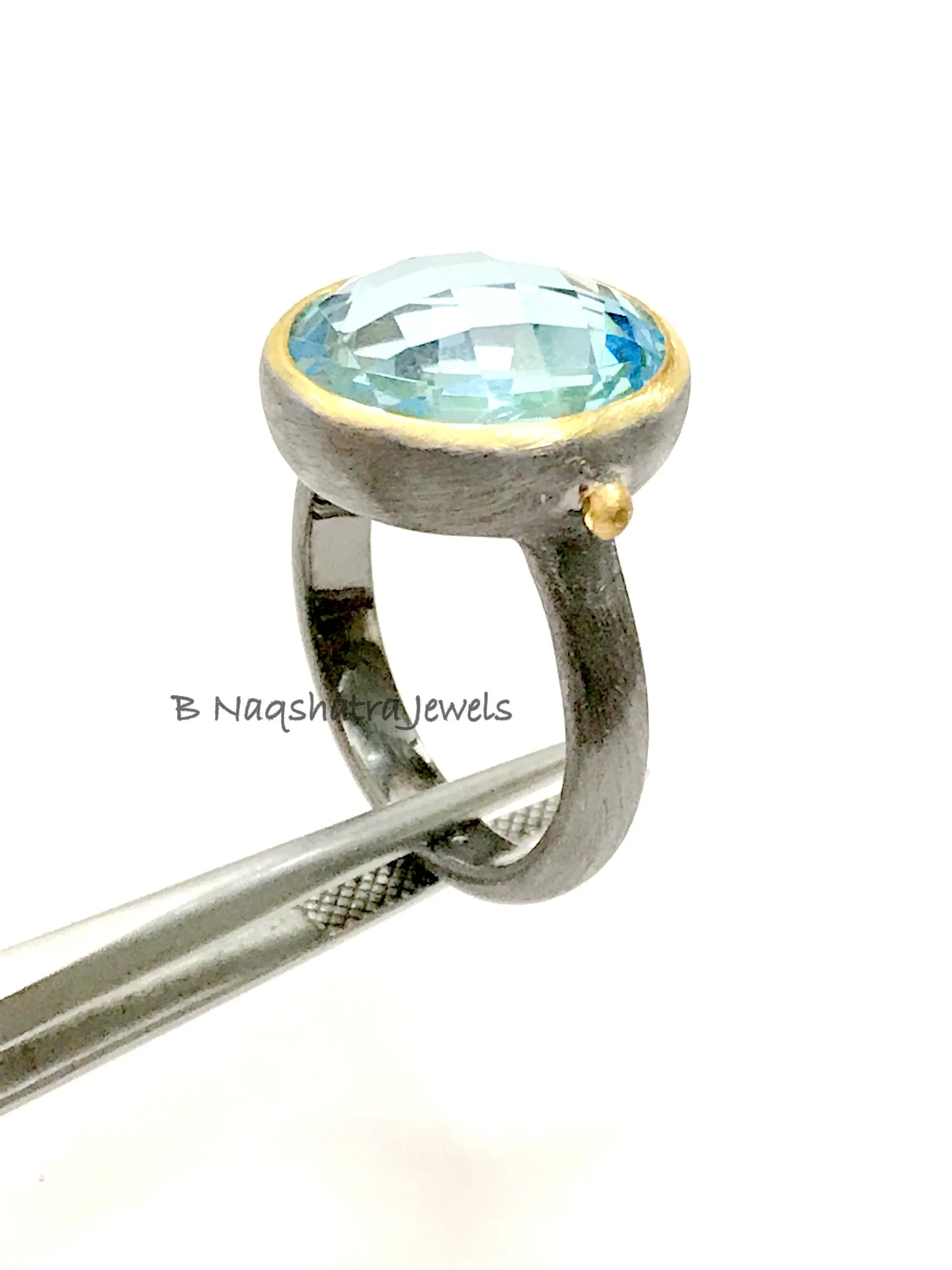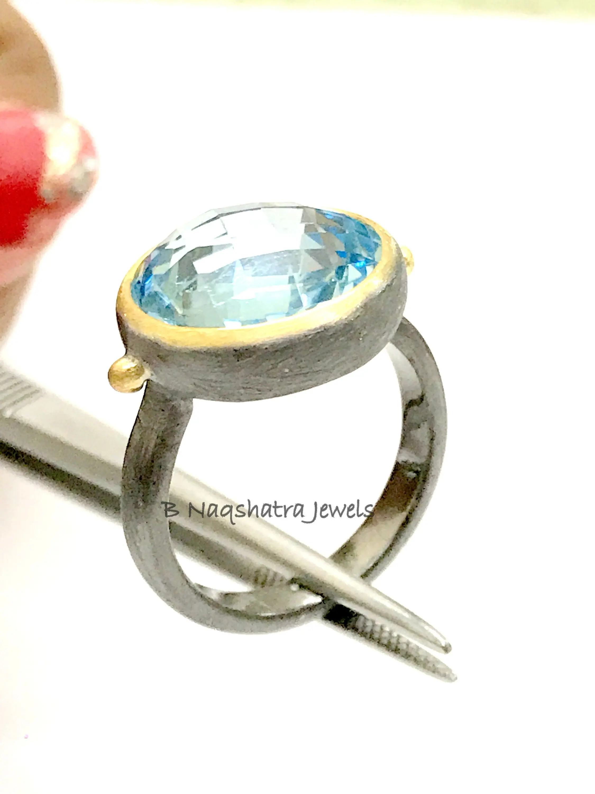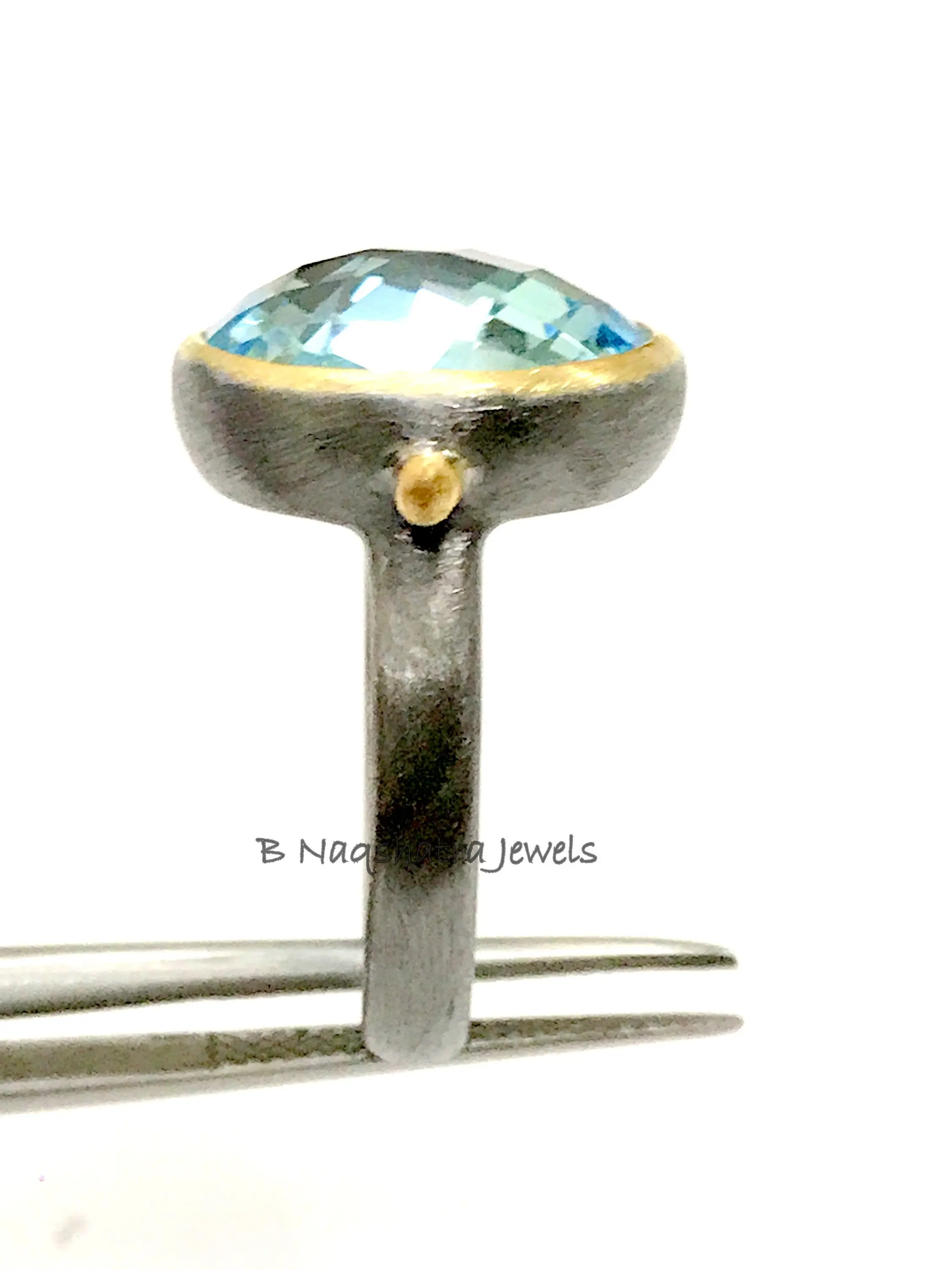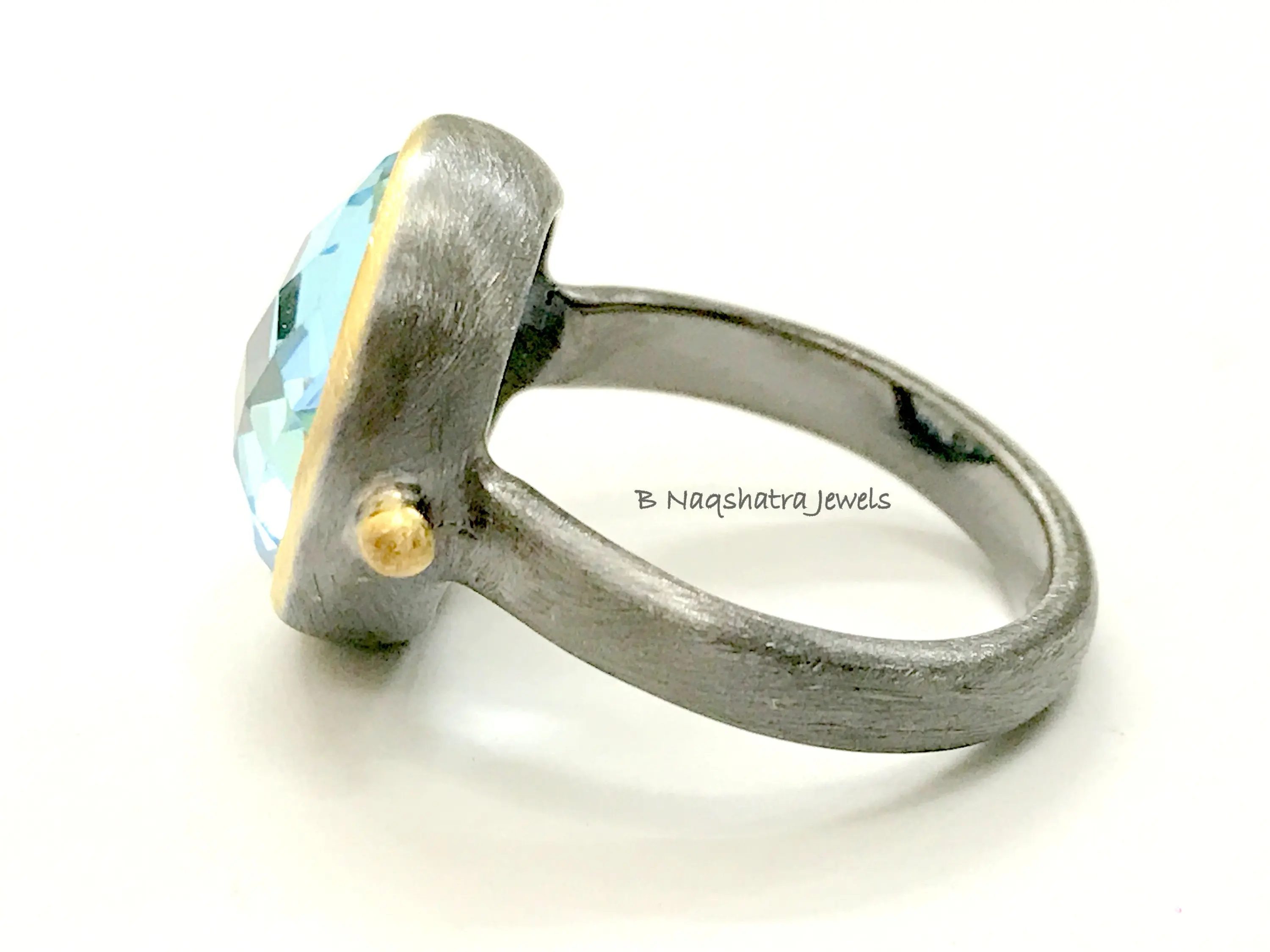 BLUE TOPAZ SILVER Ring ,Matte and Antique Finish Men Ring , Unisex Ring Checkers cut , December Birthstone , Best Valentine gift for loved