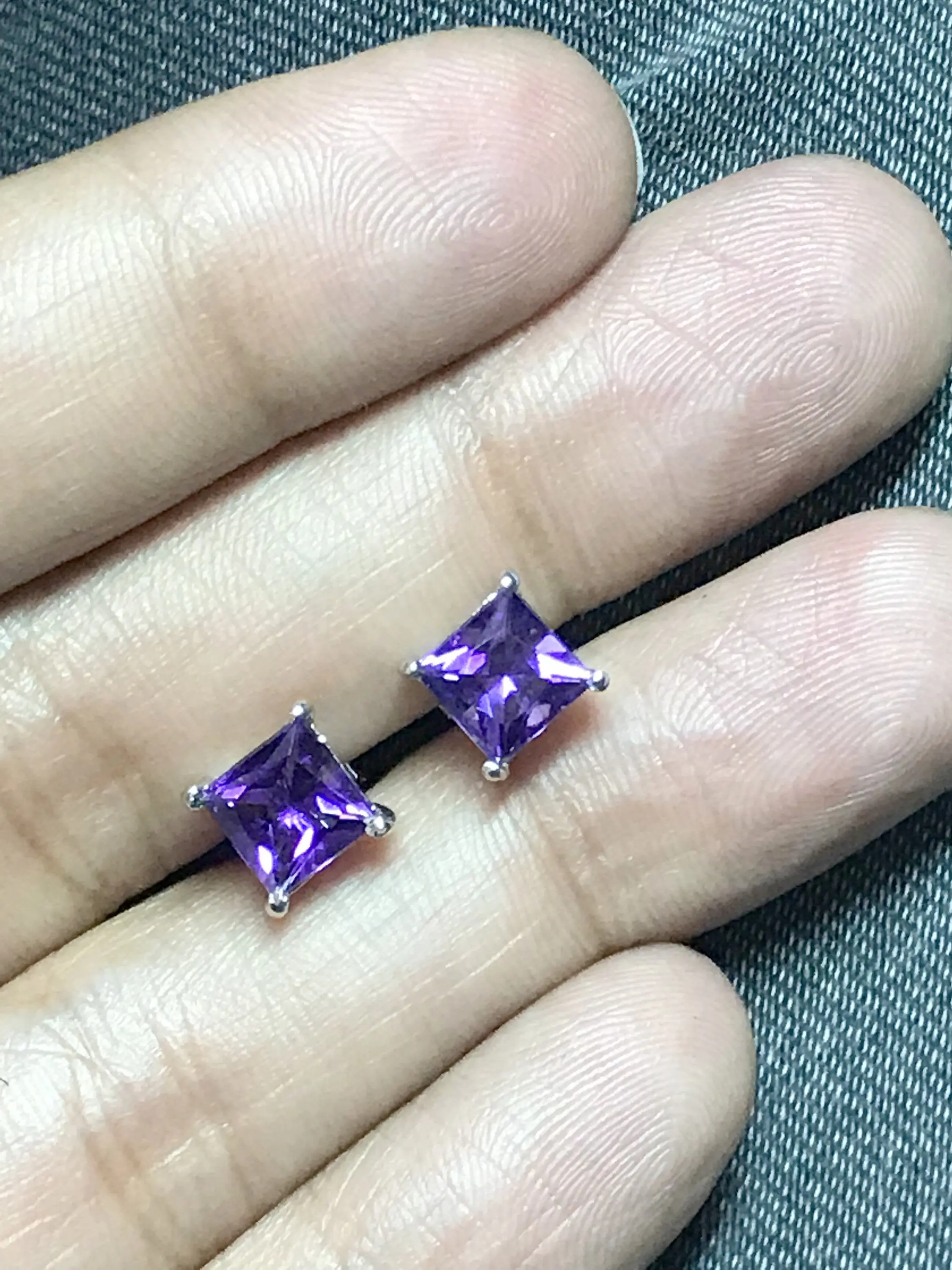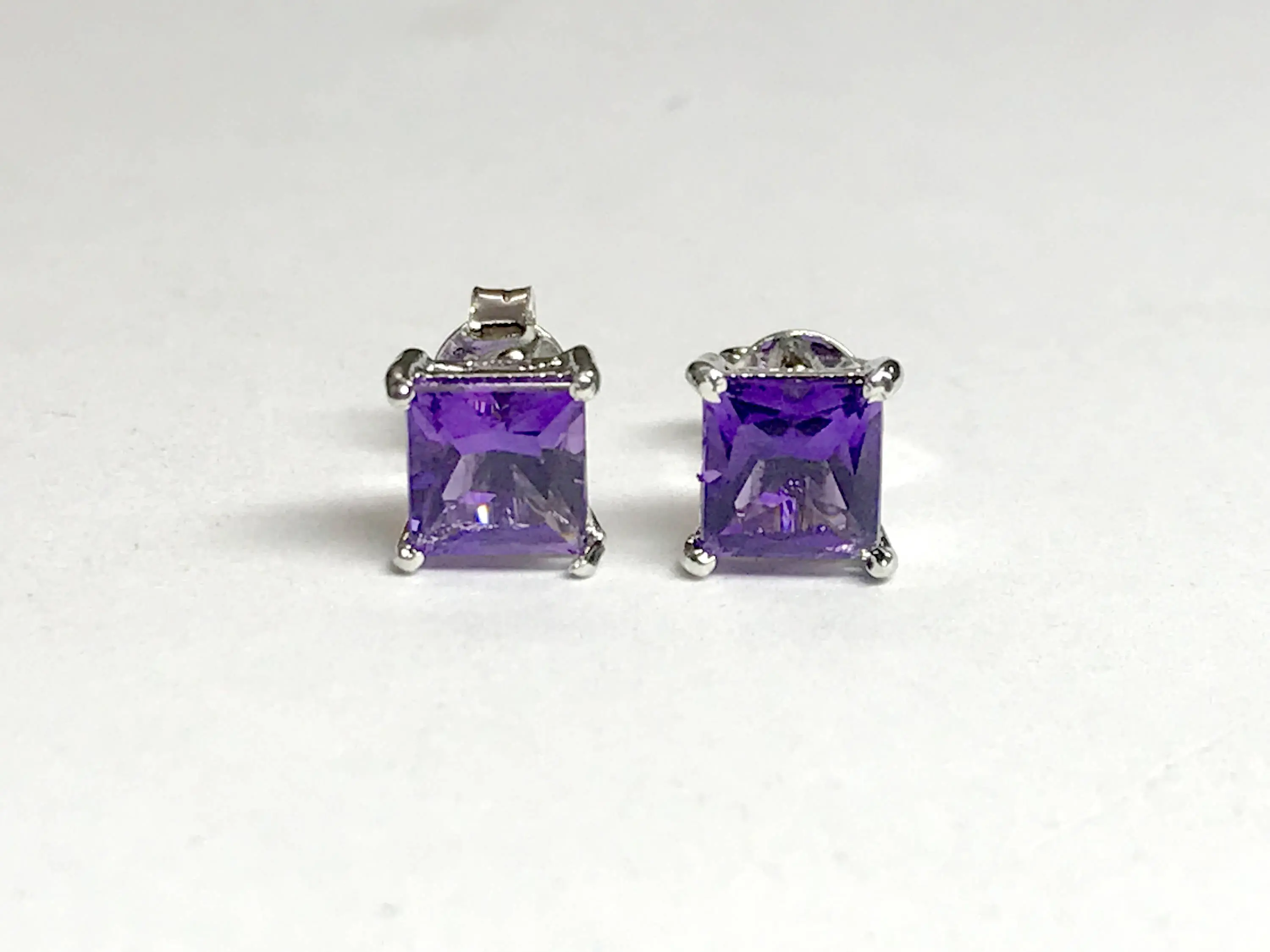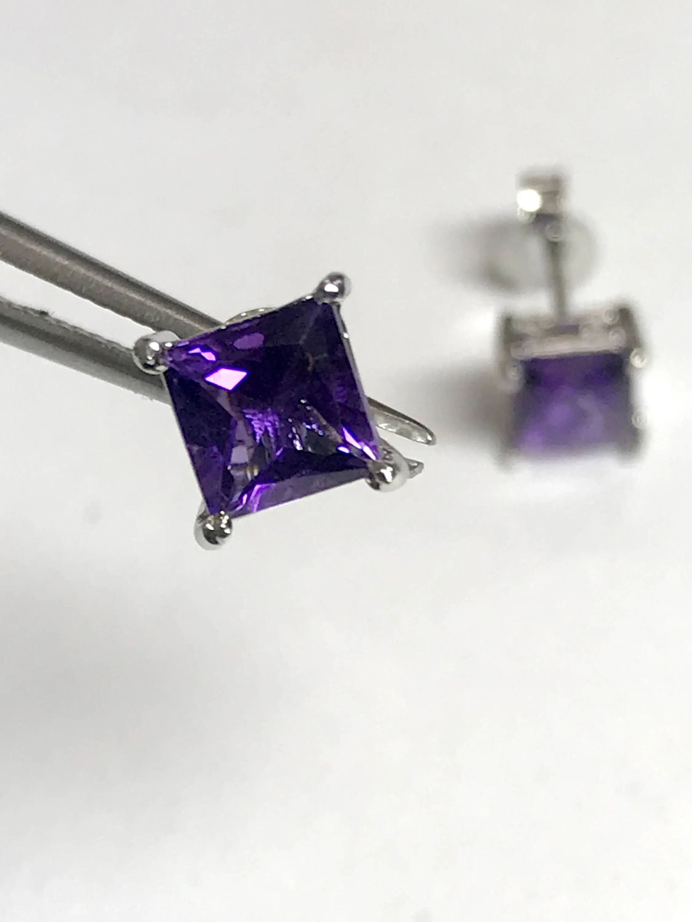100% Natural African Amethyst 6mm square shaped ear studs or tops in 925 sterling silver, Amethyst February birthstone ,prince cut amethyst..