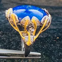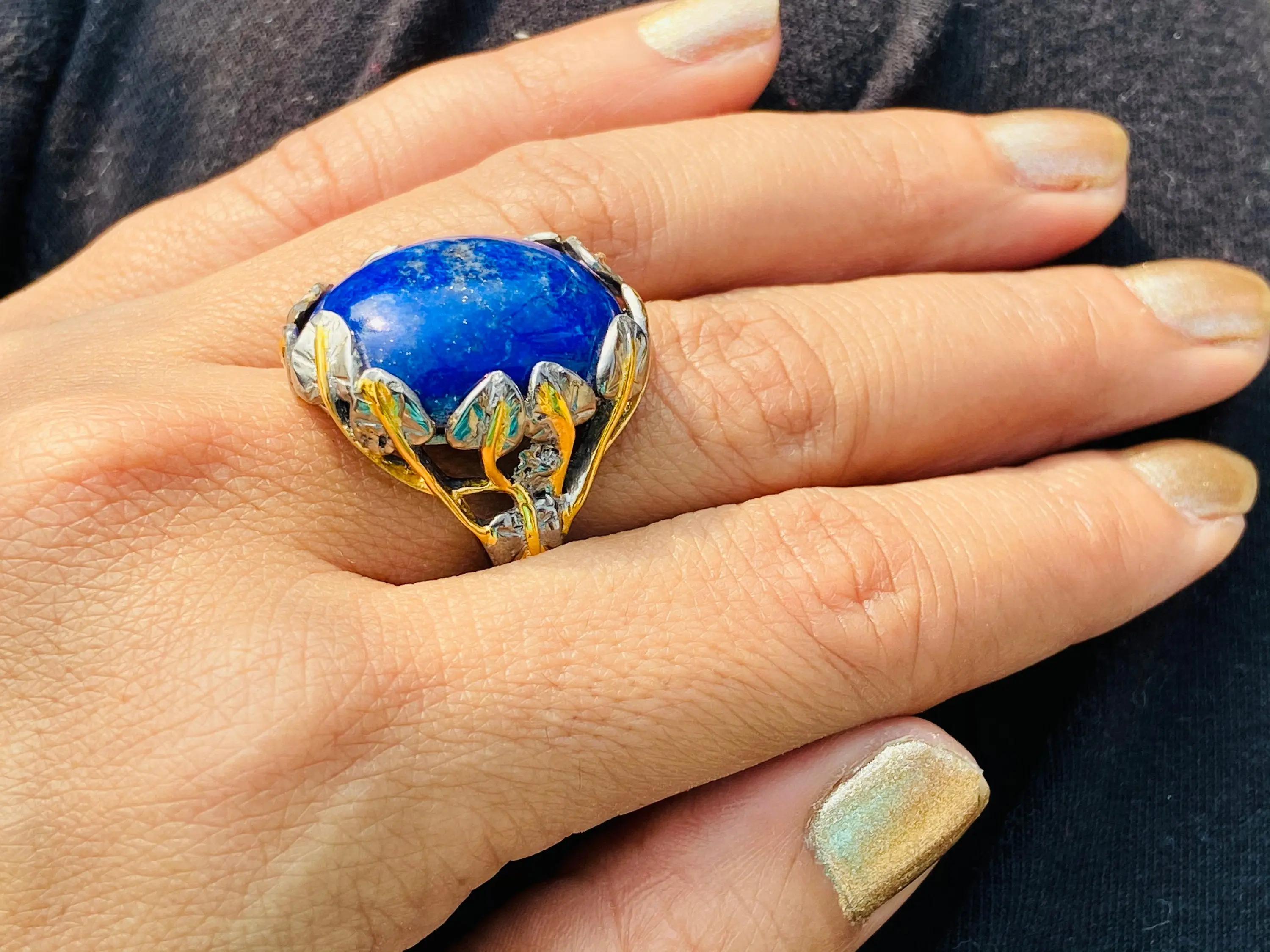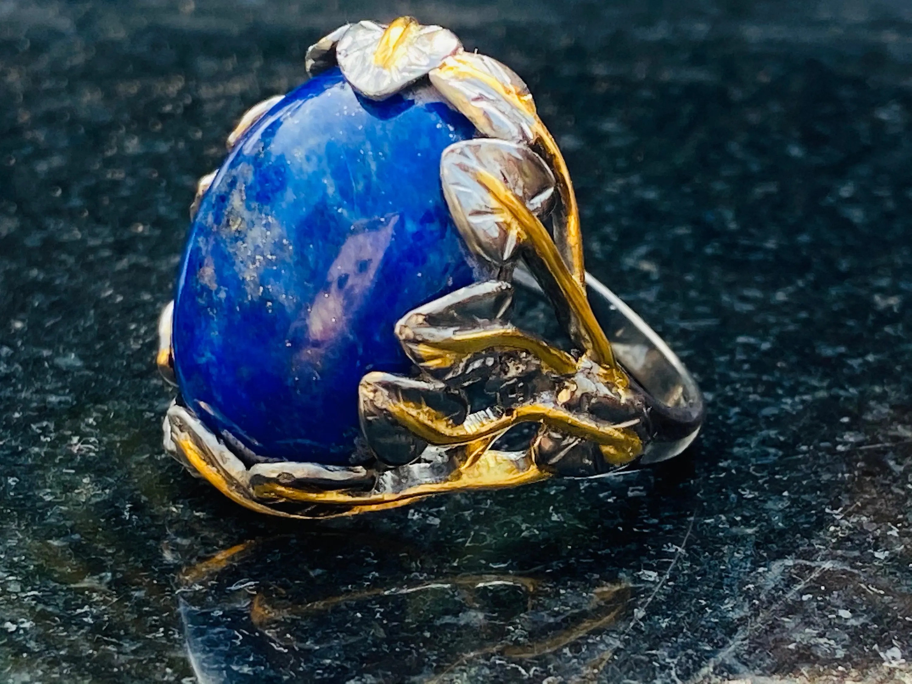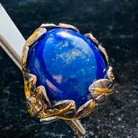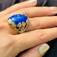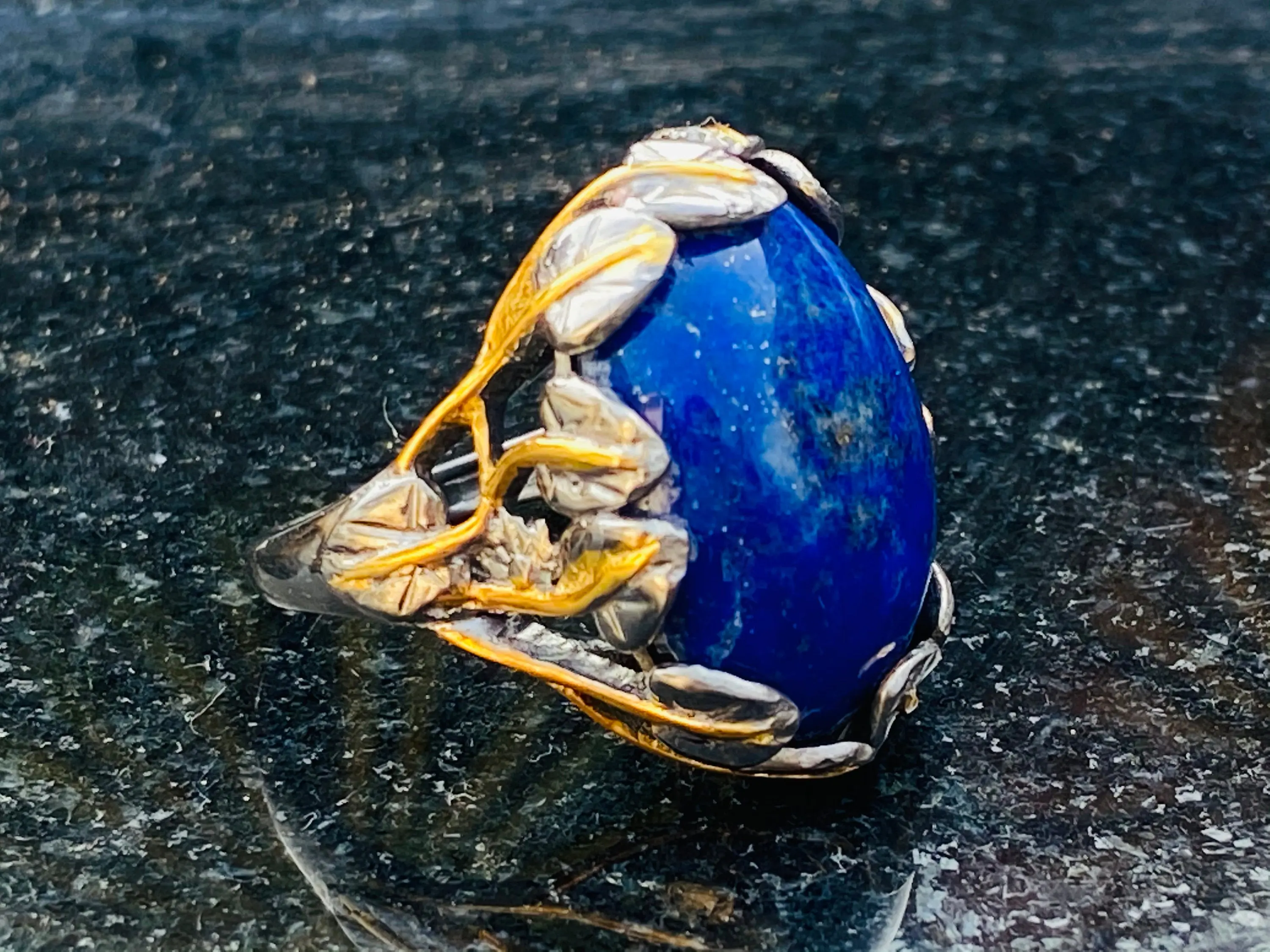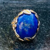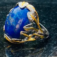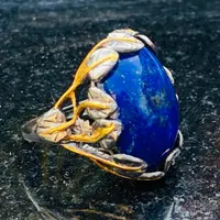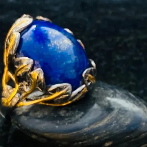 The ring is decorated as Tree of Life holding a large oval blue Lapis stone.
