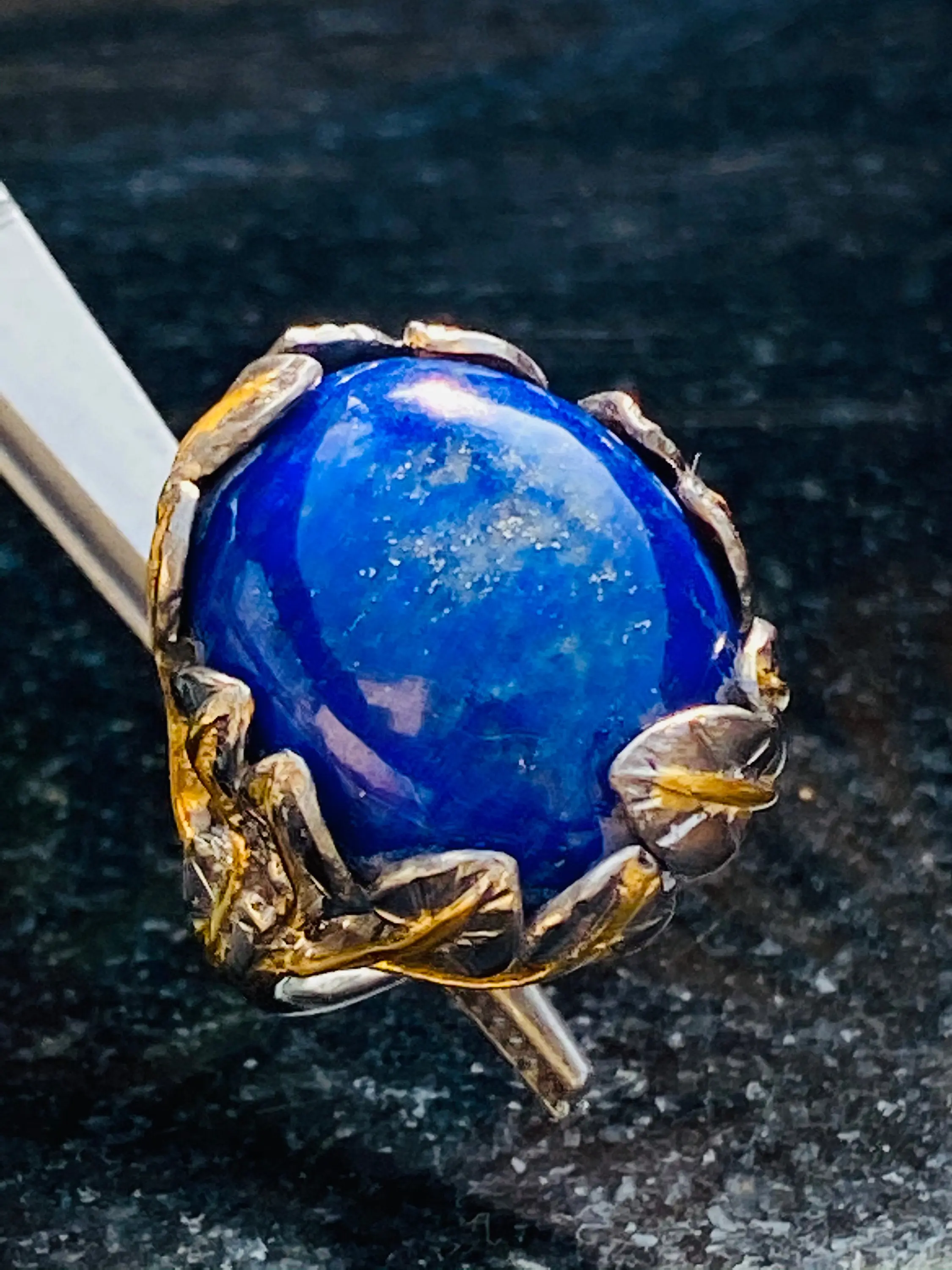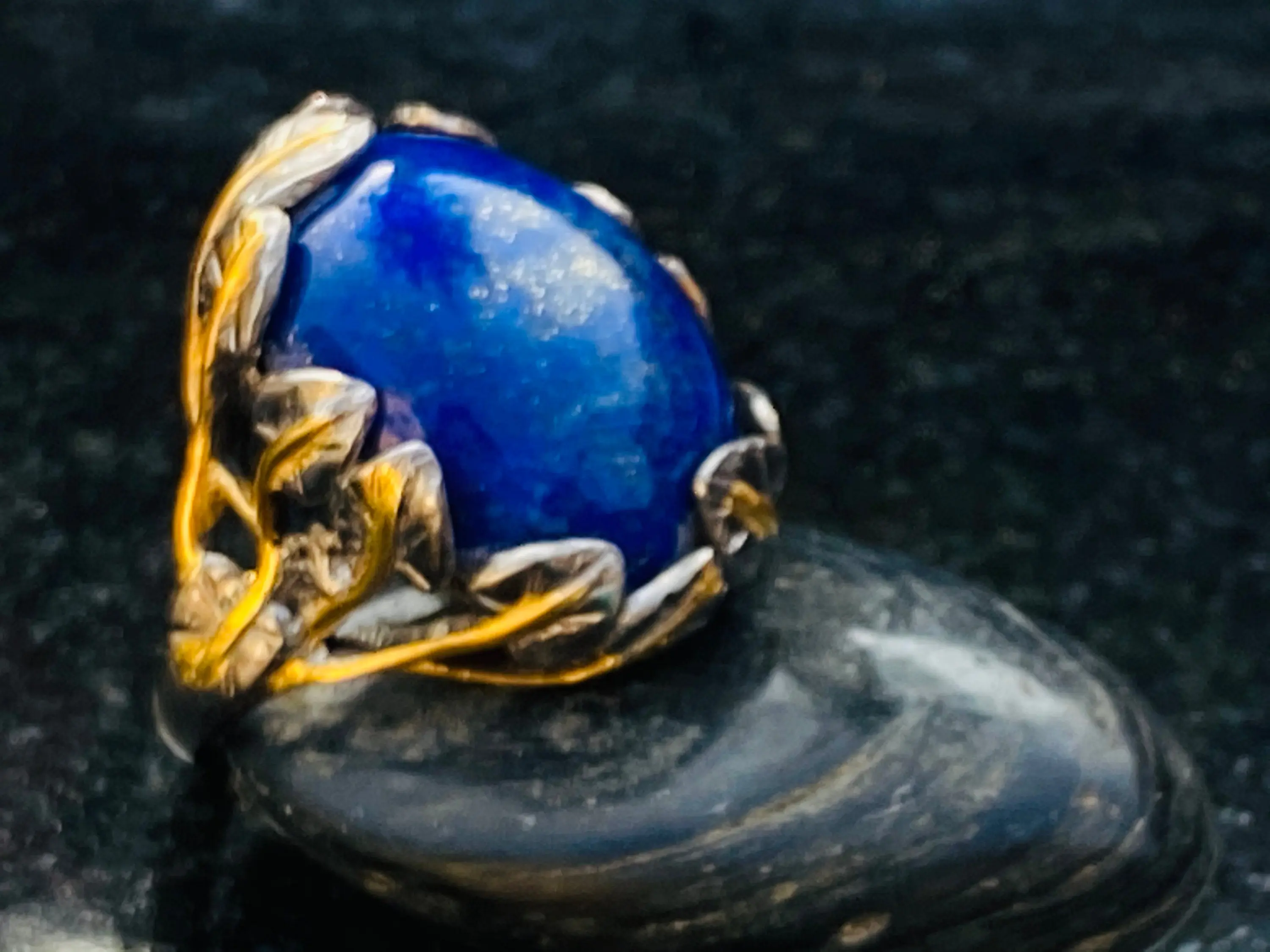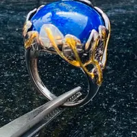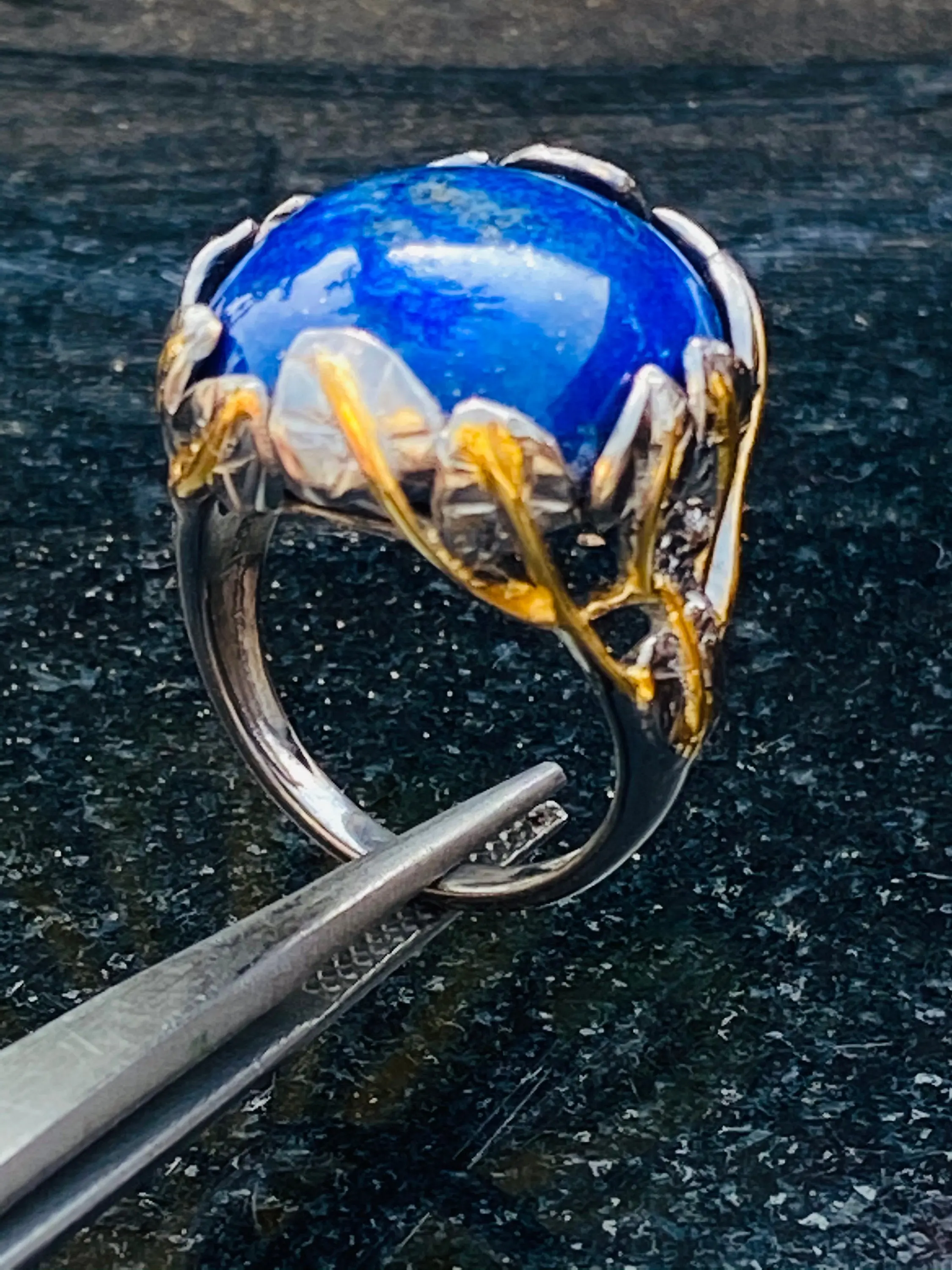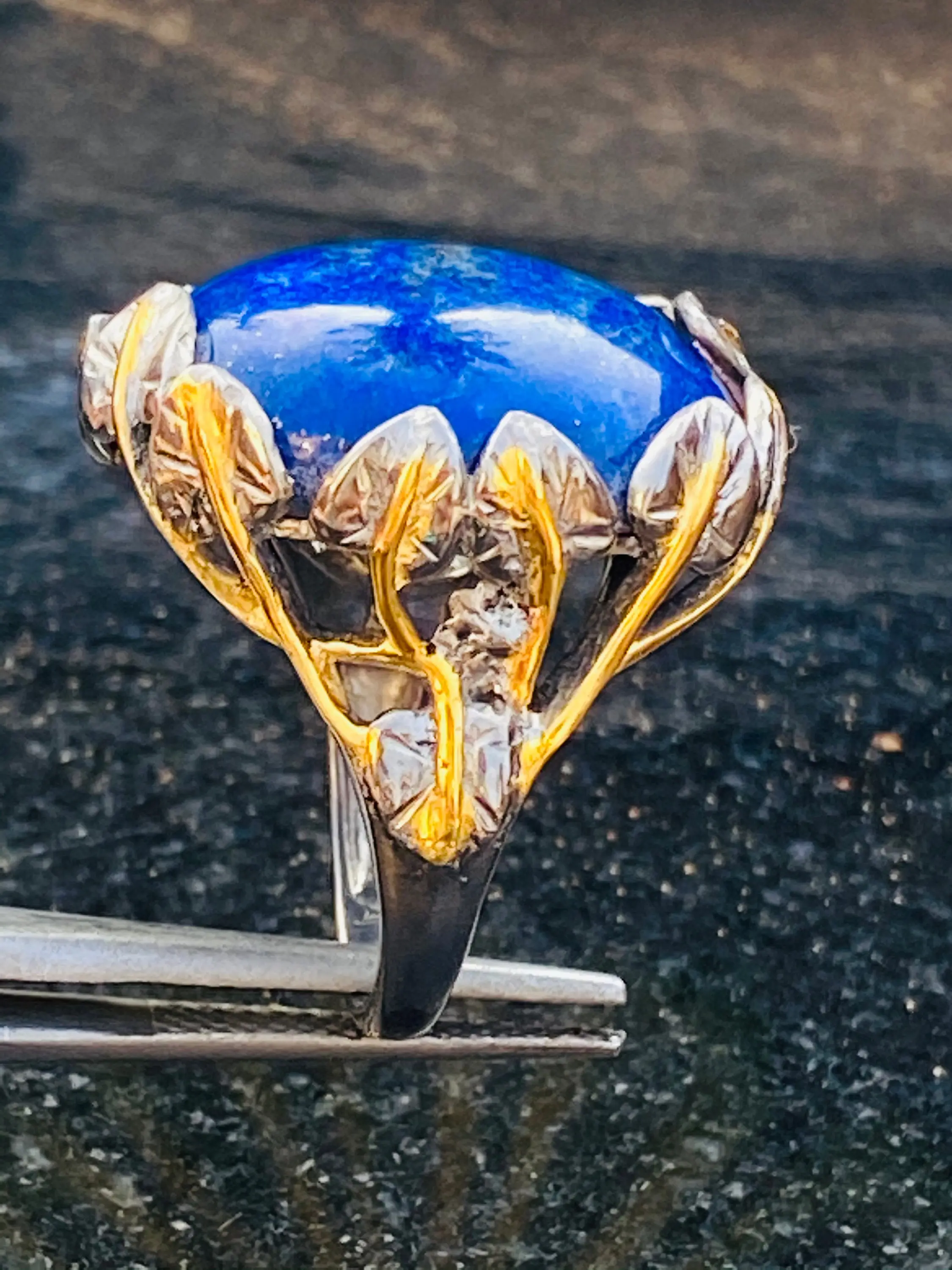 The ring is decorated as Tree of Life holding a large oval blue Lapis stone.