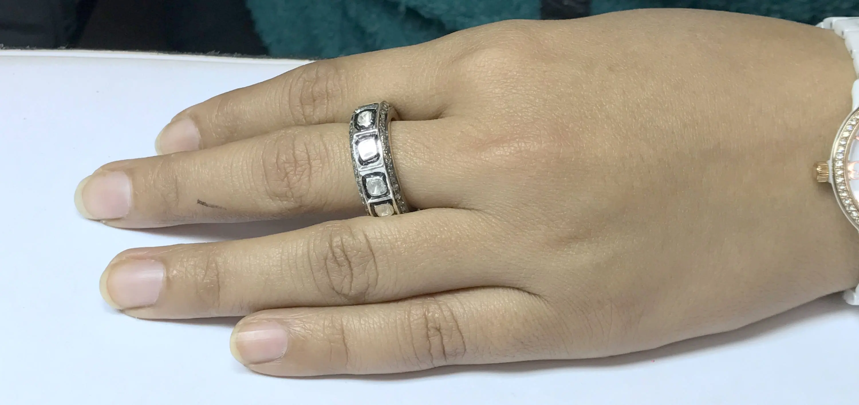 Polki diamonds in bezel set with round diamonds in pave set in 925 sterling silver makes it beautiful............