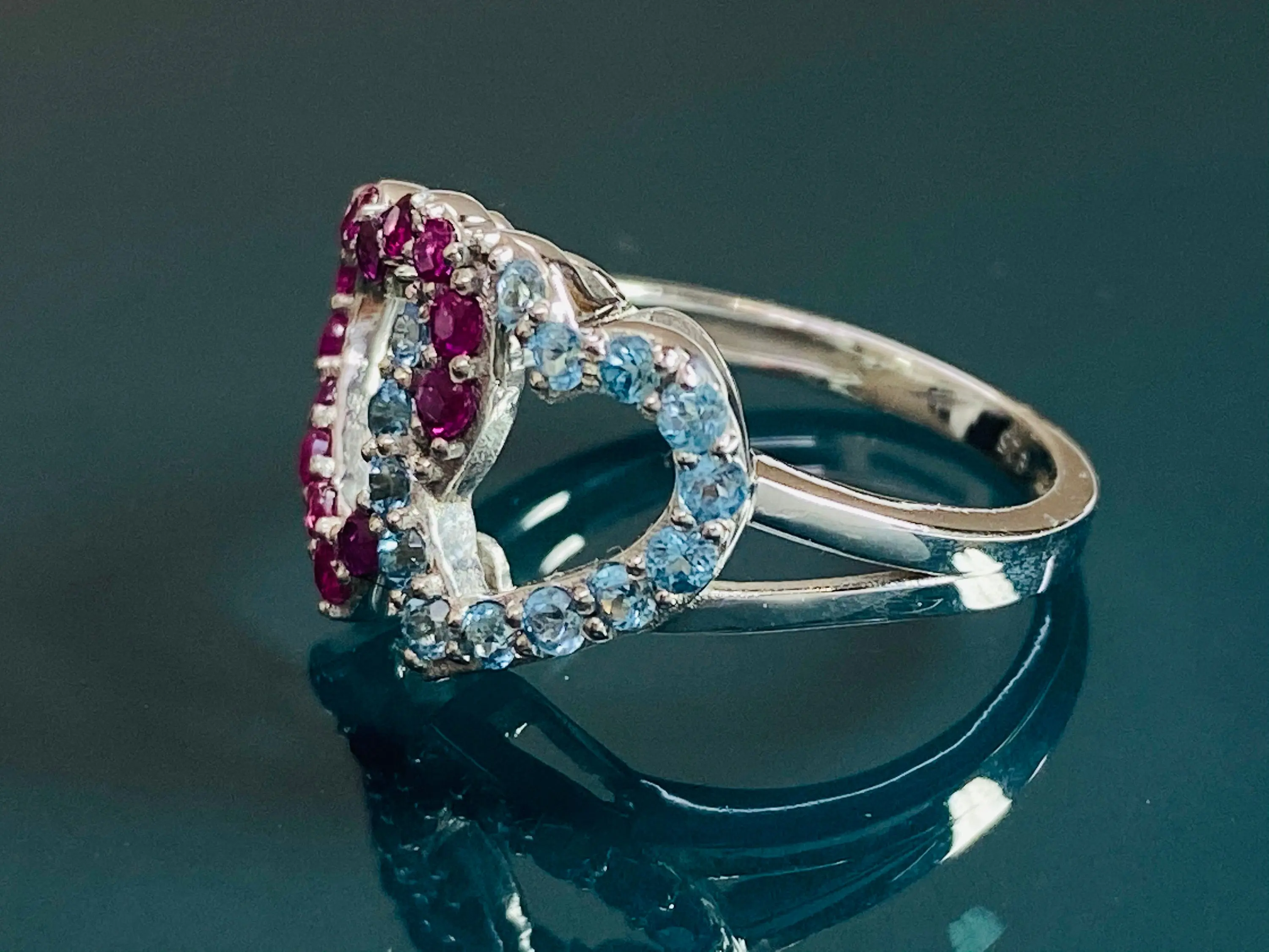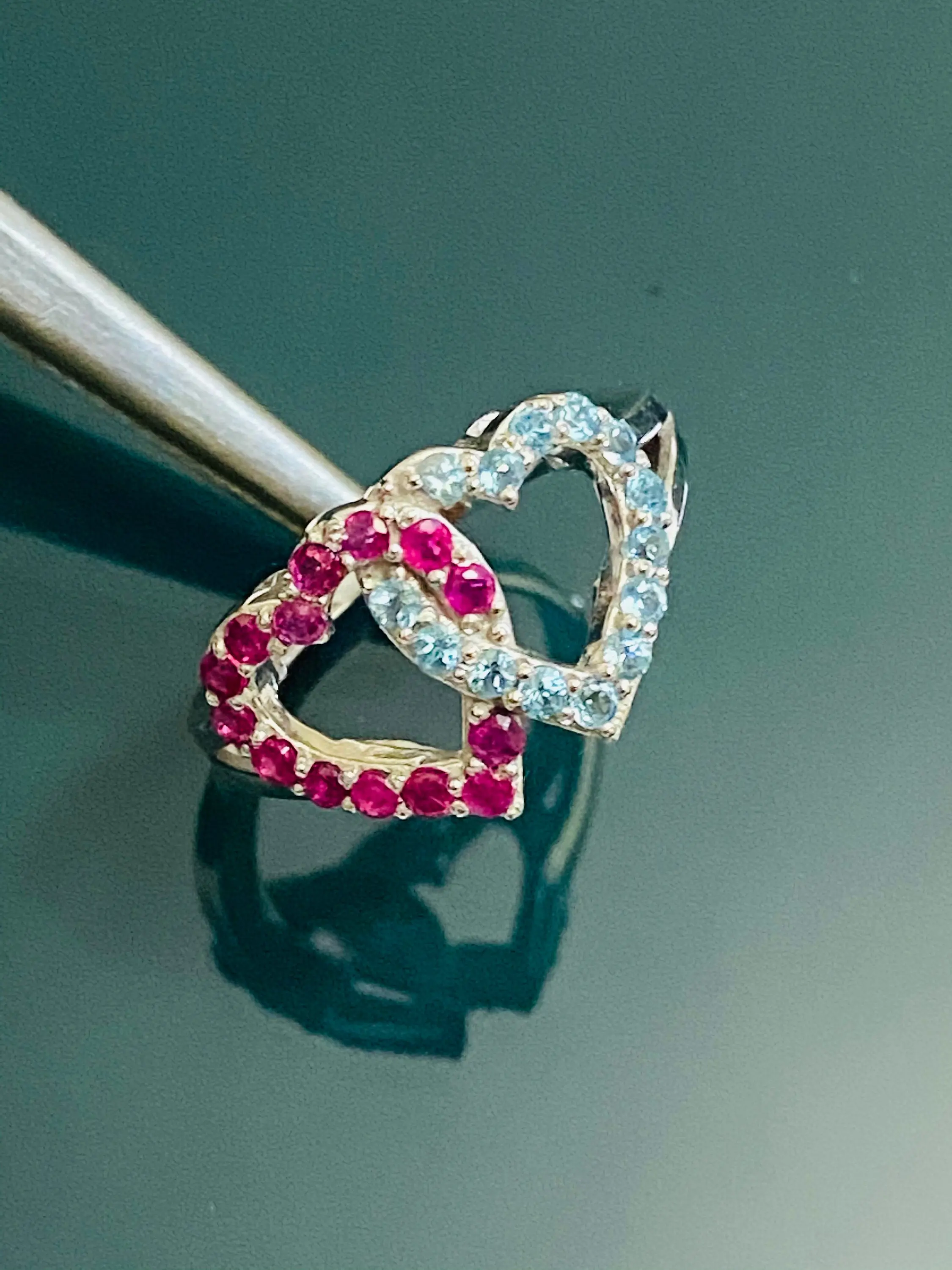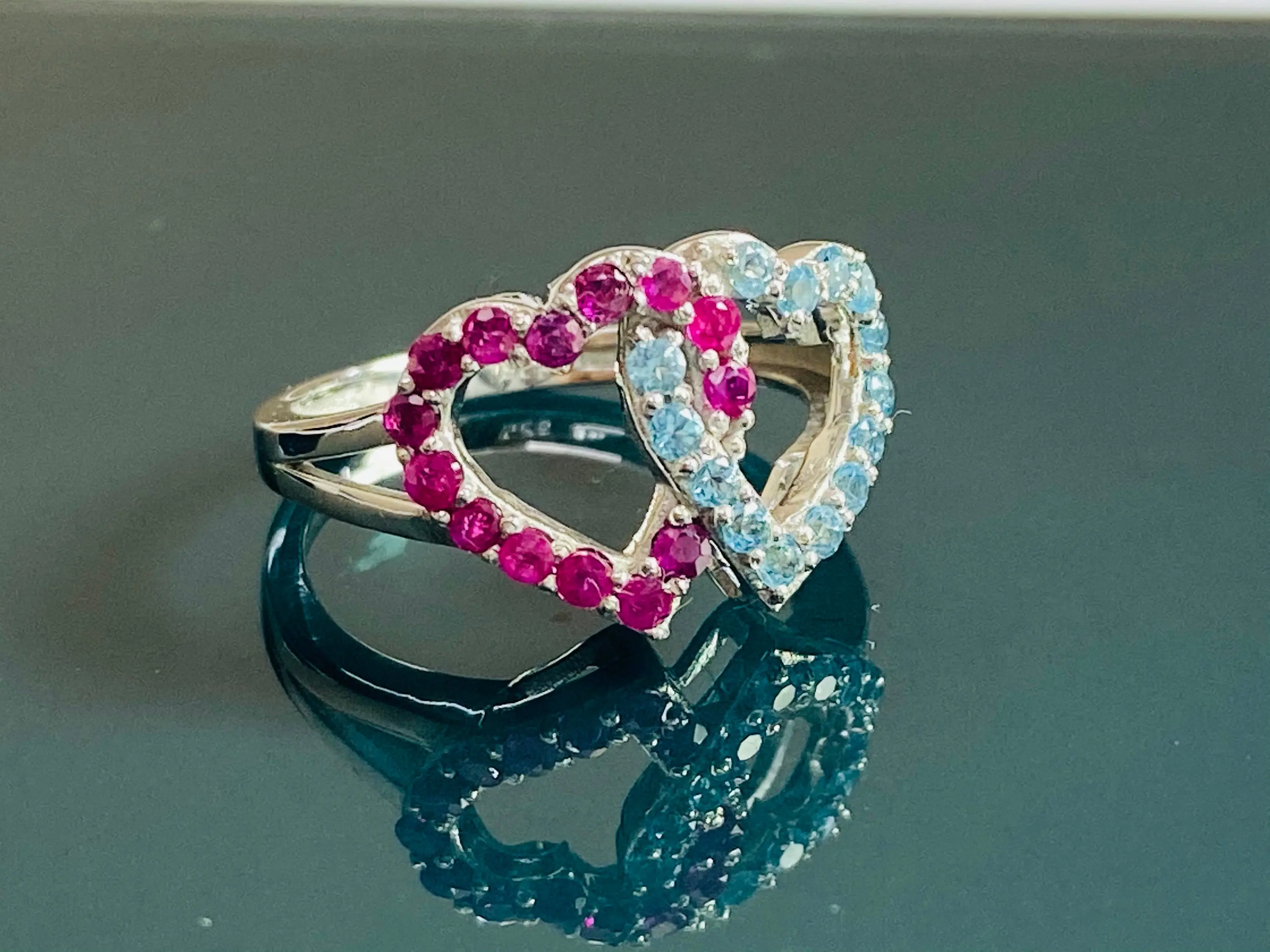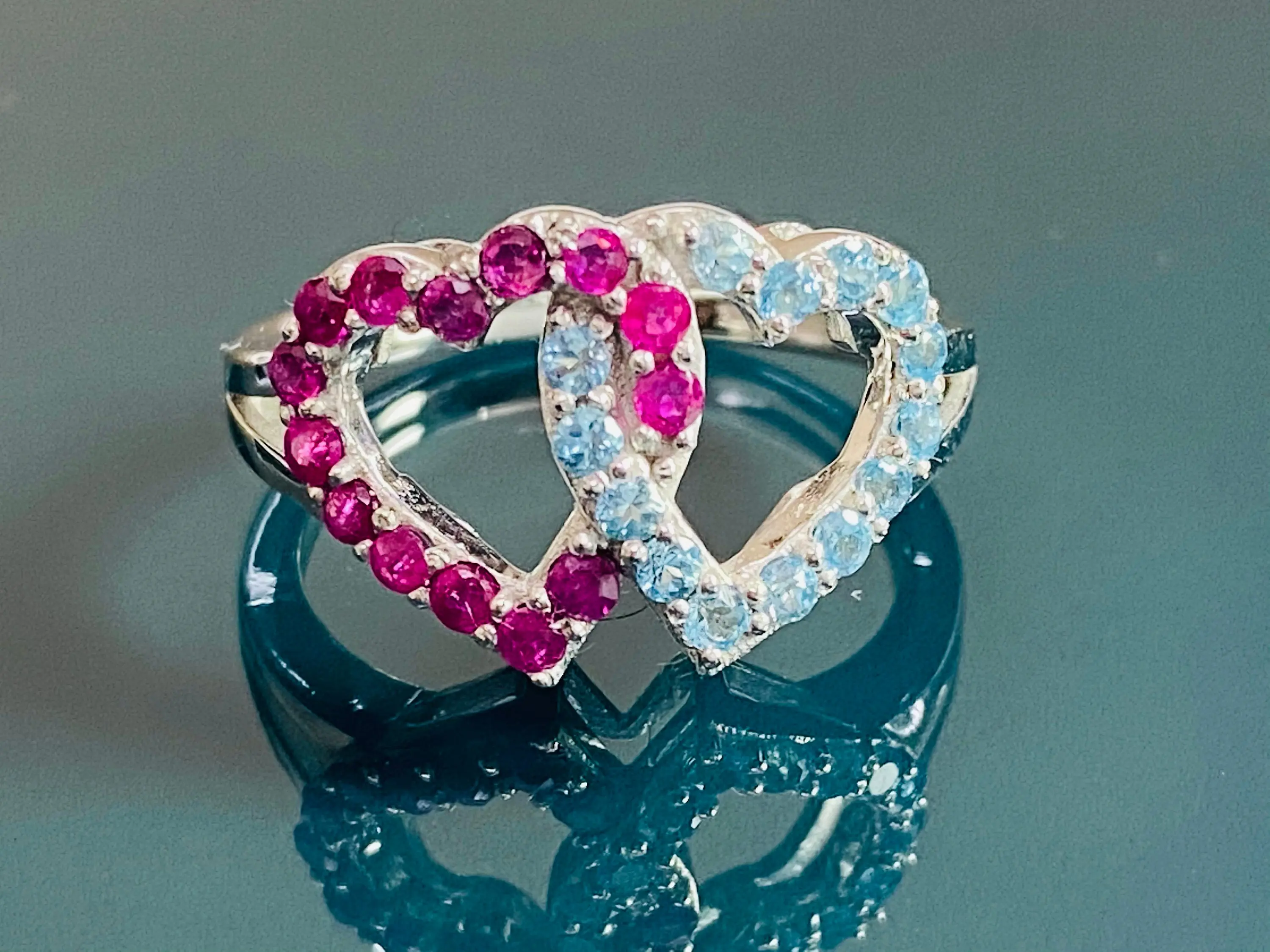 2 Interlocked Hearts Promise Ring, Multiple gemstone Ruby and Blue-Topaz love Ring, Christmas gift for loved ones ..