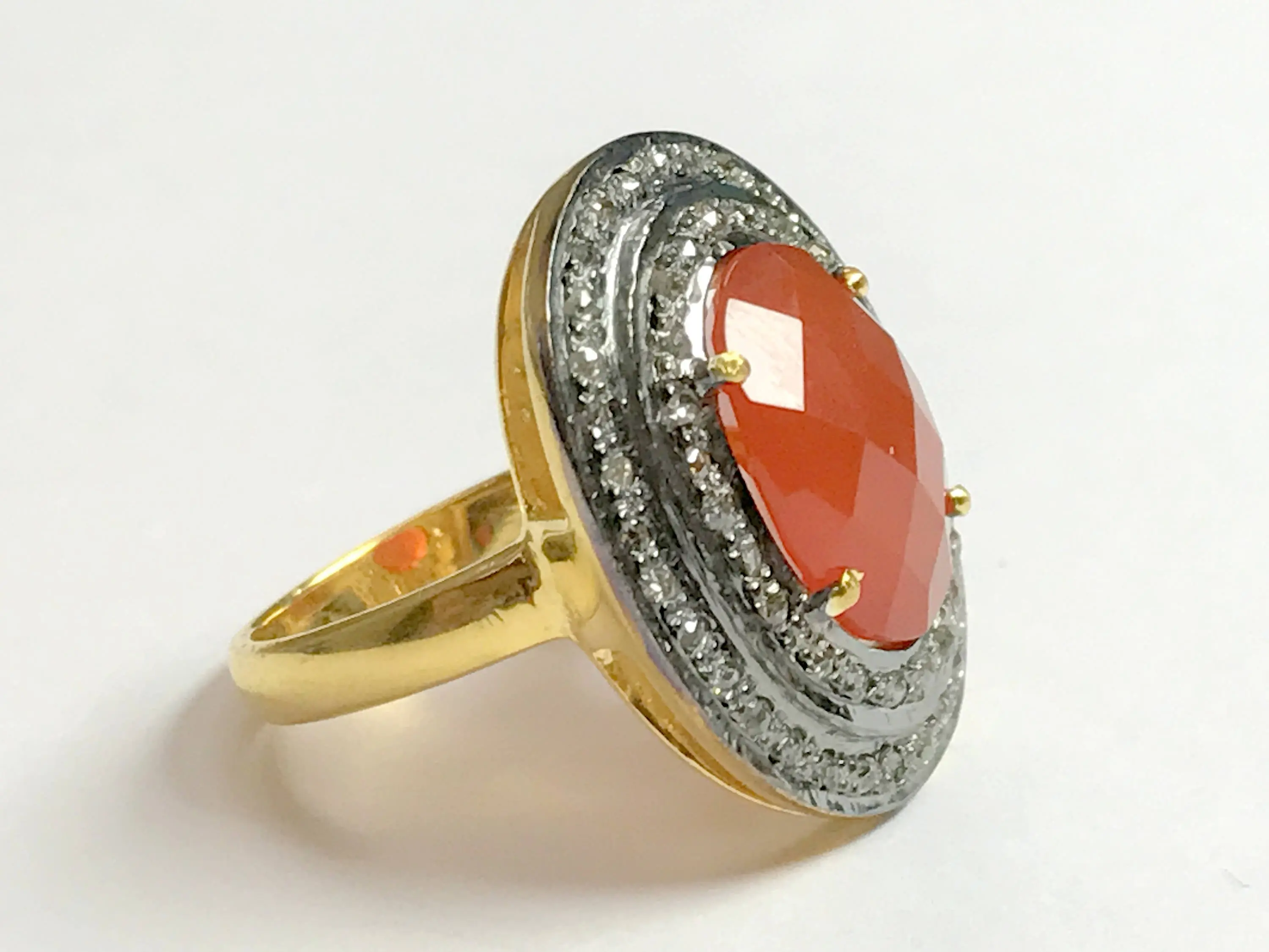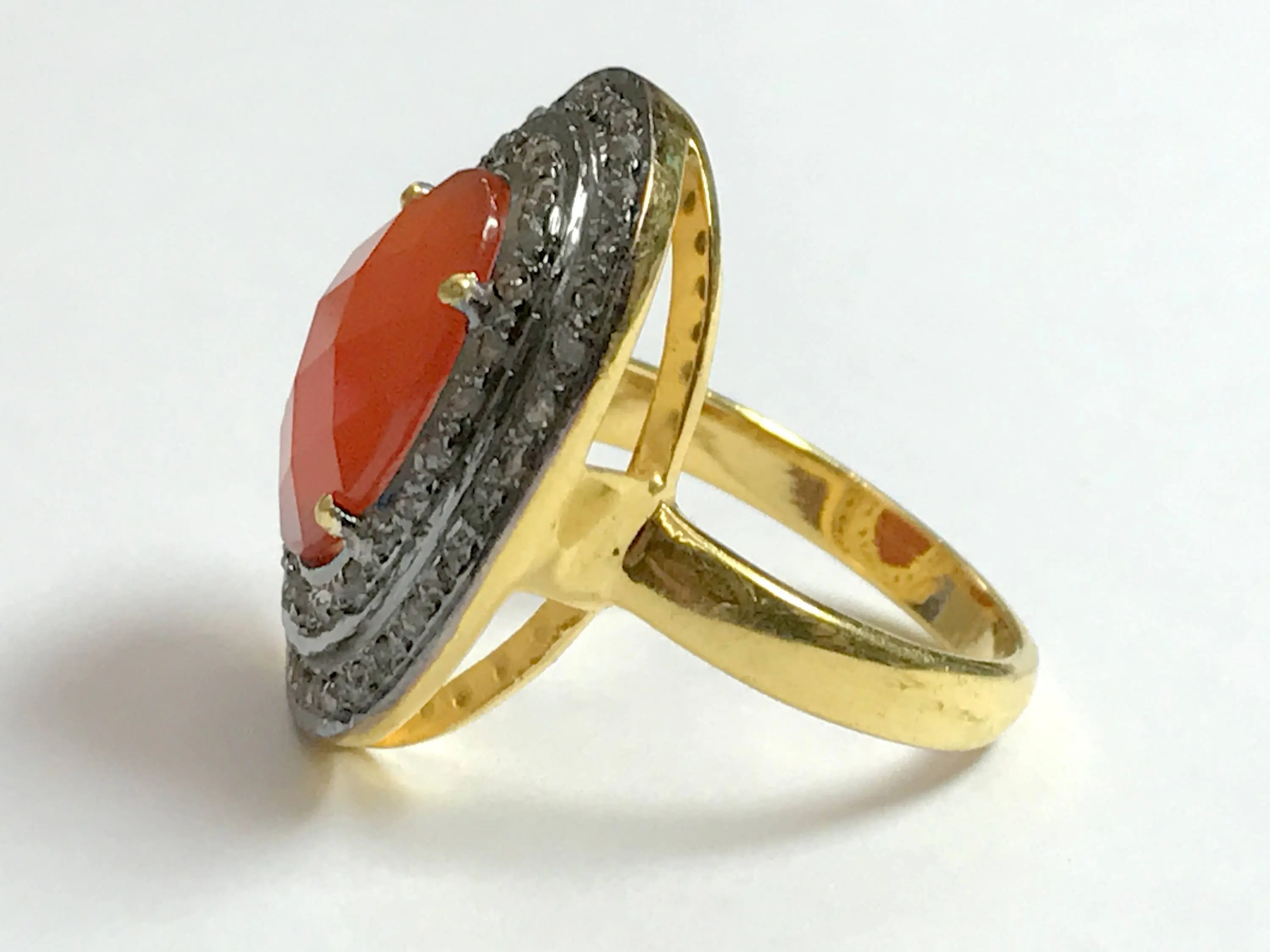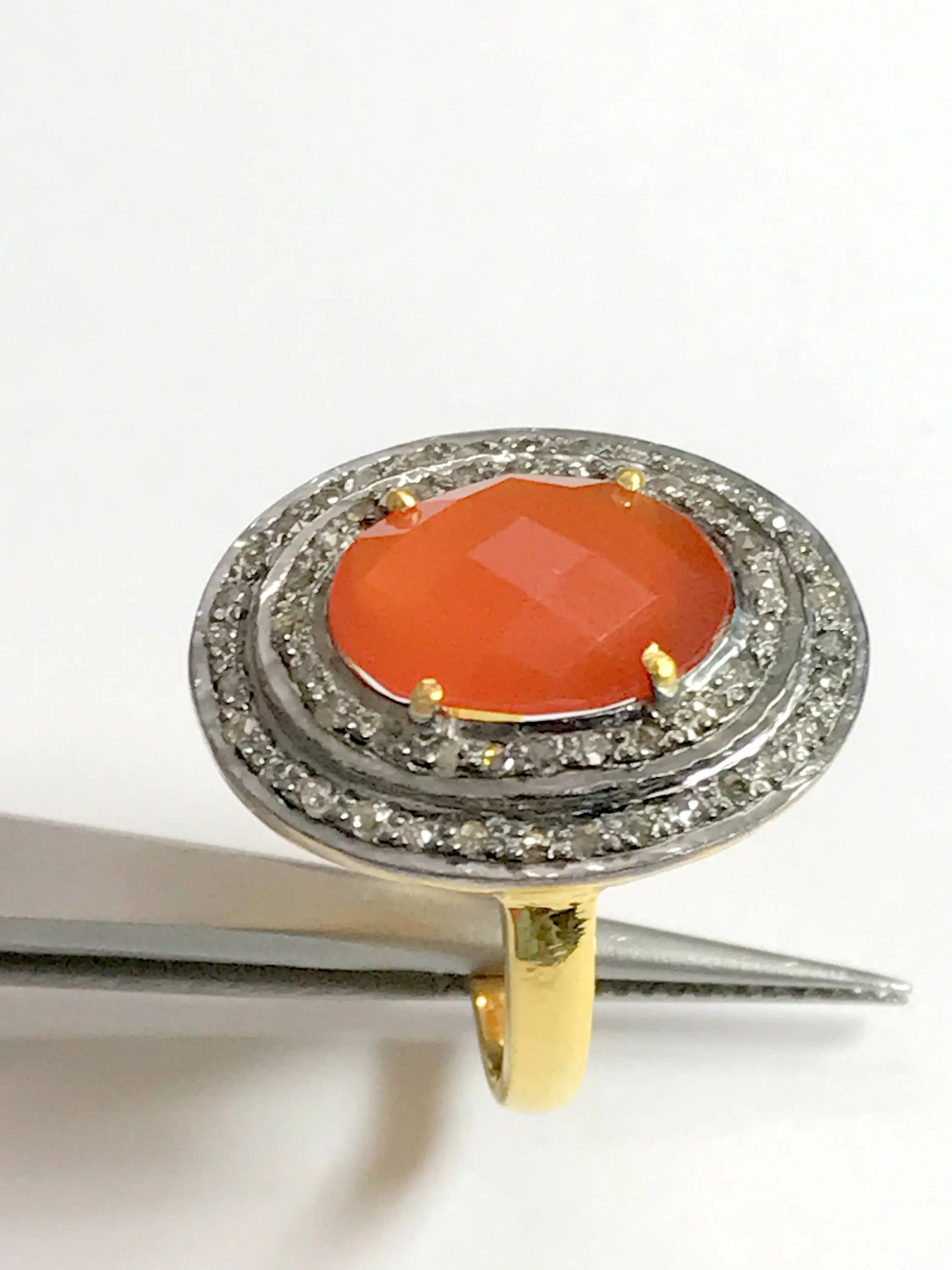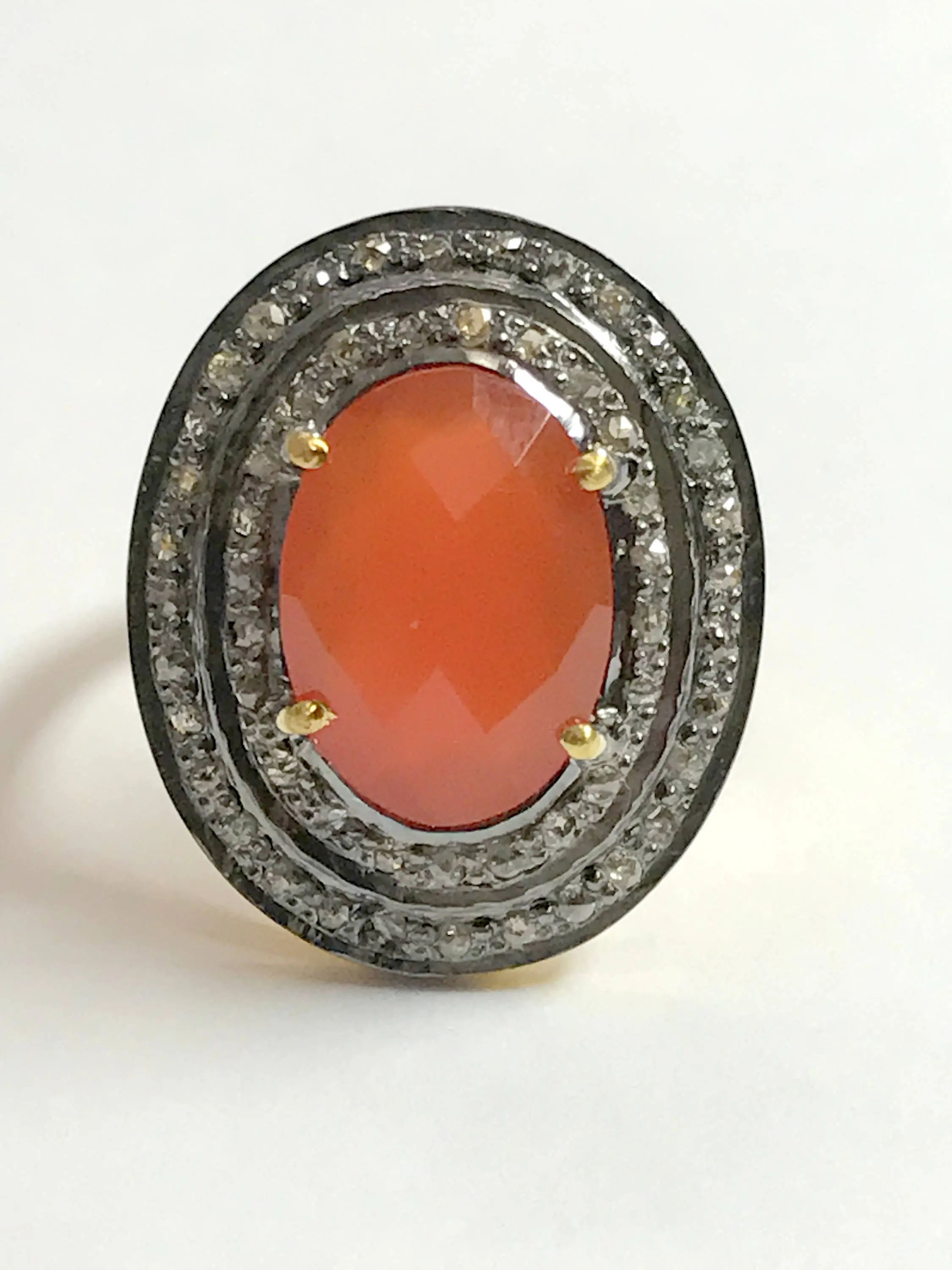 CARNELIAN DIAMOND RING in 925 sterling silver,Checkers cut Orange Carnelian ,rose cut diamonds , antique finish , perfect for evening wear..
