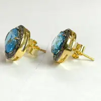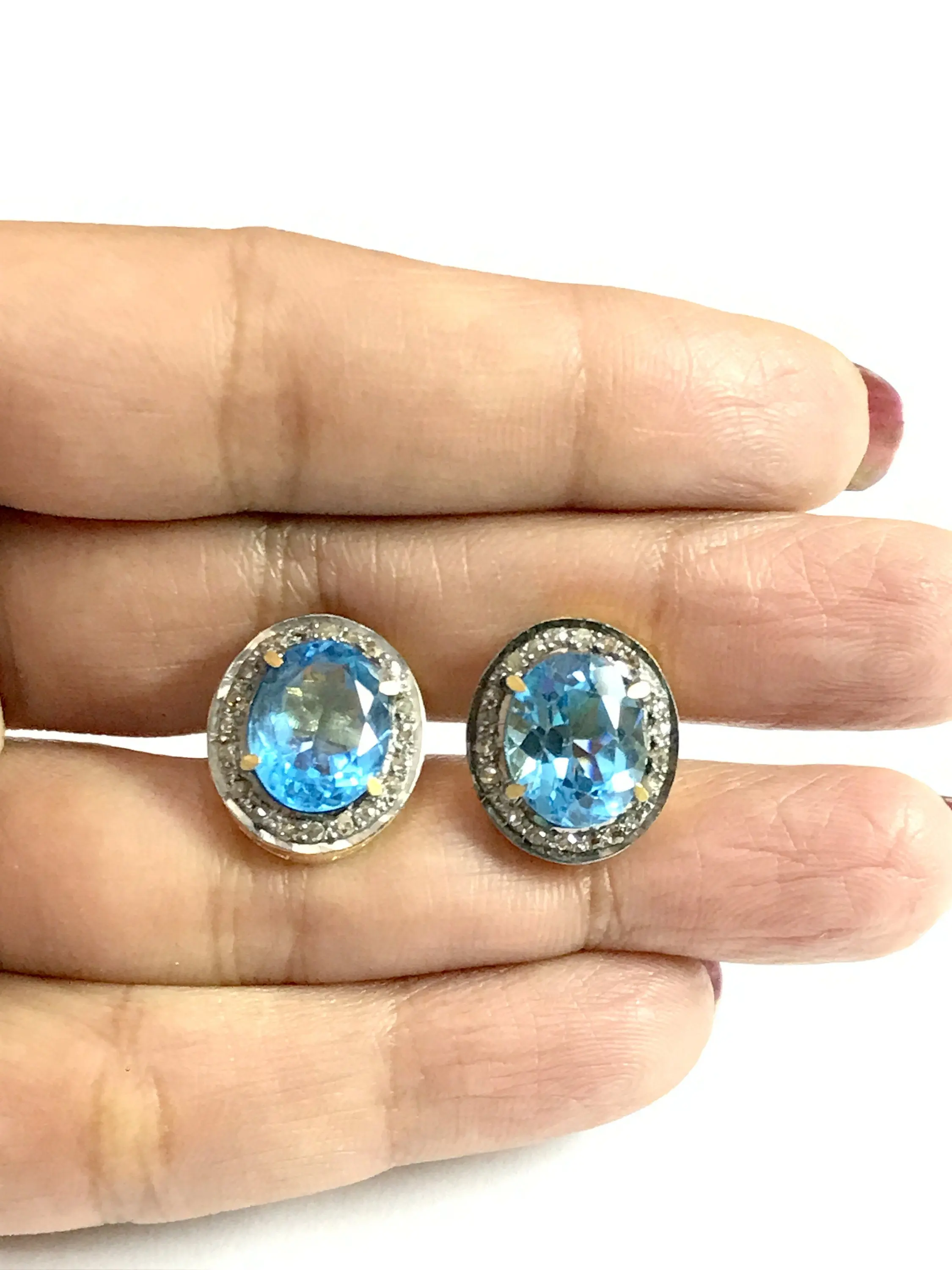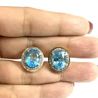 BLUE TOPAZ DIAMONDS cluster earrings ,Swiss blue topaz oval shape earrings in 925 sterling silver ,Swiss B.T. evening party wear