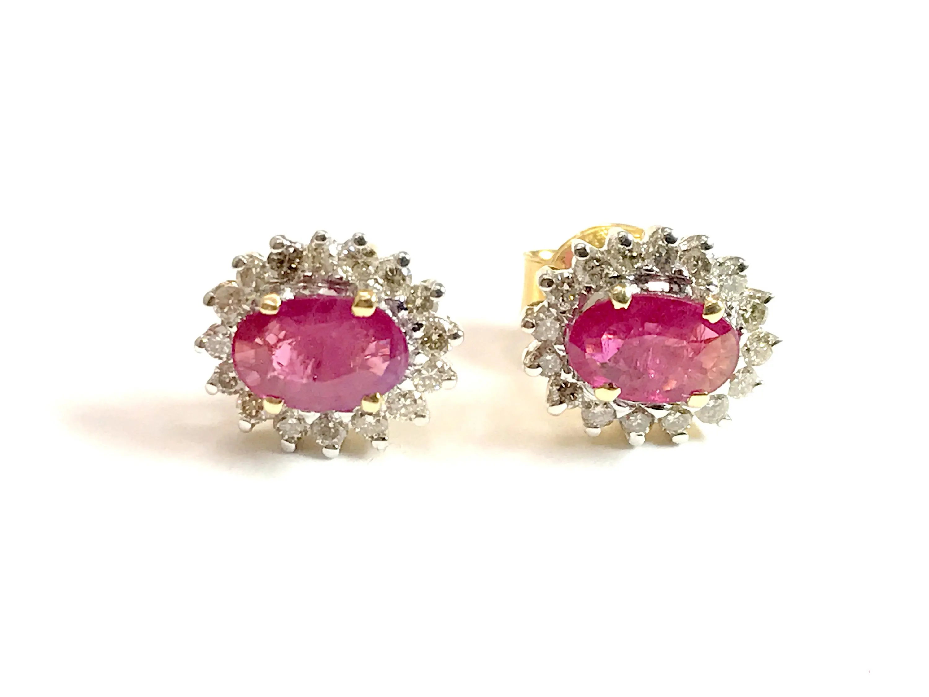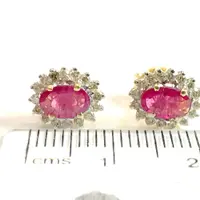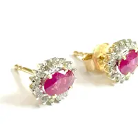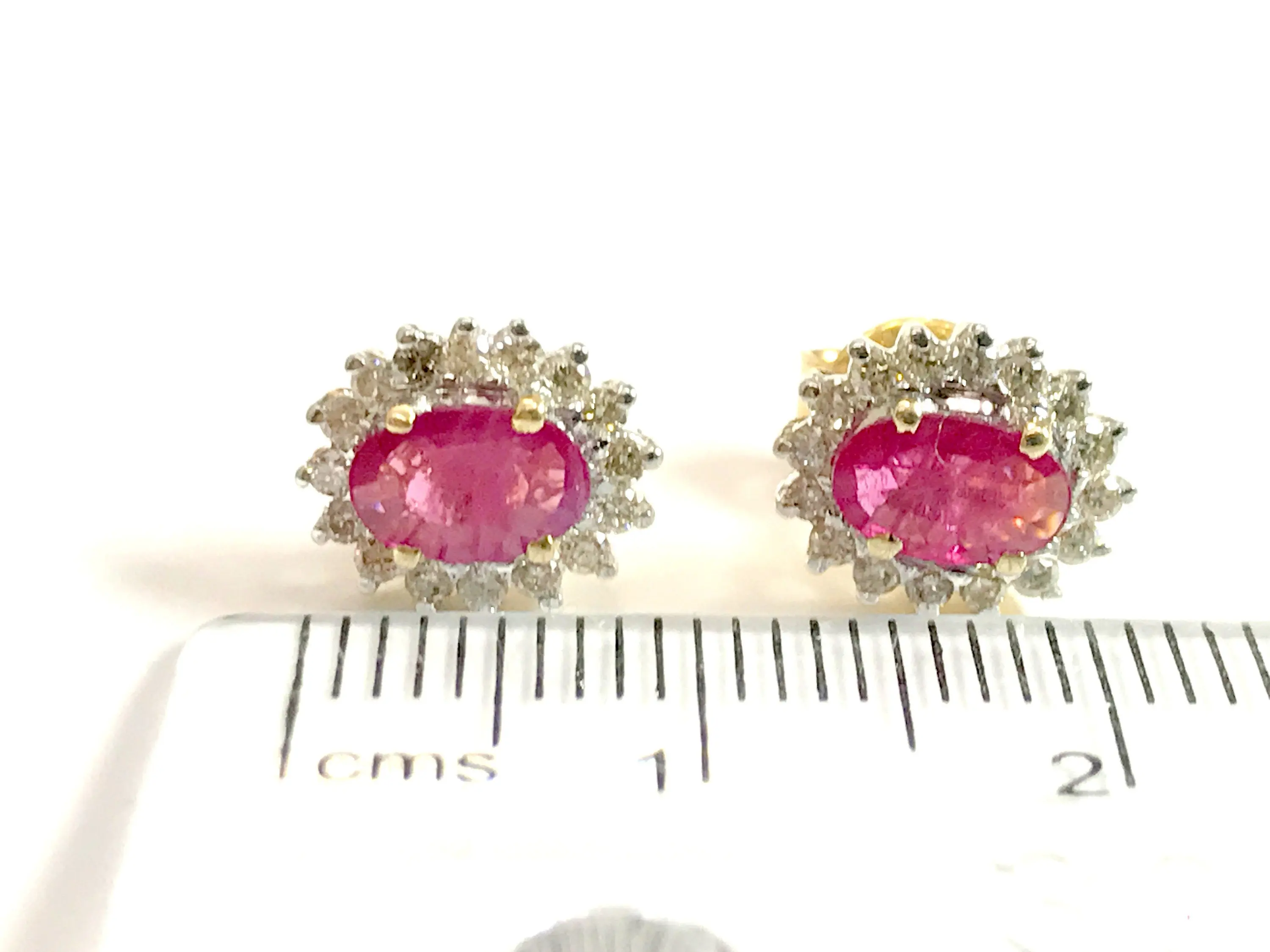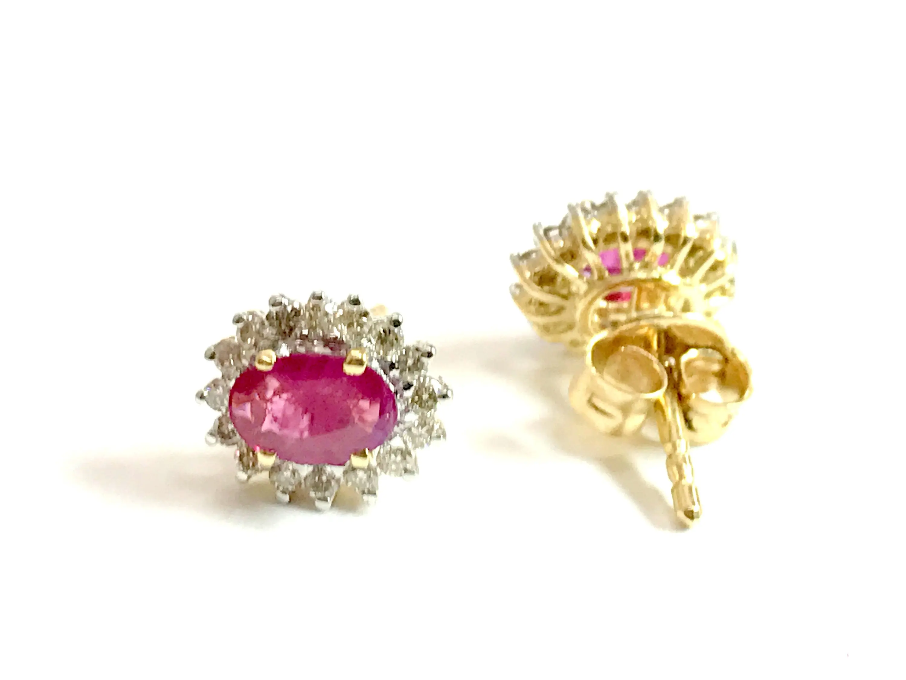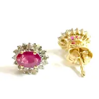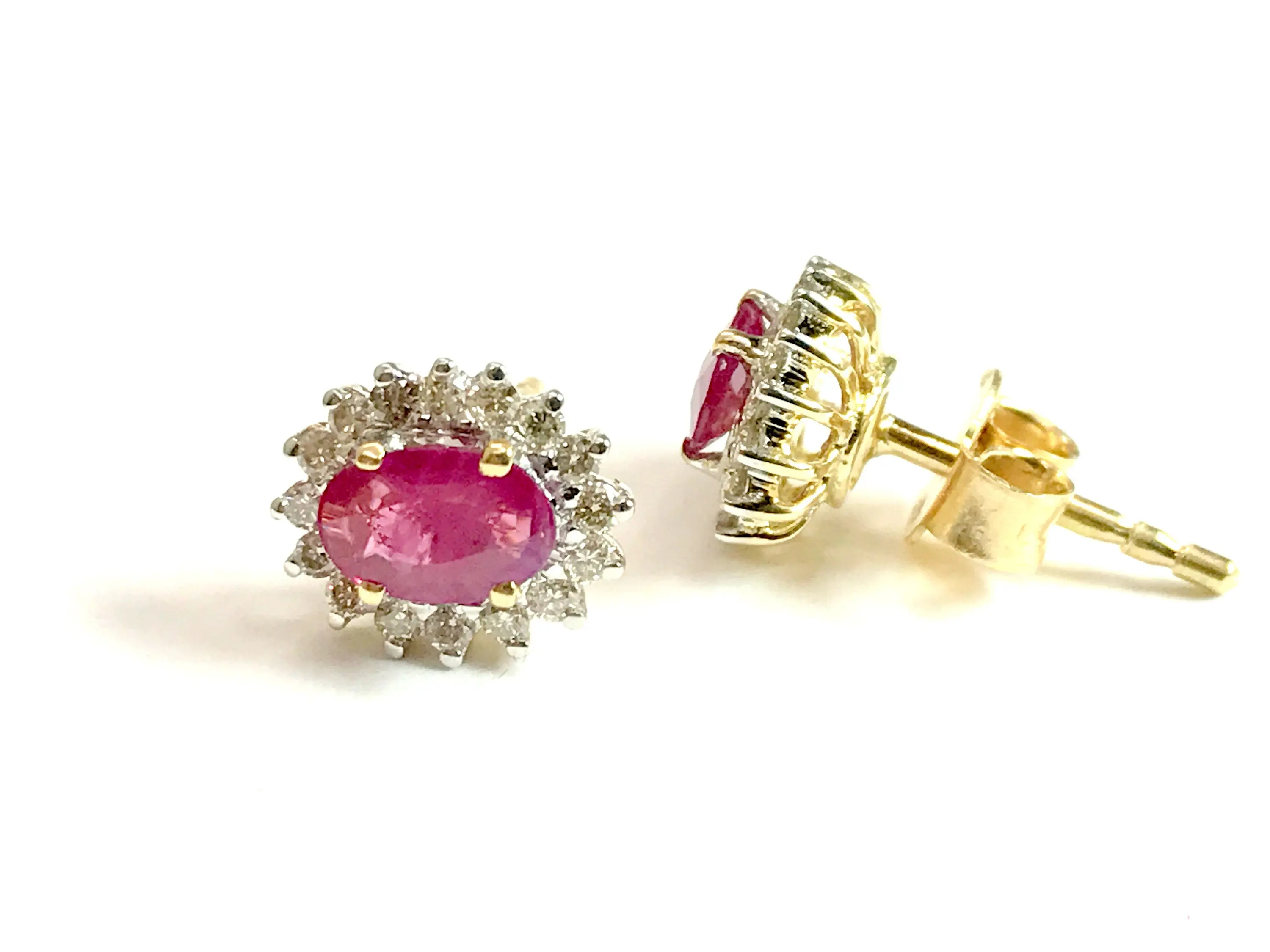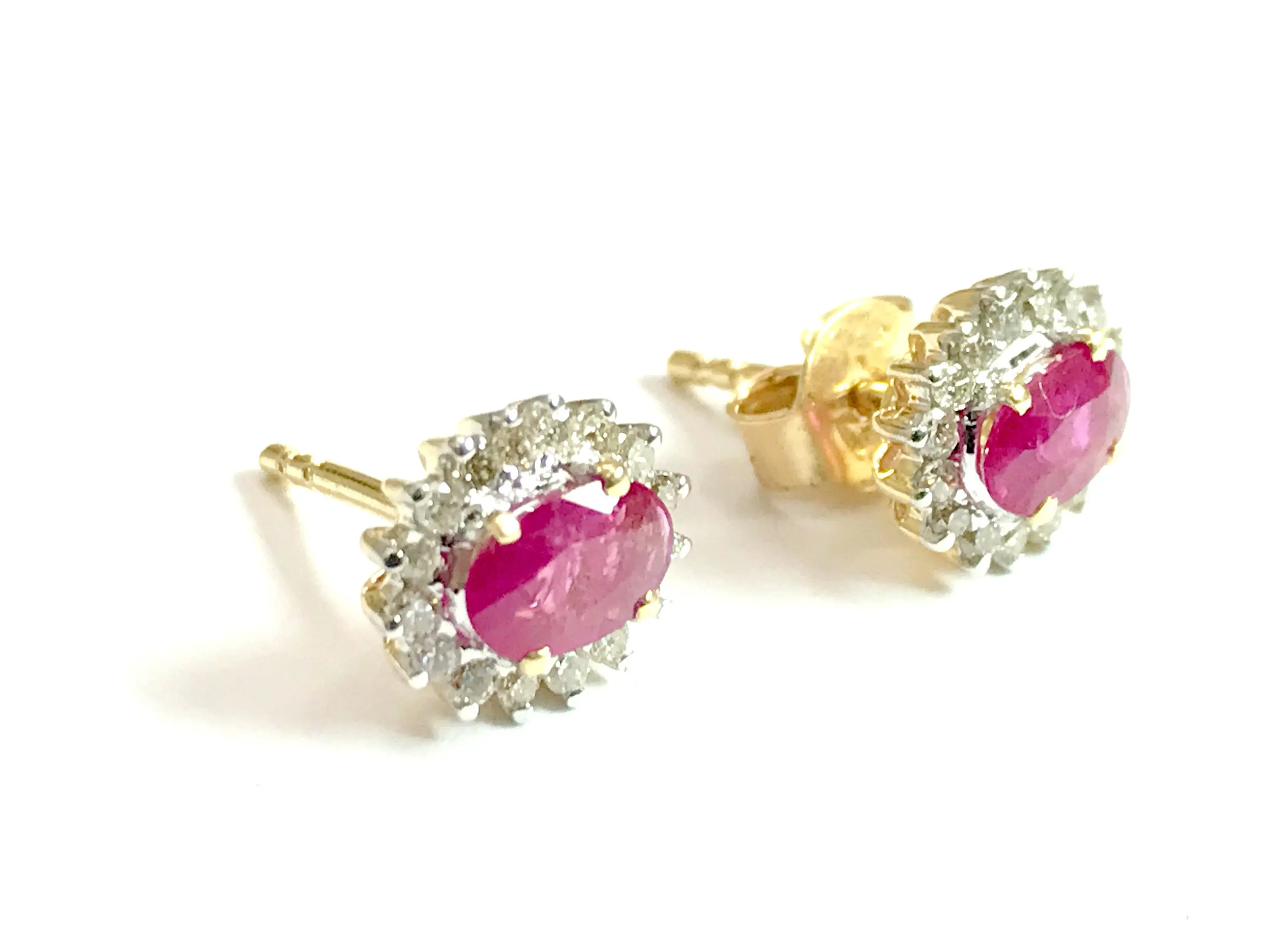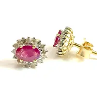 RUBY DIAMOND CLUSTER Stud Earring,14k gold ,Ruby oval,Gift for Her,July Birthstone , Ruby Anniversary .