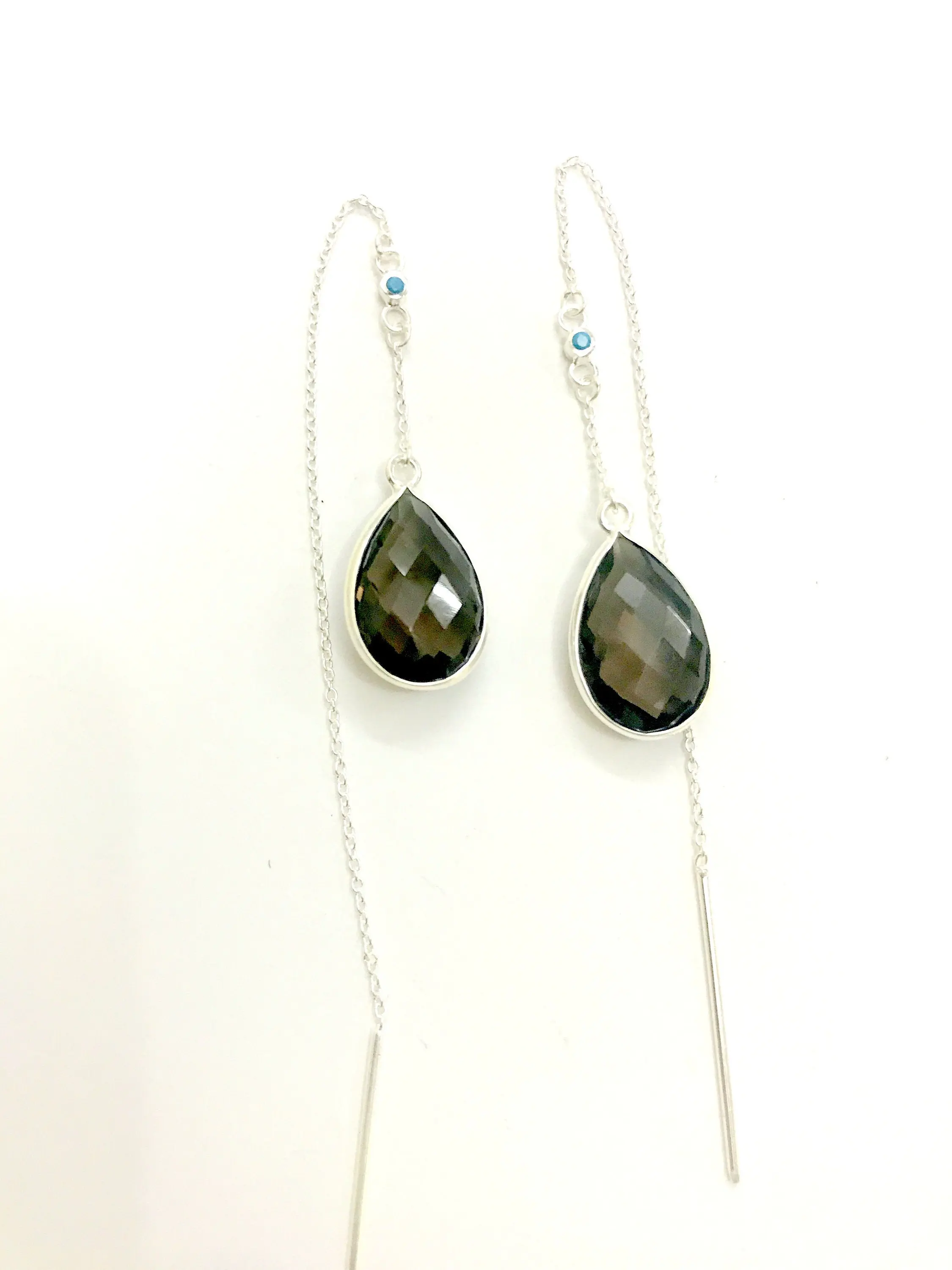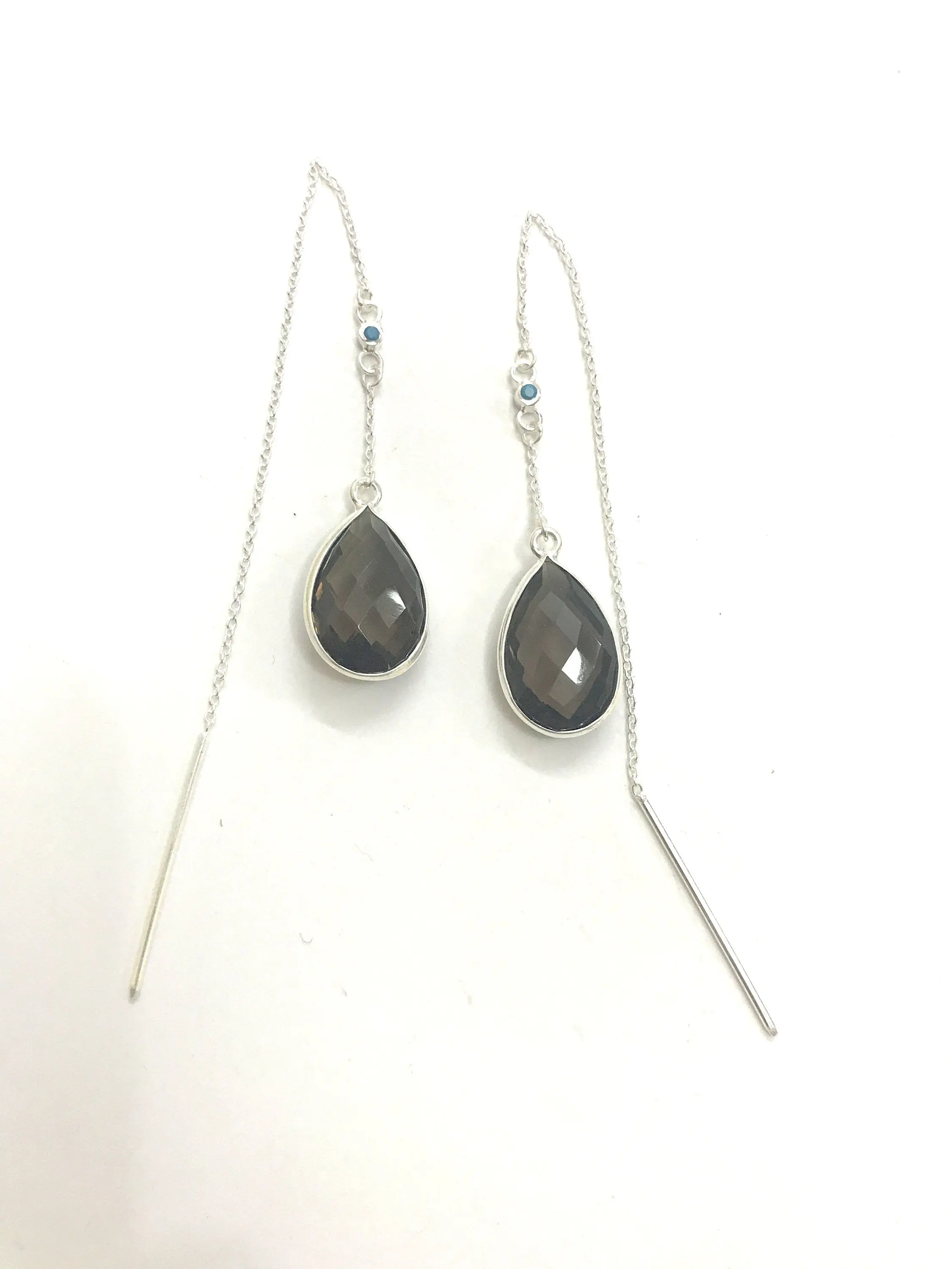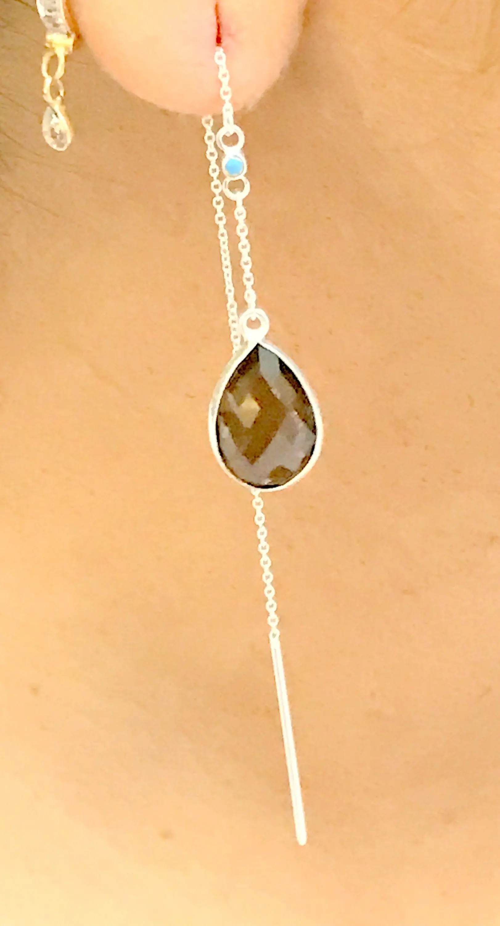 SMOKEY TOPAZ THREADER Earrings,Smokey Quartz, 925 Silver long chain with small turquoise studded, Ear Pencil ..