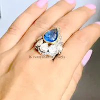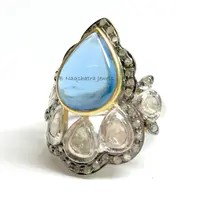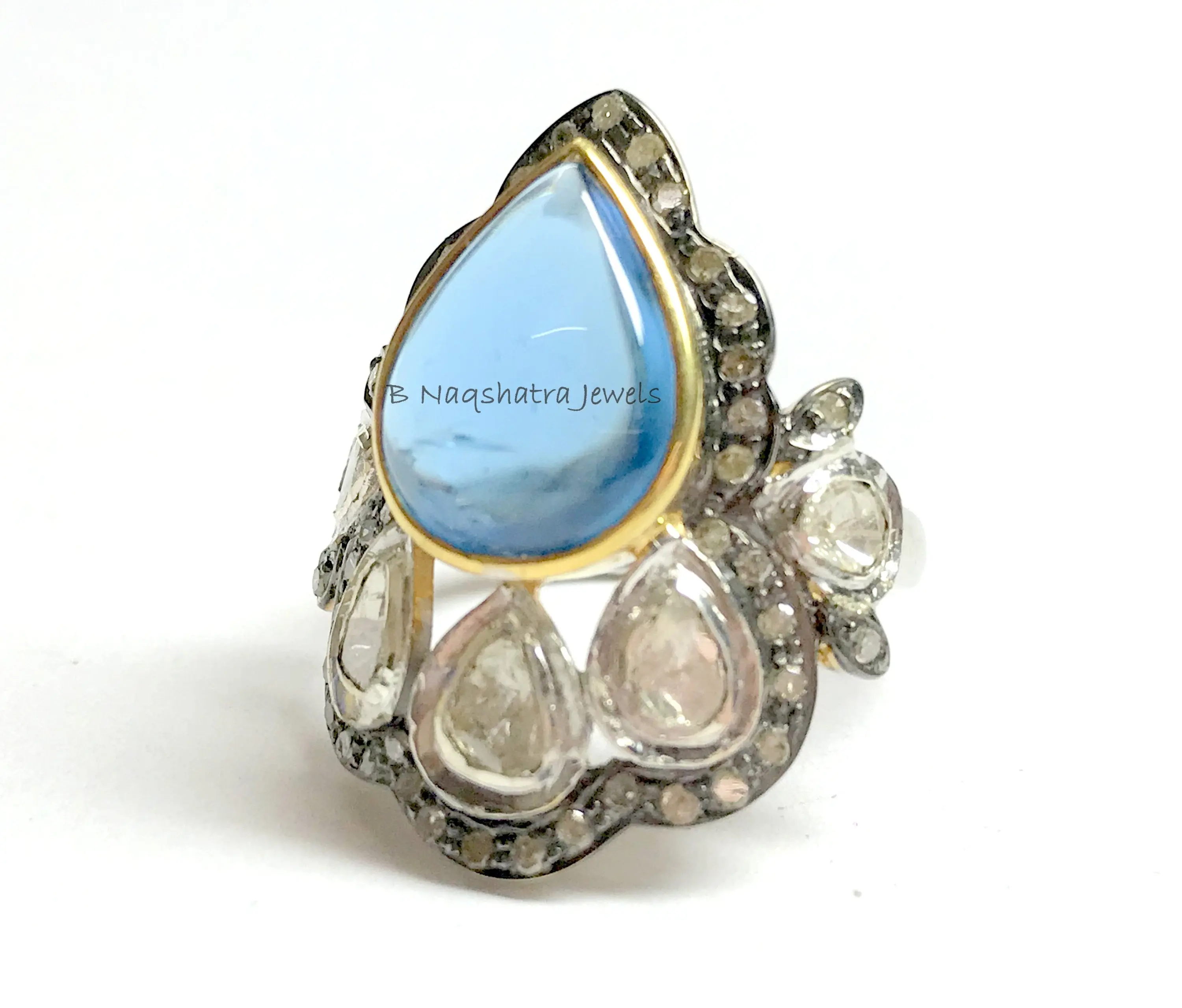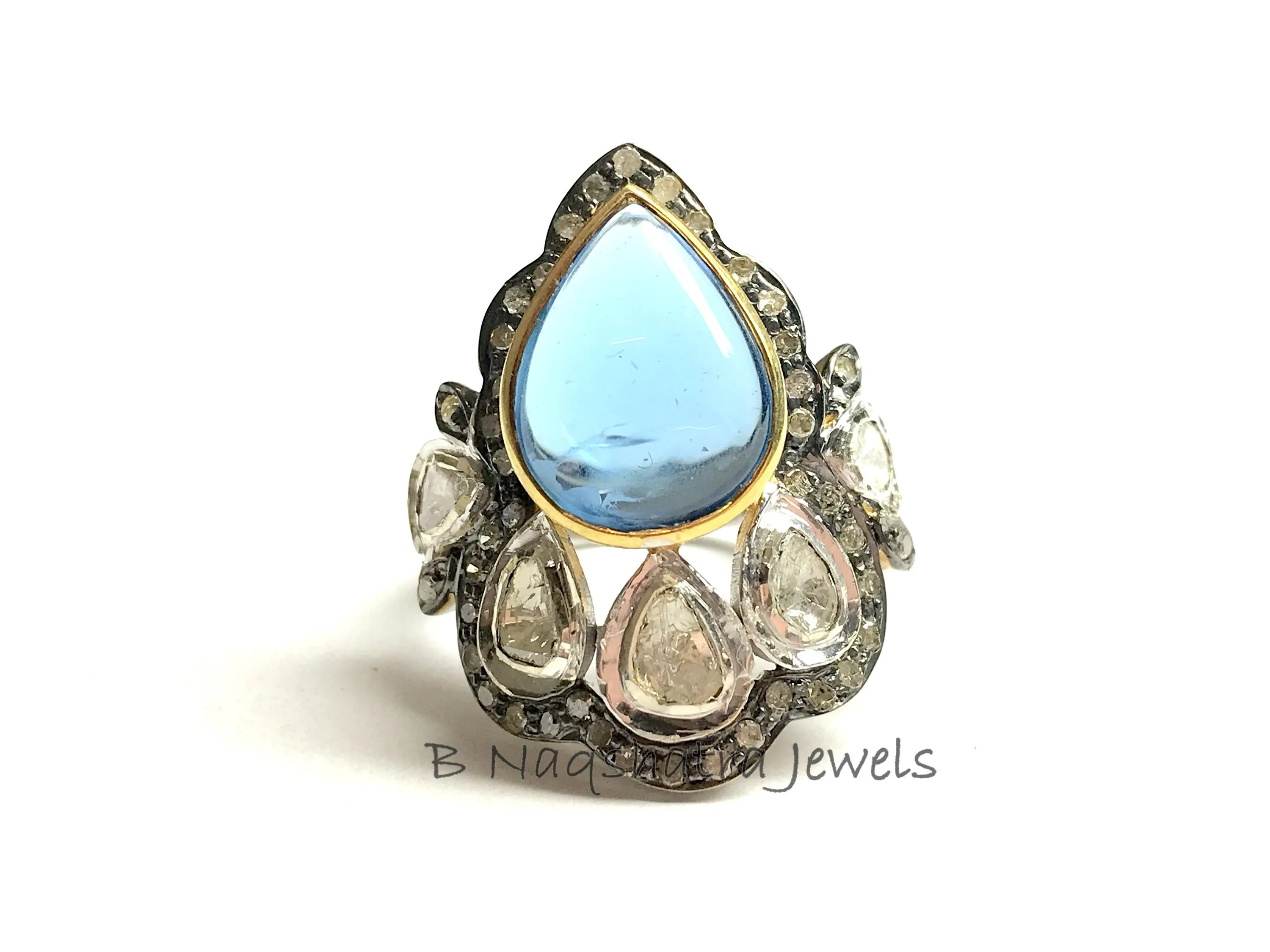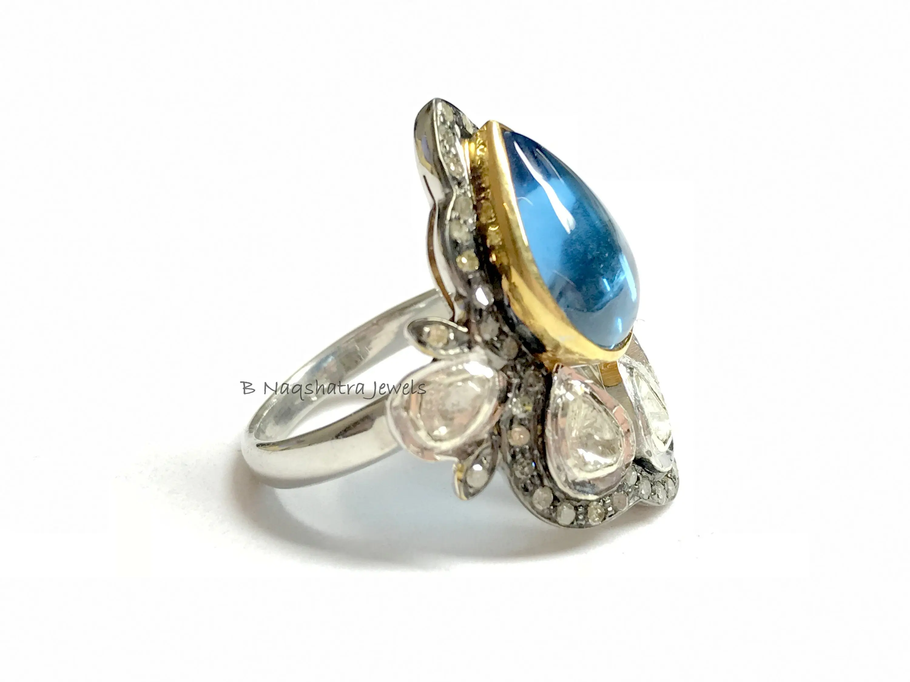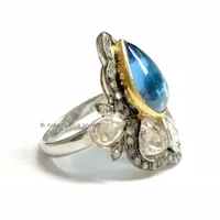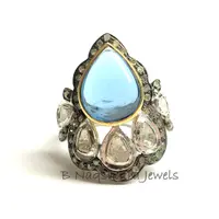SWISS BLUE TOPAZ Rose cut diamond Rings ,December birthstone ,Teardrop Blue Topaz Cabochon ,Cocktail & Engagement Ring