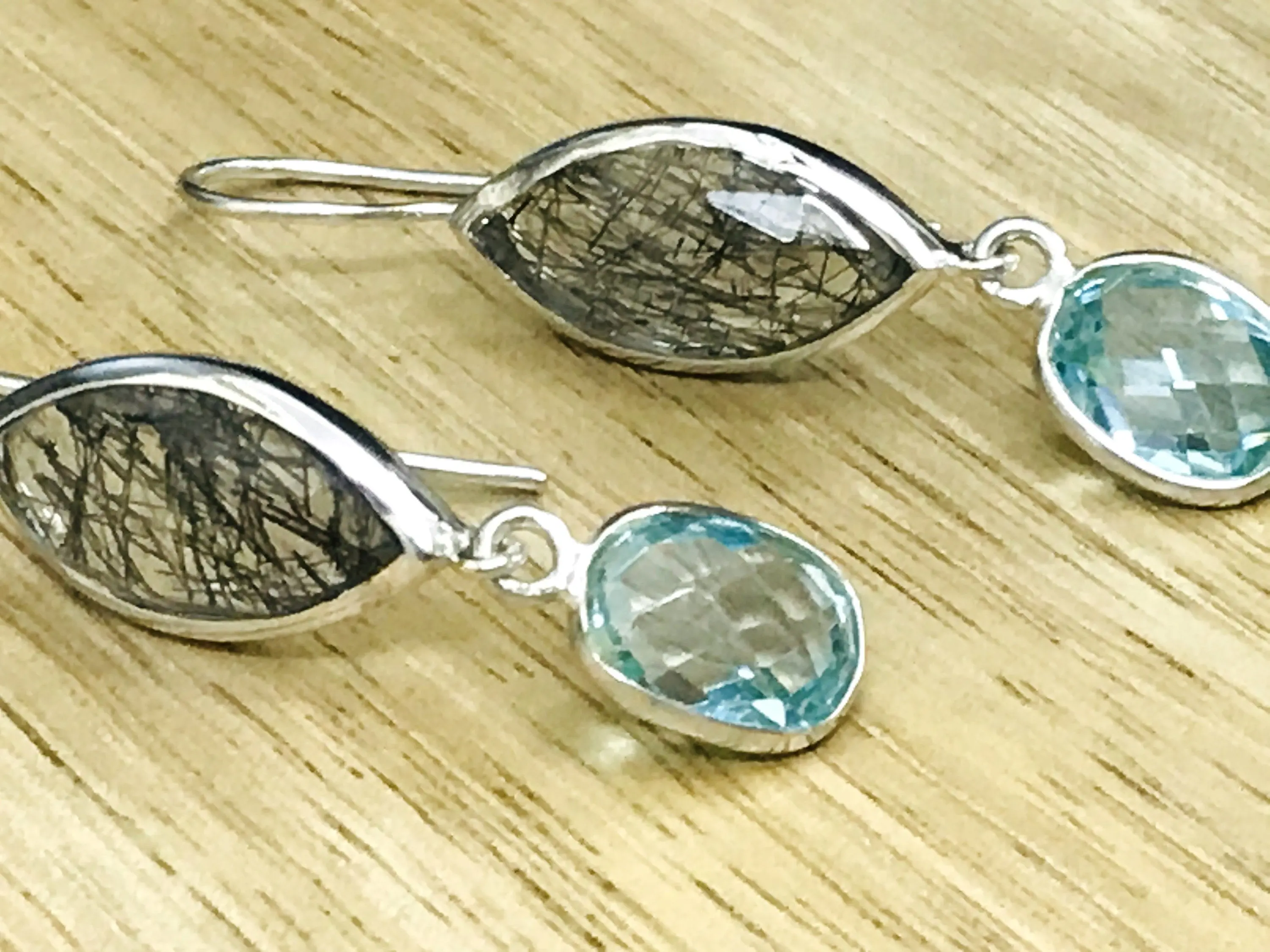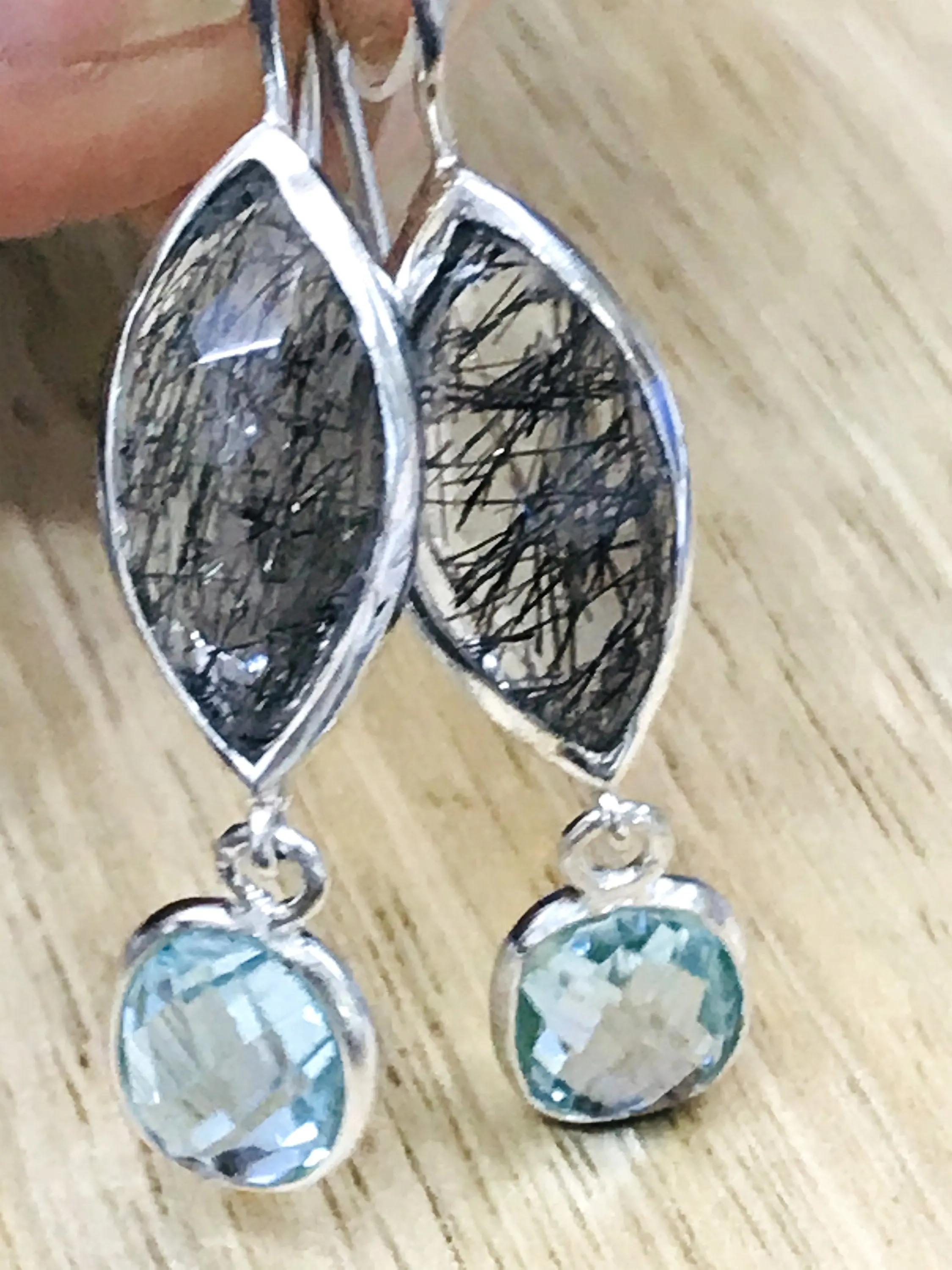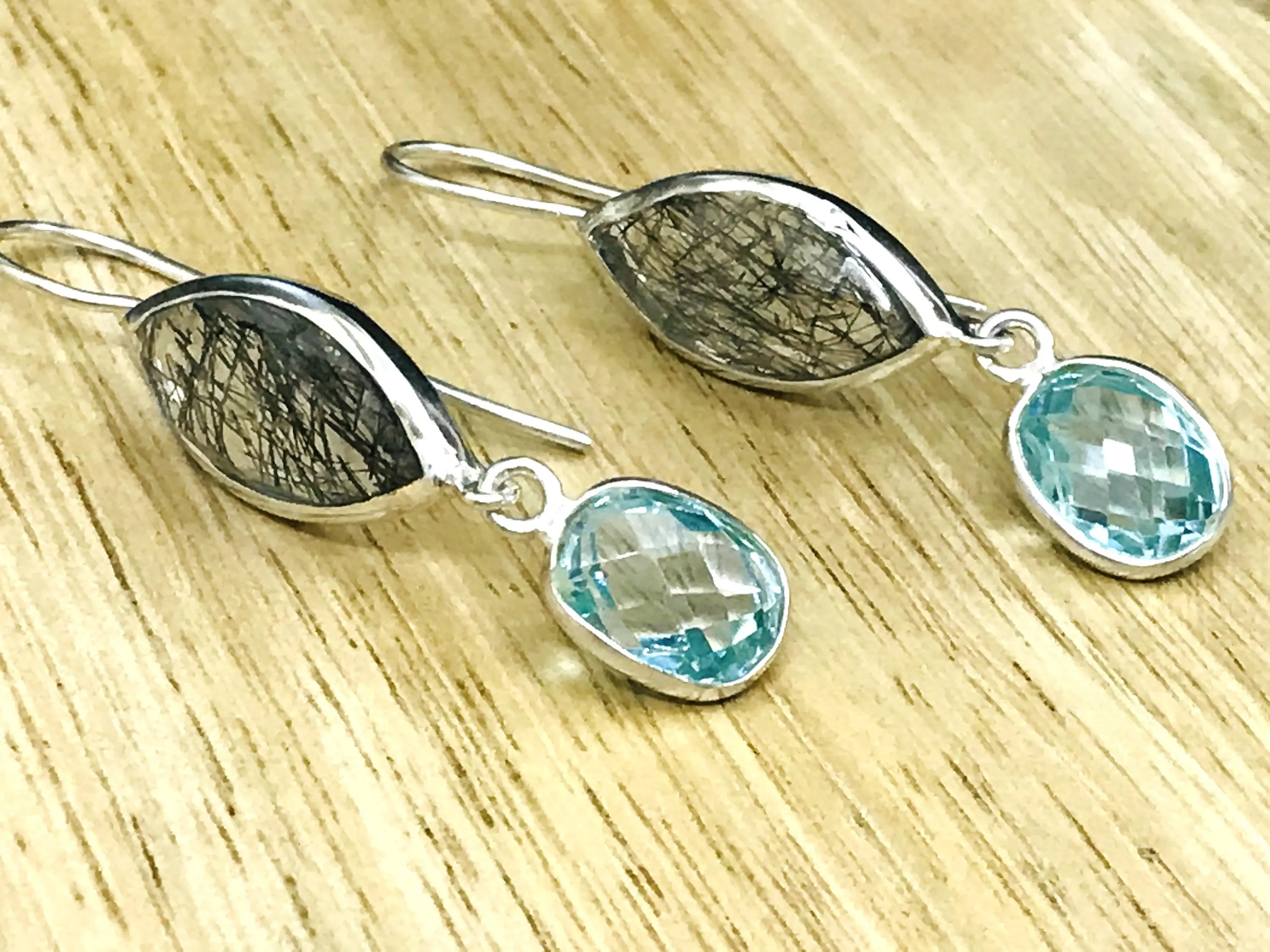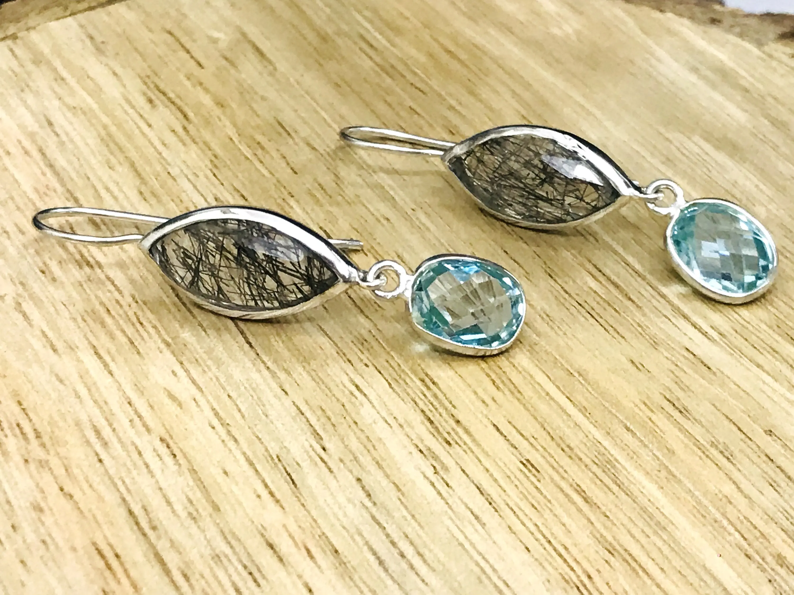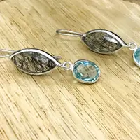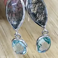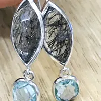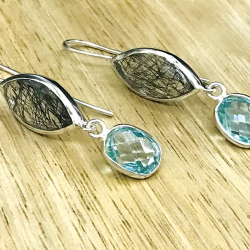 Black Rutile Quartz - Blue Topaz Earrings,,Tourmalinated Quartz ,Rose Cut Rutile Jewelry,Gemini & Taurus Gemstone