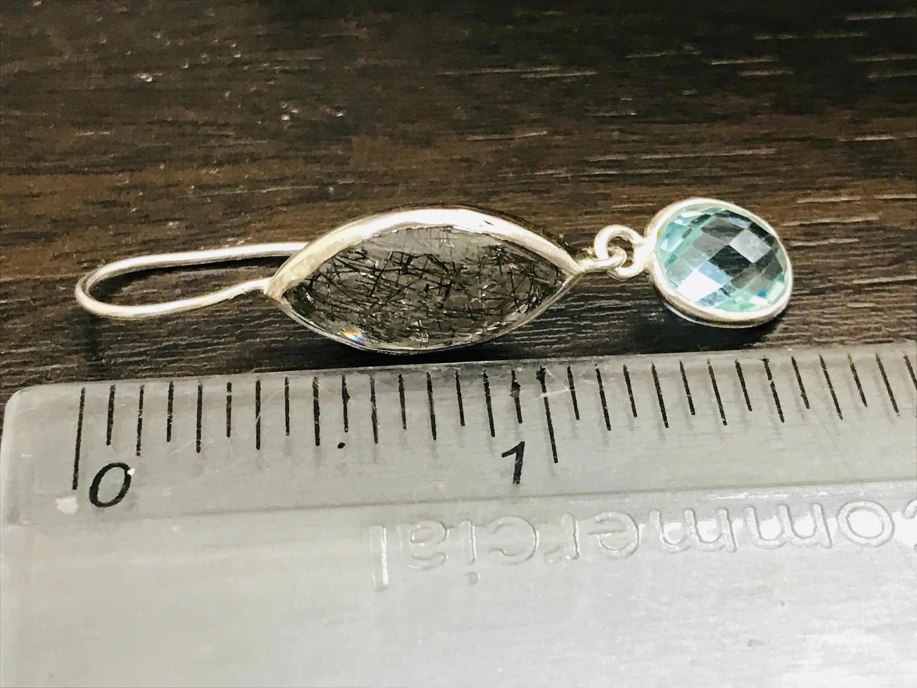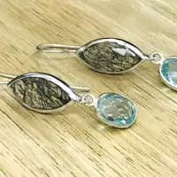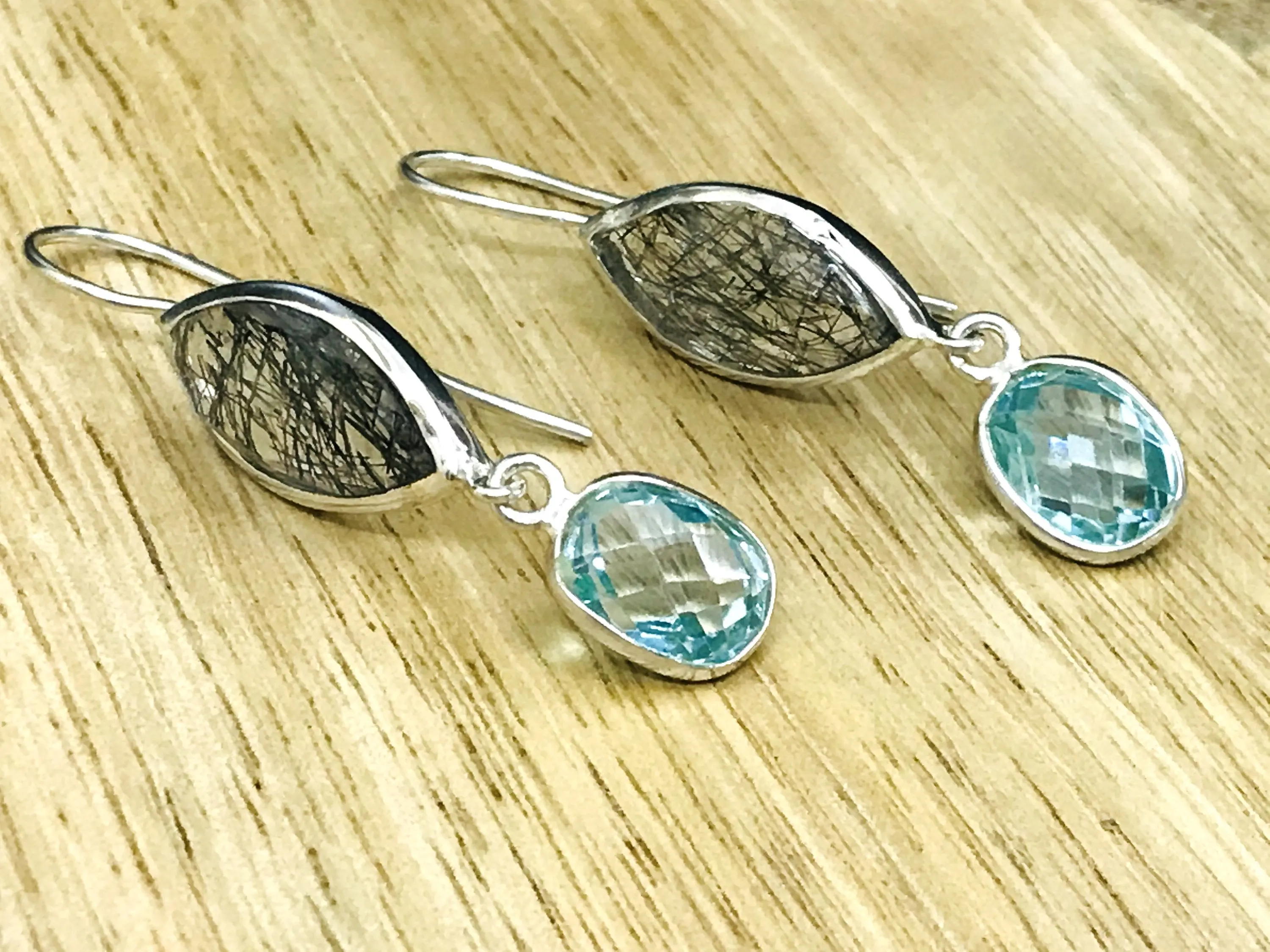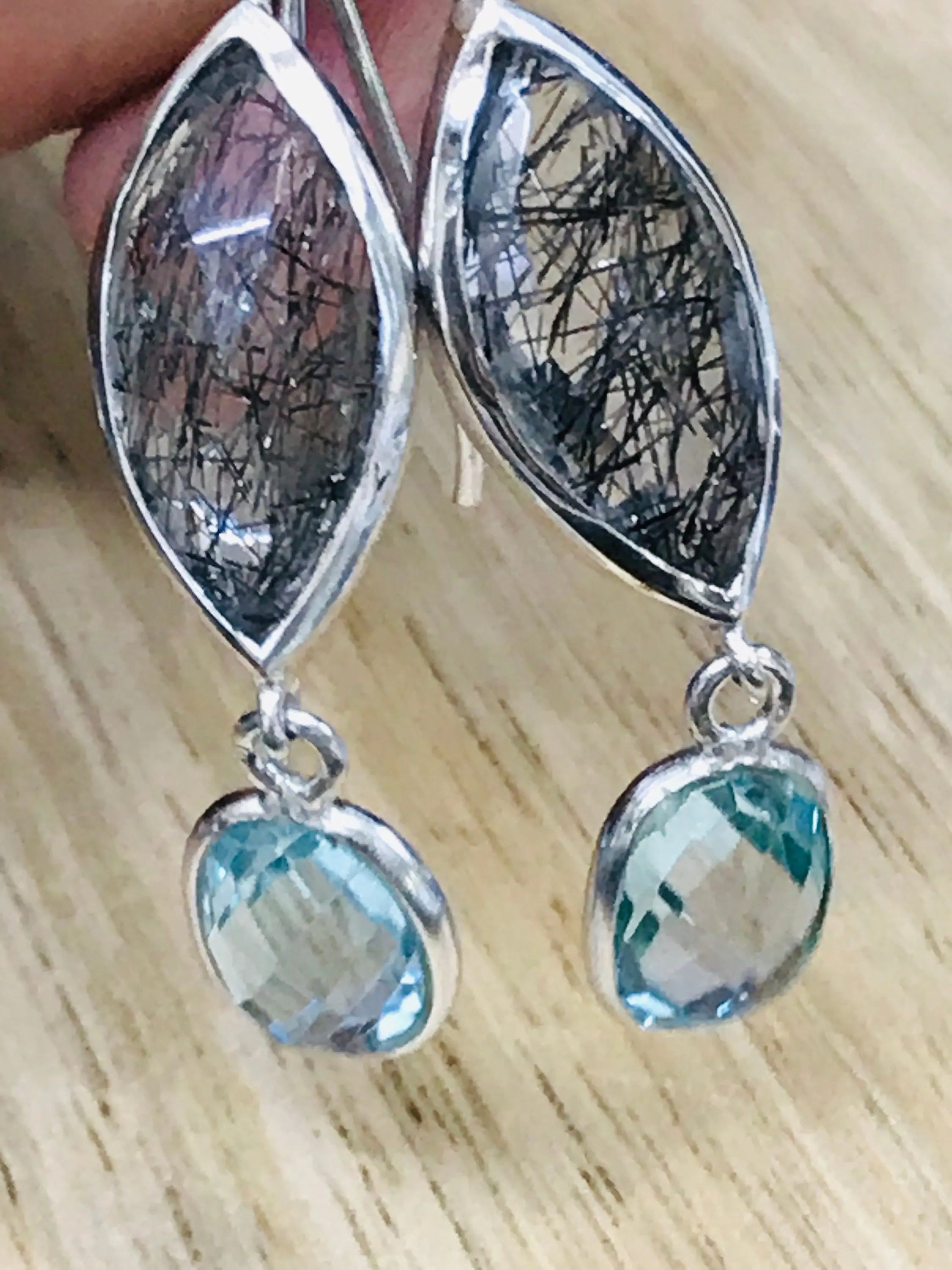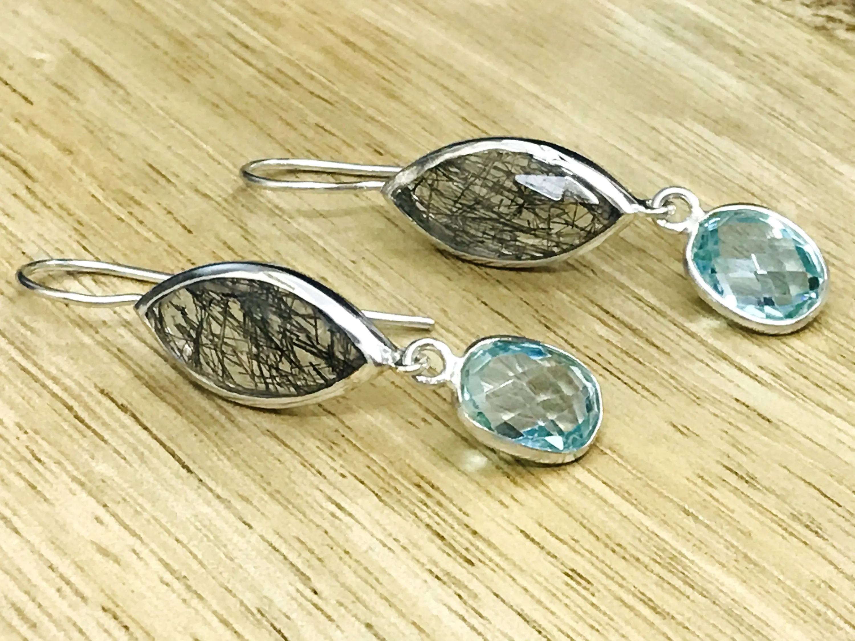 Black Rutile Quartz - Blue Topaz Earrings,,Tourmalinated Quartz ,Rose Cut Rutile Jewelry,Gemini & Taurus Gemstone