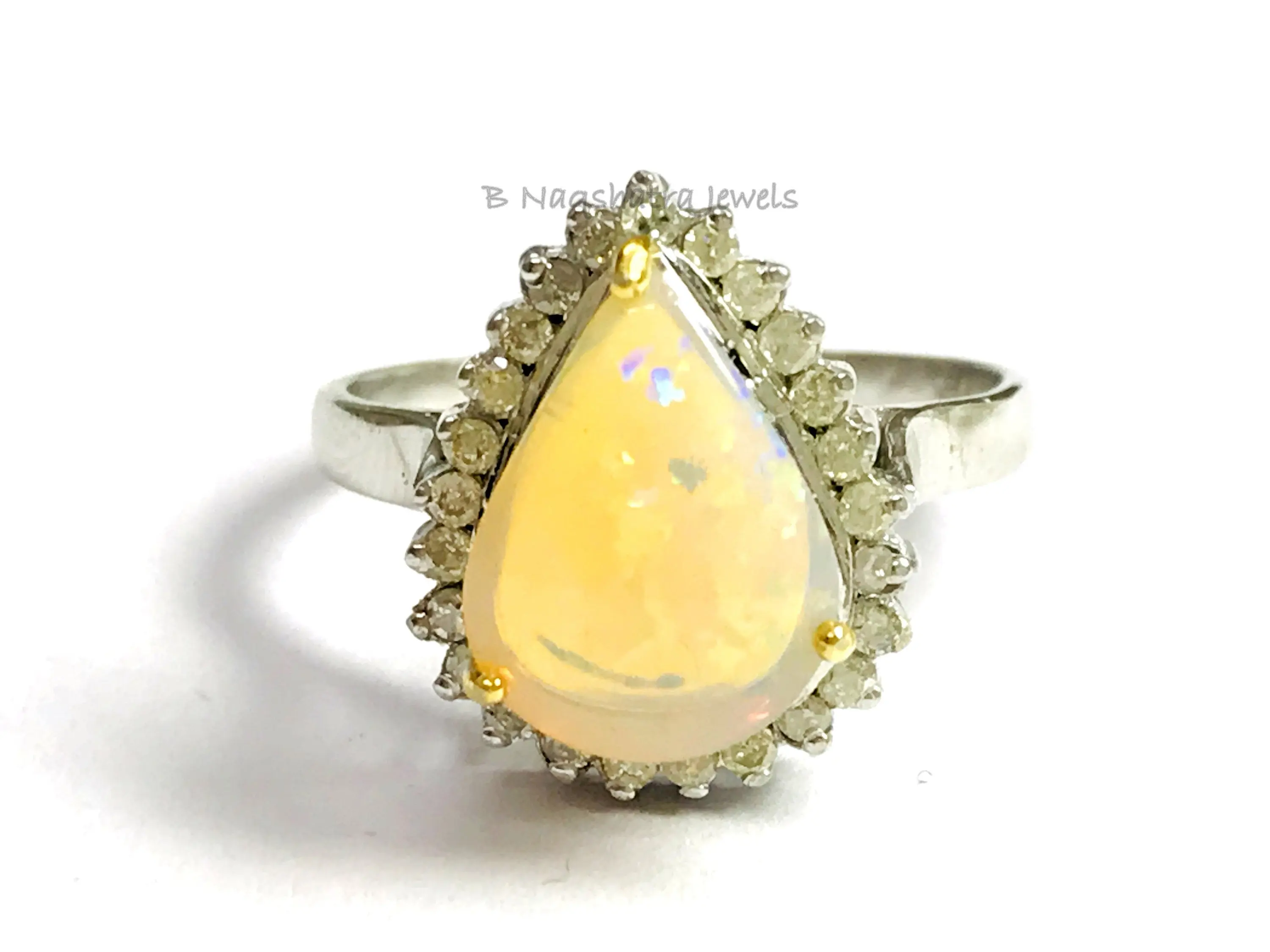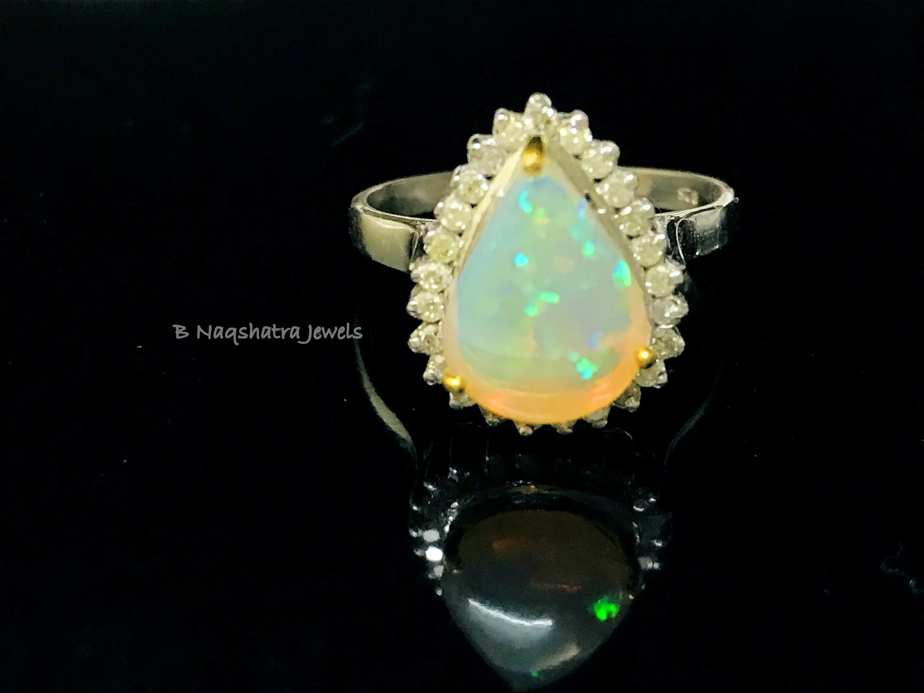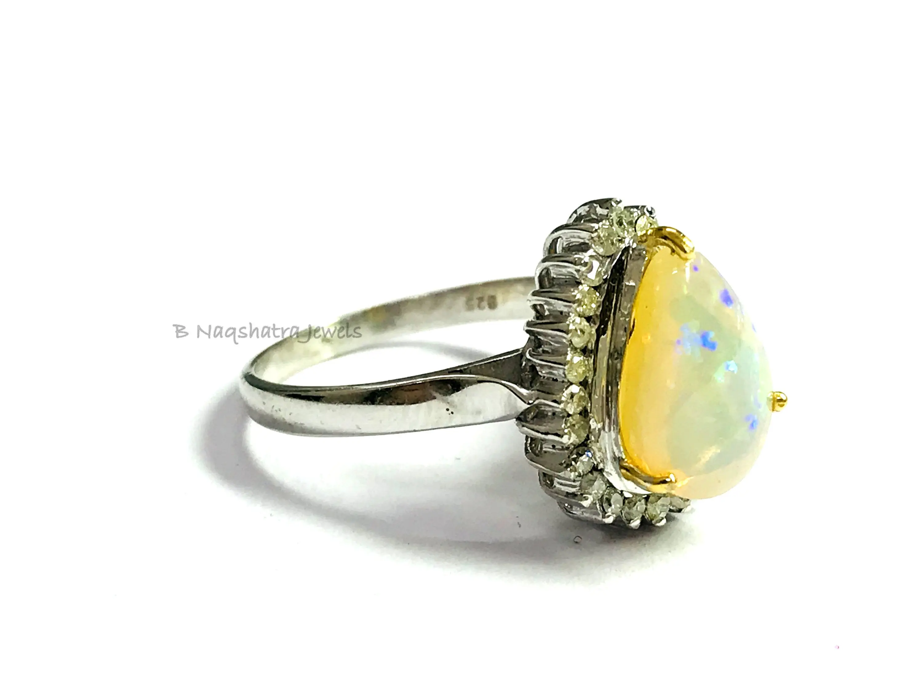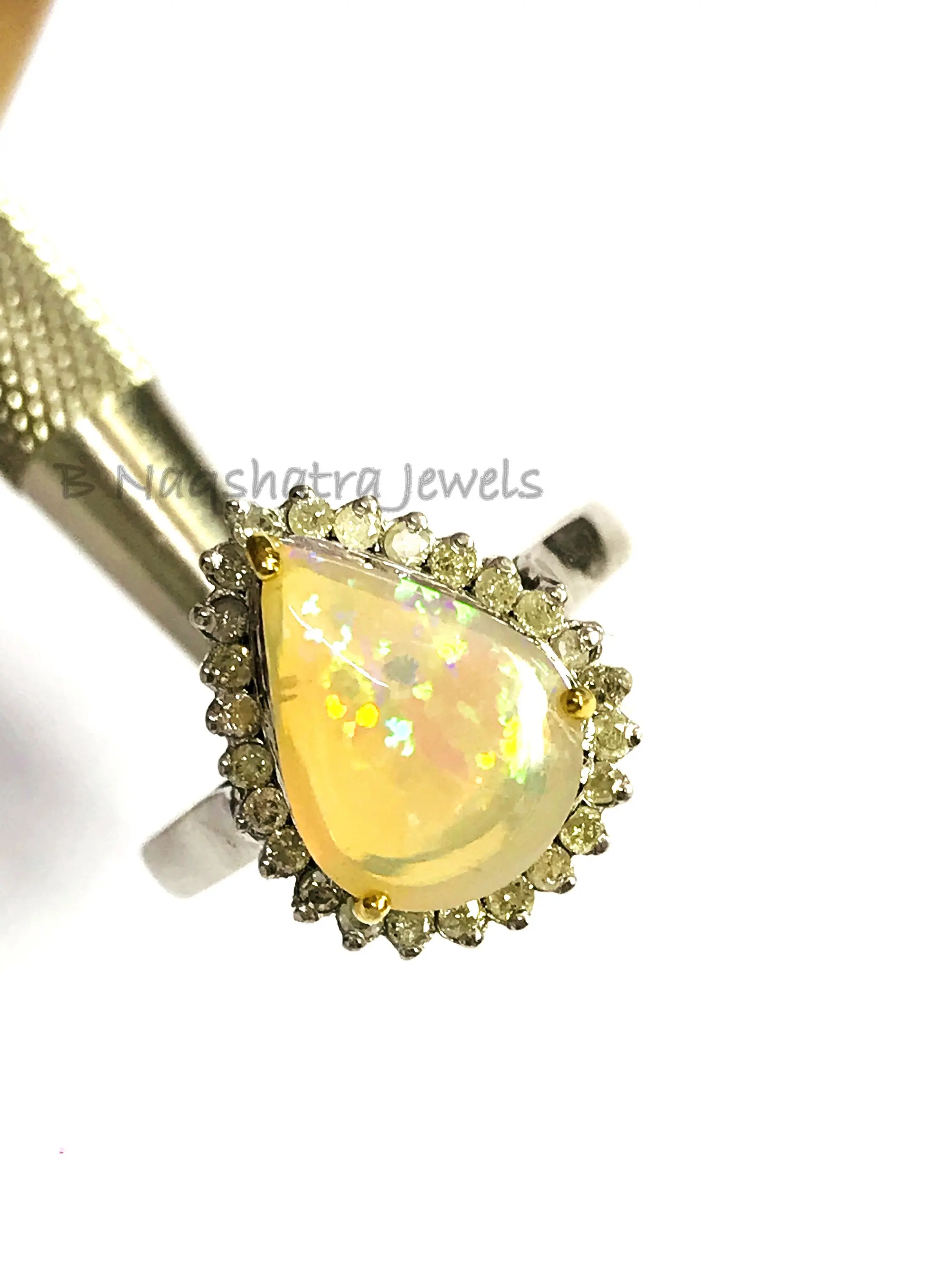 FIRE OPAL DIAMOND Ring,October birthstone ,Welo Opal,Pear Cabochon shape,Promise Ring For Her,Wedding Gift.
