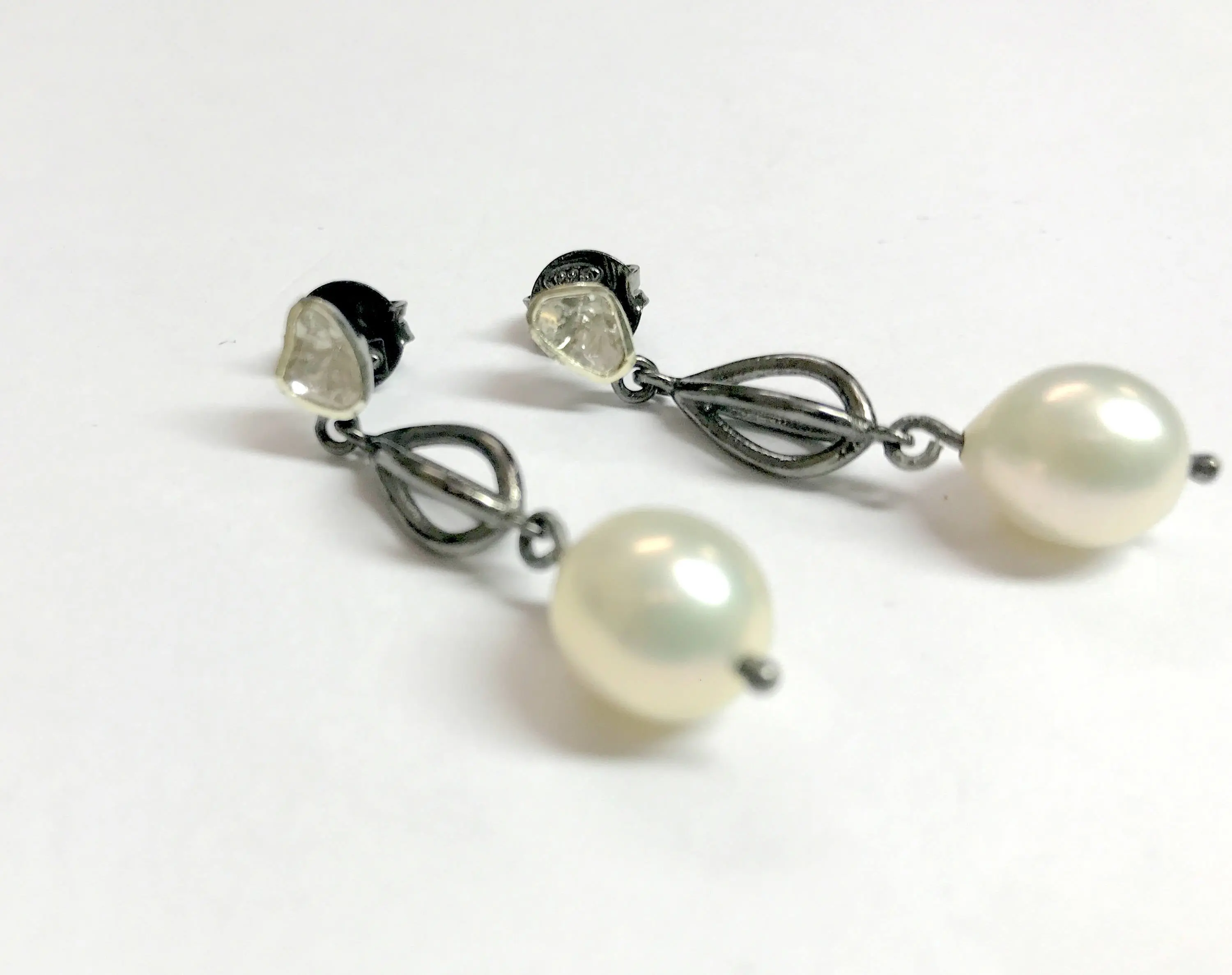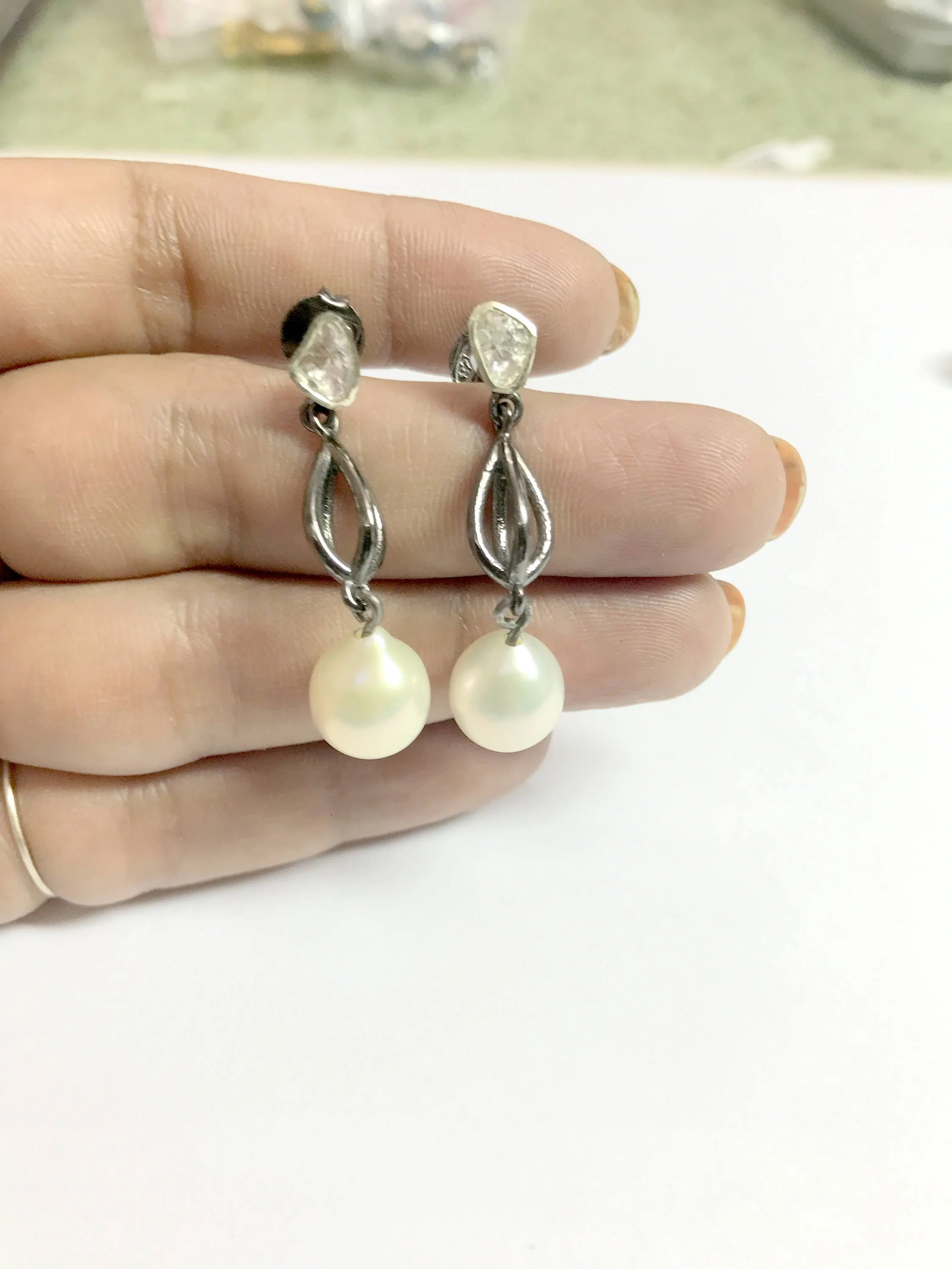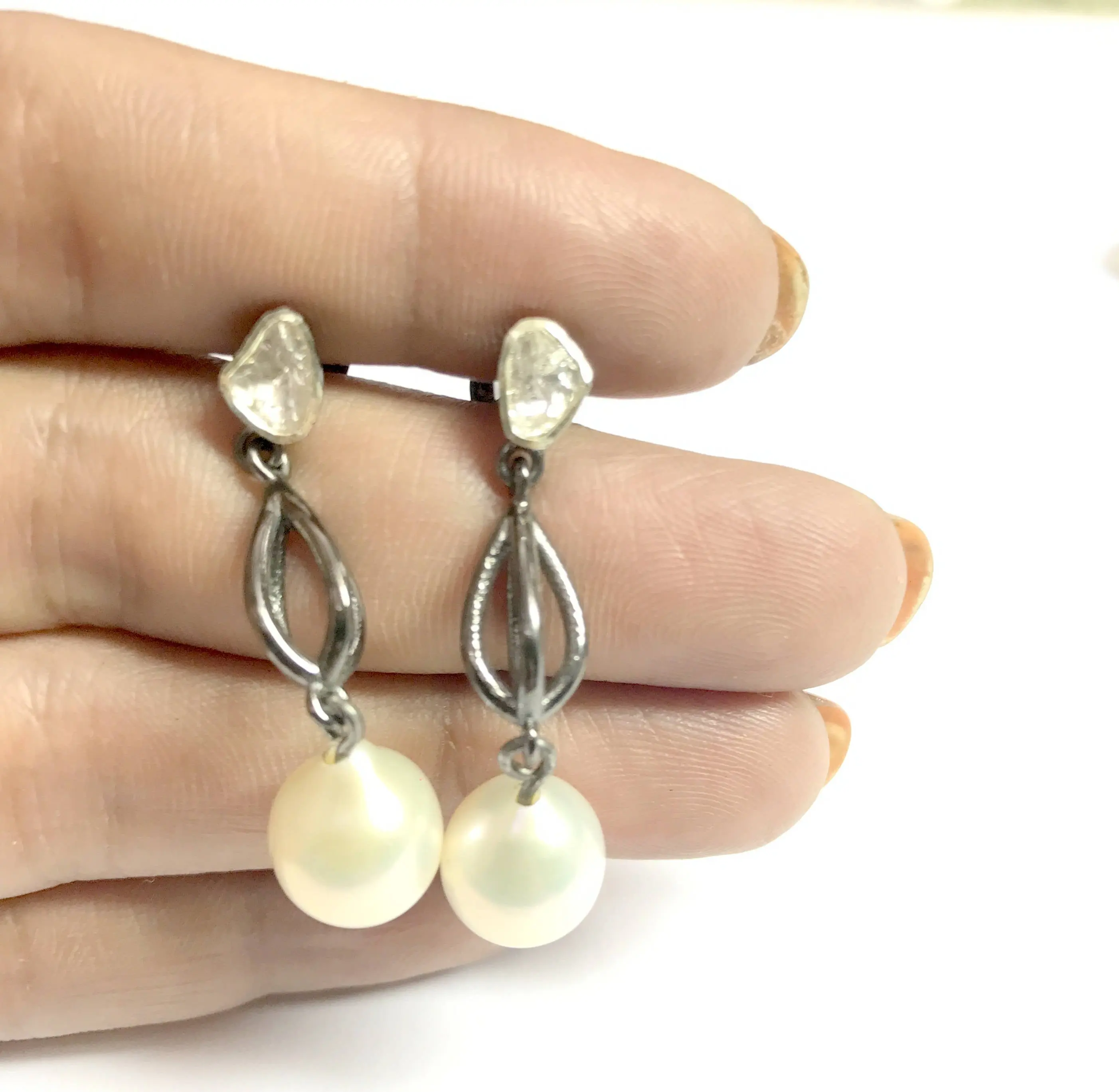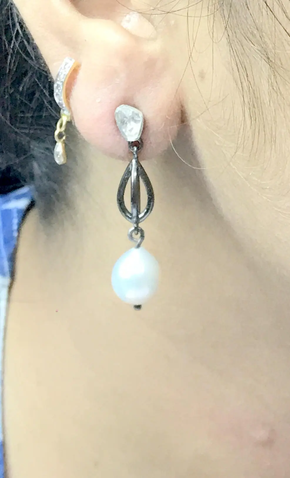 DIAMONDS PEARL EARRINGS in sterling silver,chandeliers,party wear for women, diamond antique earring , drop earrings , pearl earrings