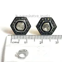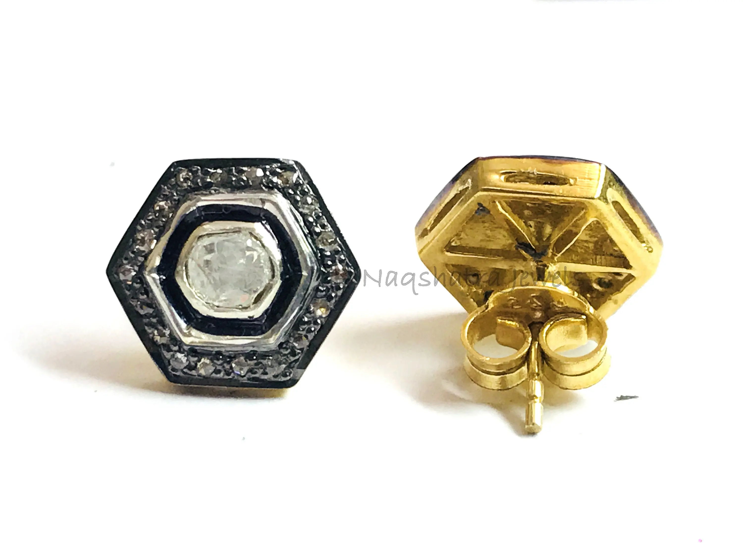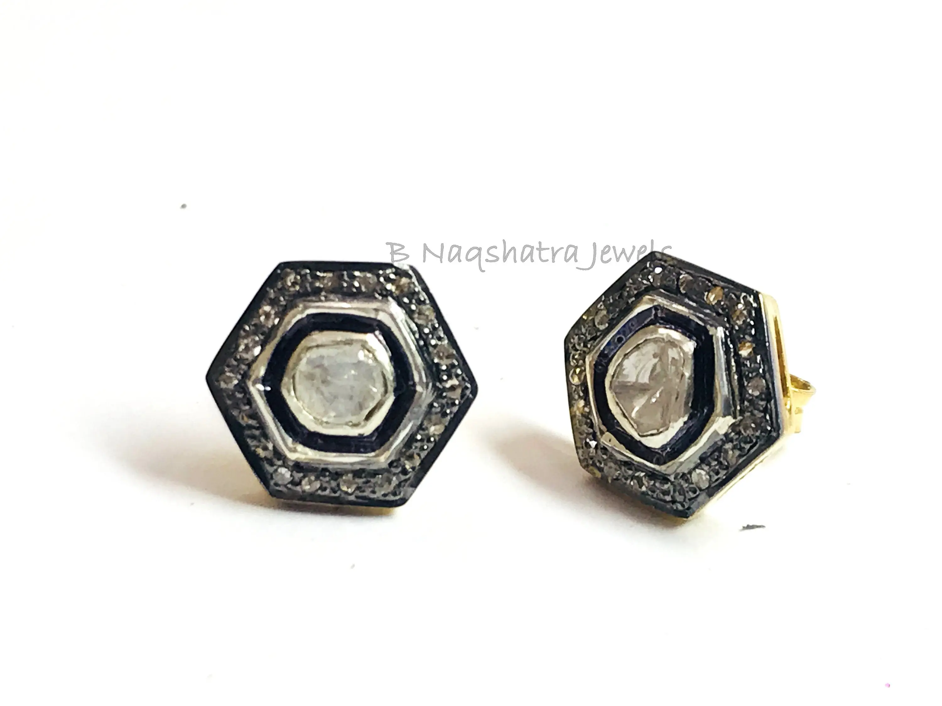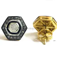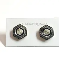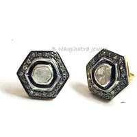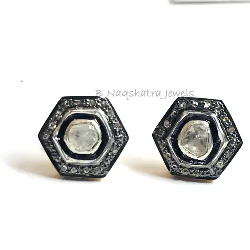HEXAGON SHAPE Fine art Handmade Antique ,natural diamond polkis studs, rose cut diamonds tops, vintage diamonds earrings , handcut diamonds