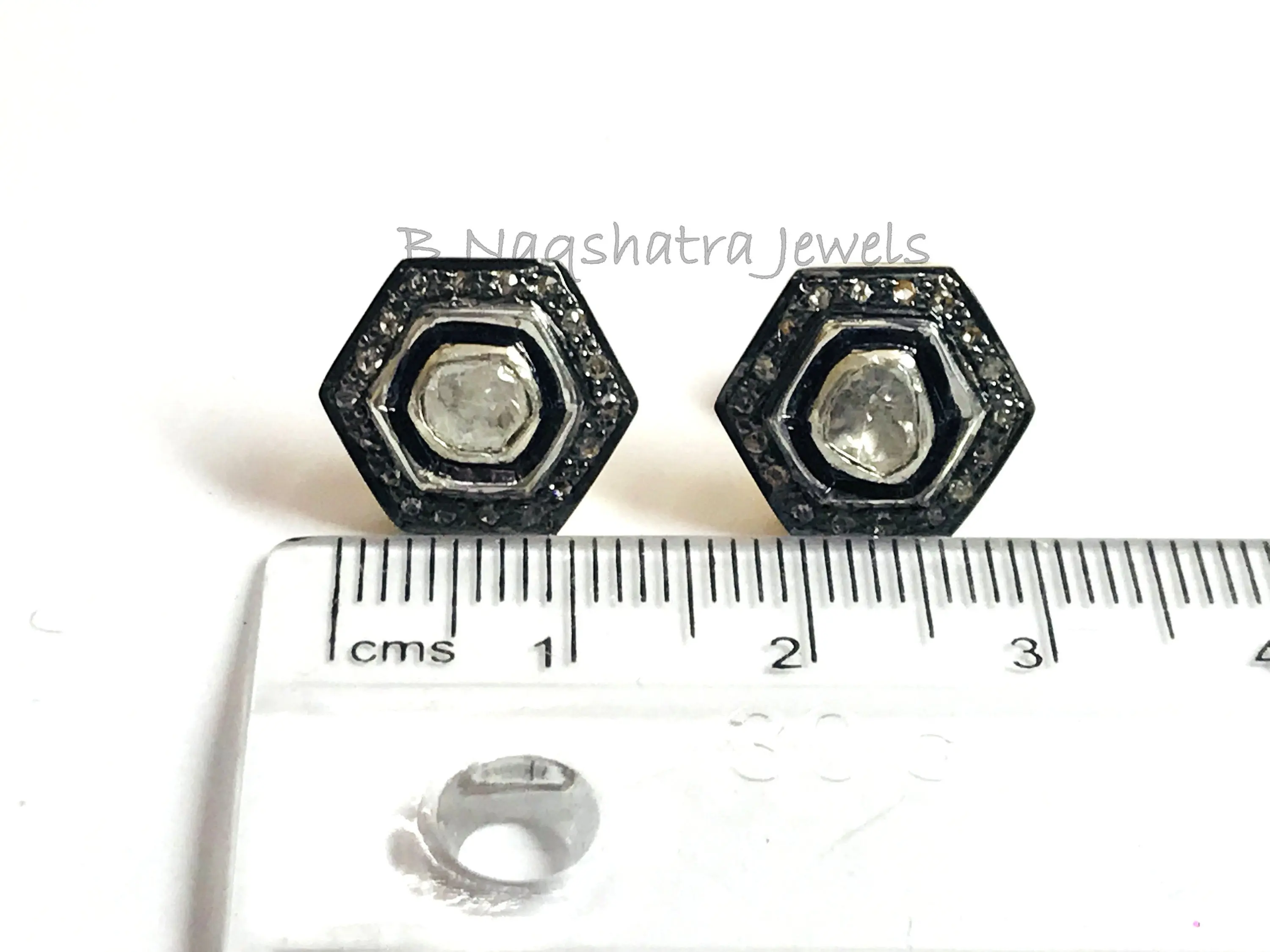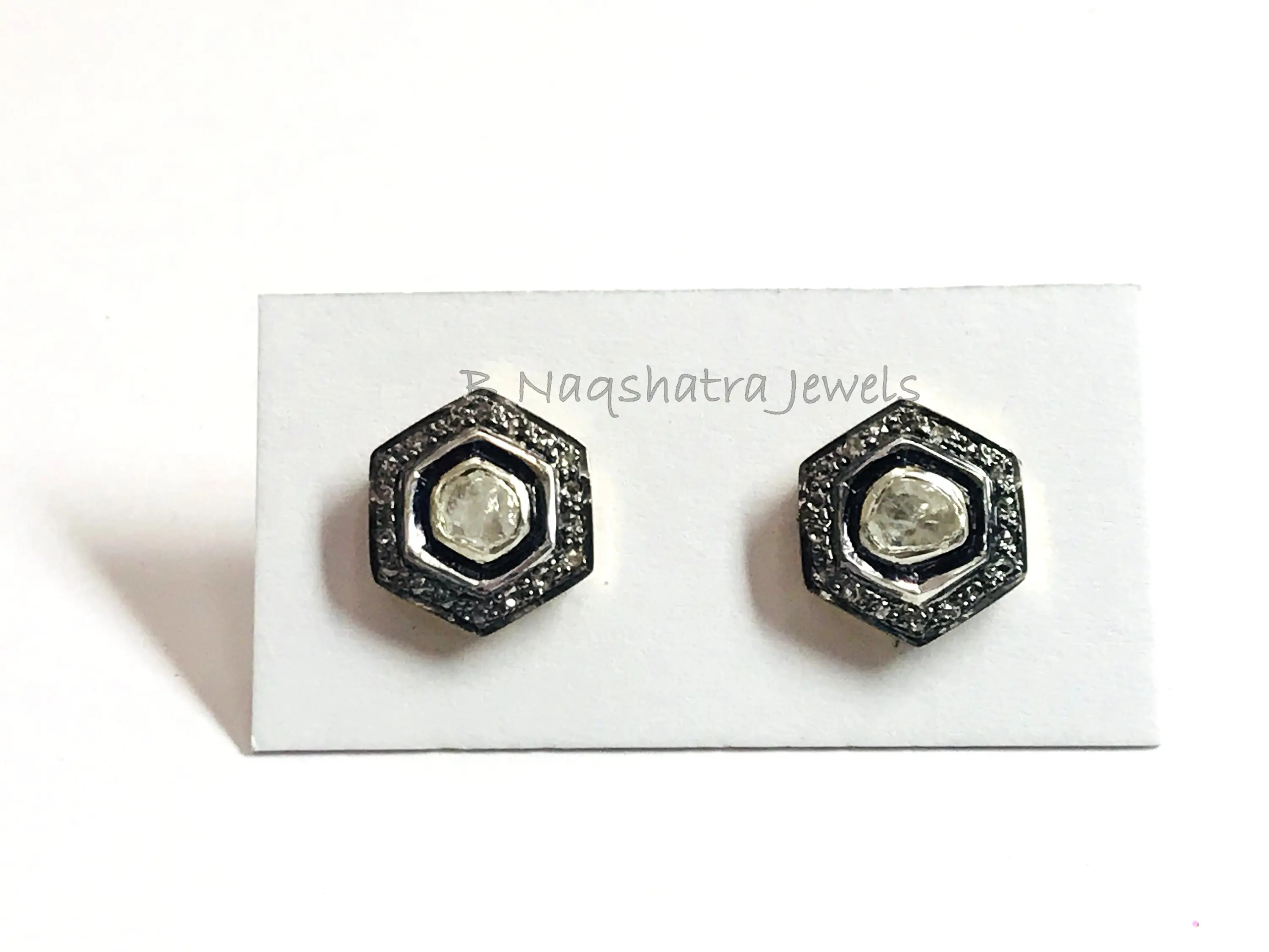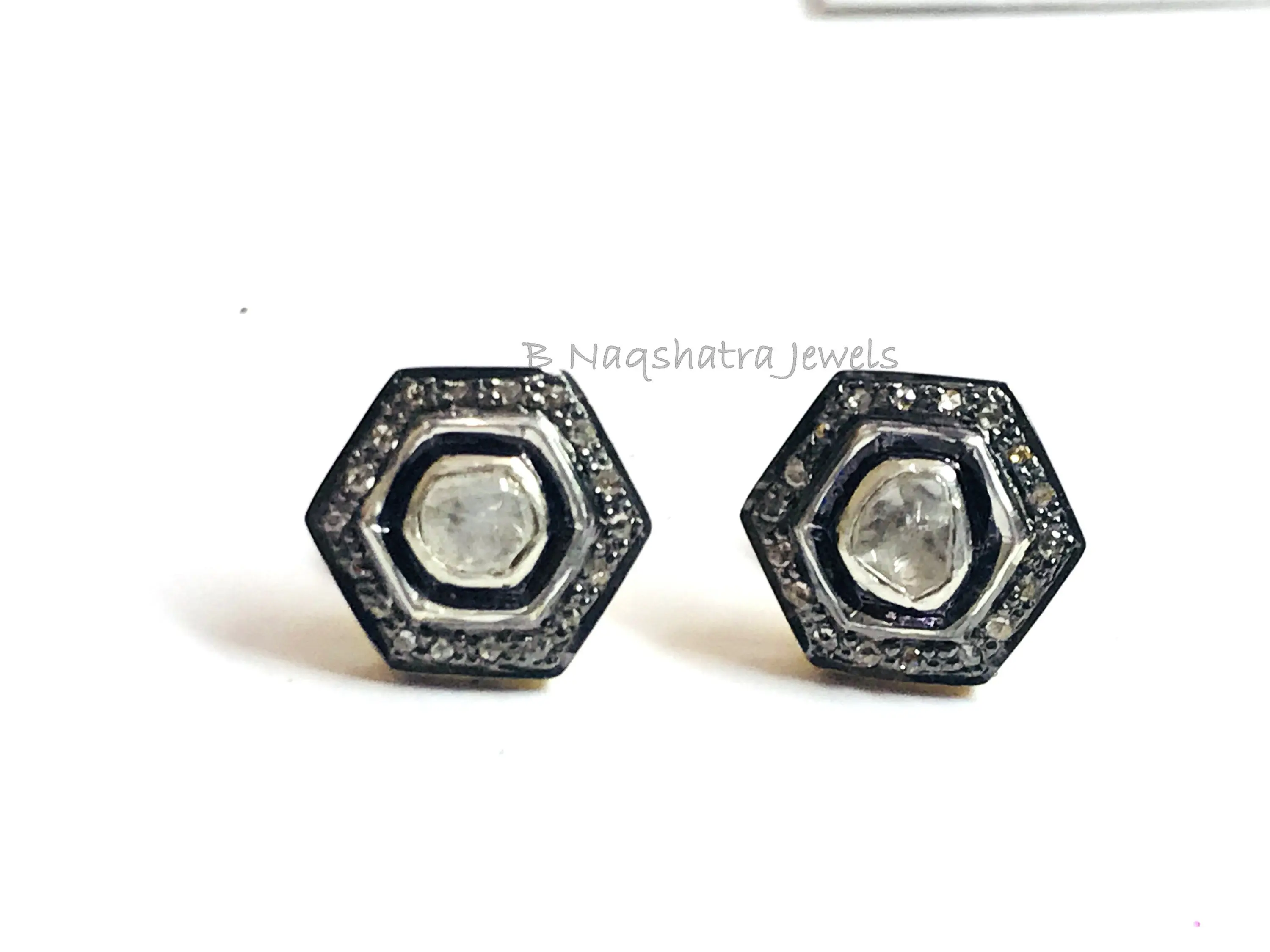 HEXAGON SHAPE Fine art Handmade Antique ,natural diamond polkis studs, rose cut diamonds tops, vintage diamonds earrings , handcut diamonds