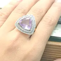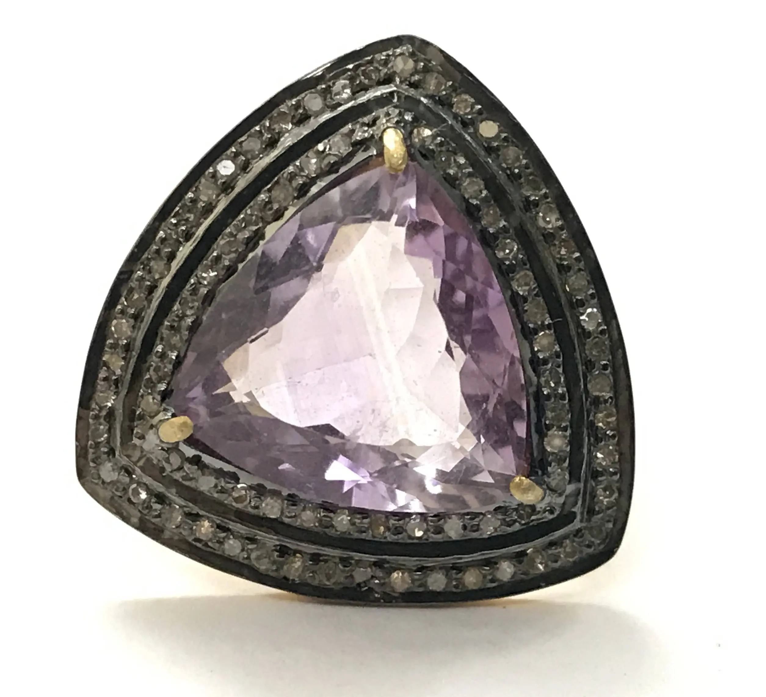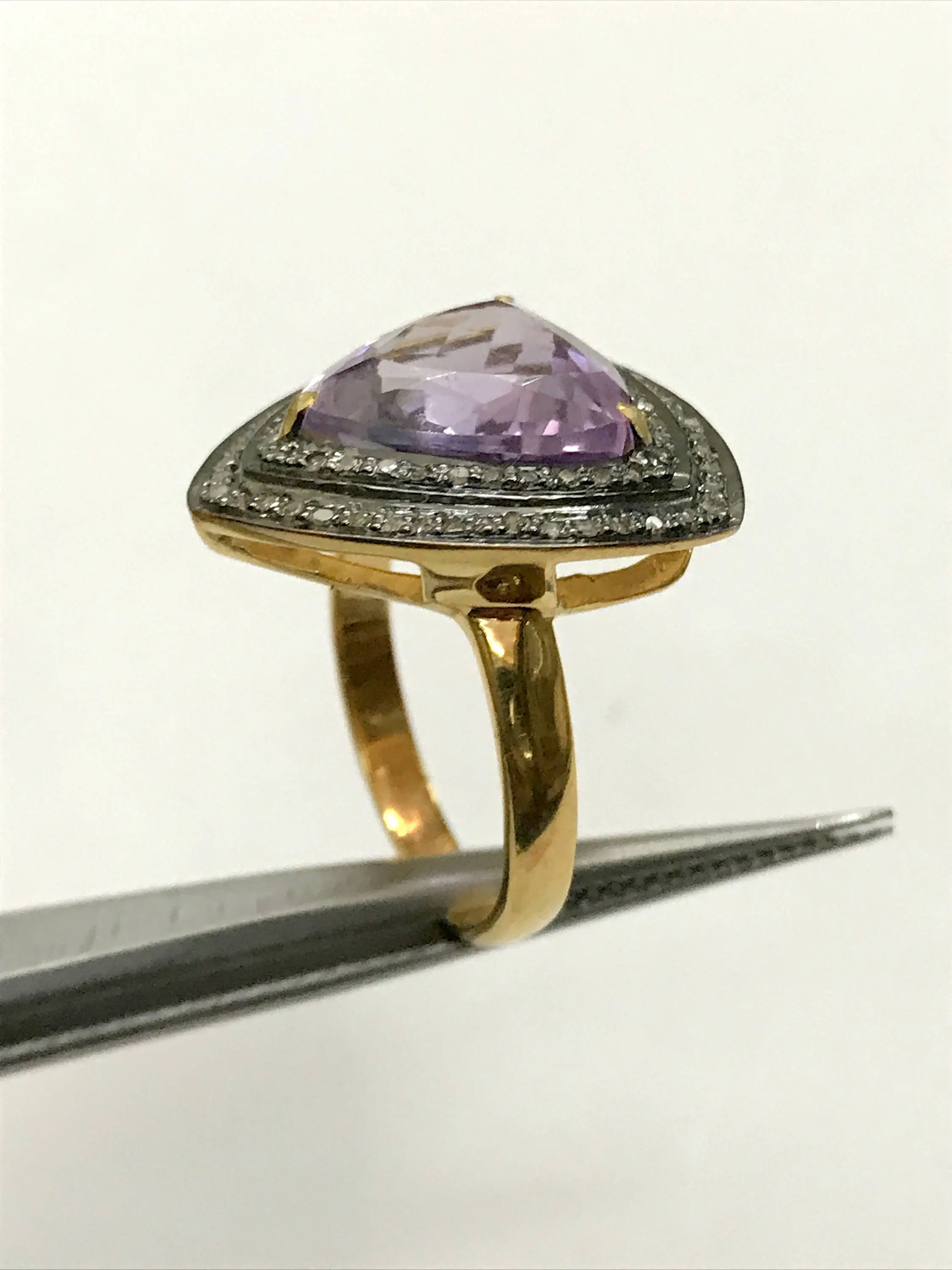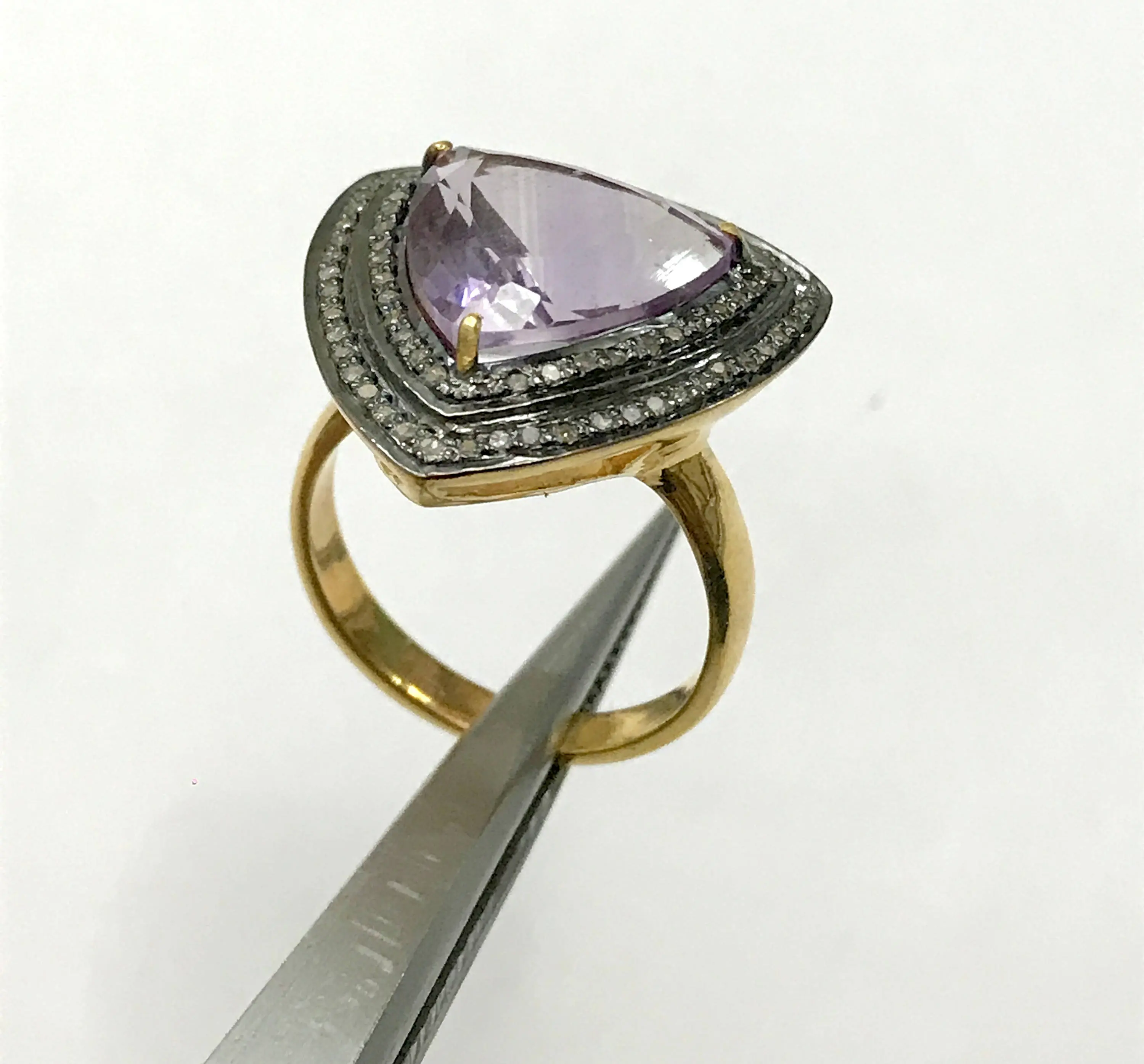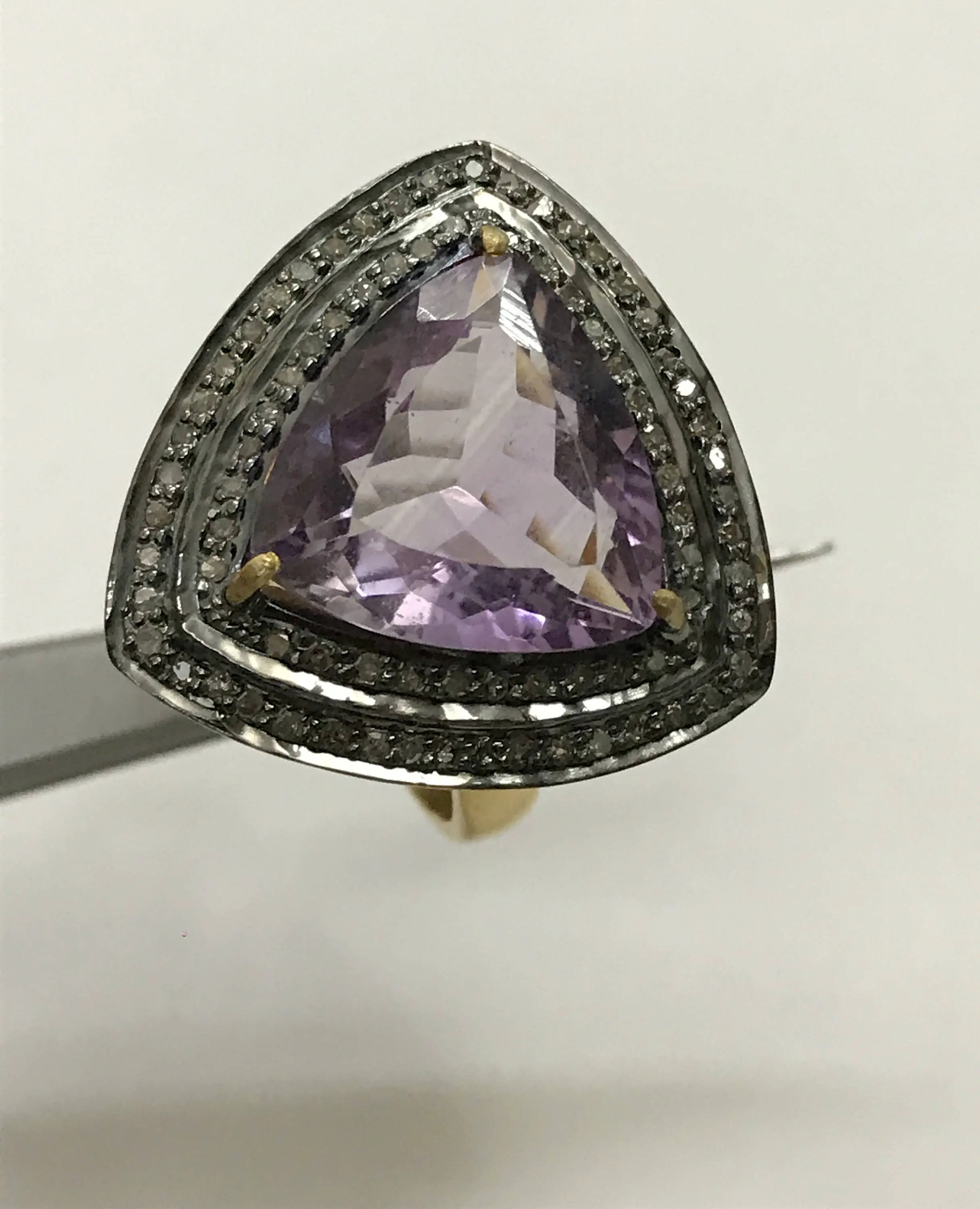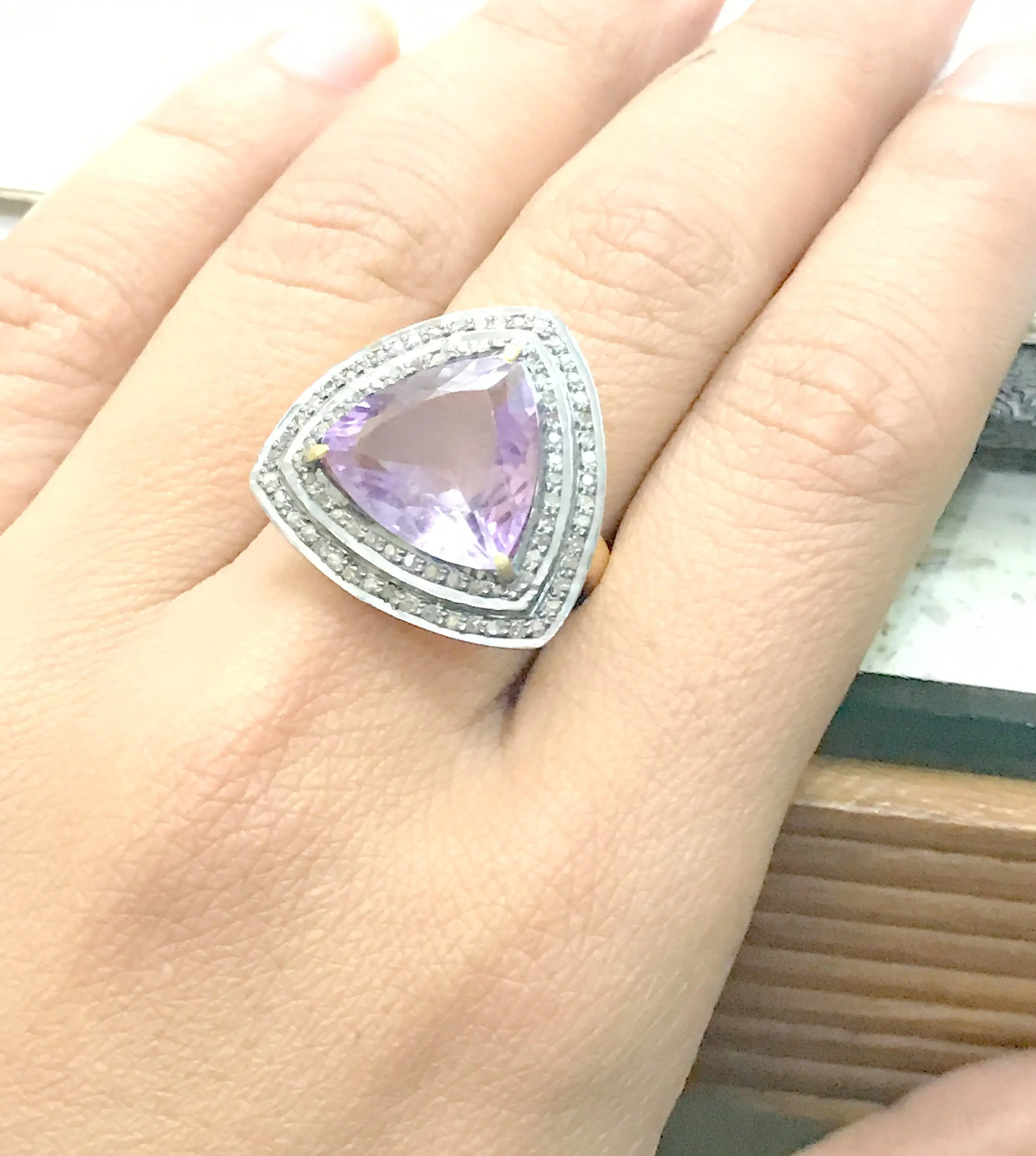 Super fine quality 100% natural silver ring of AFRICAN AMETHYST TRILLIANCE with rose cut diamonds cluster , February birthstone , christmas