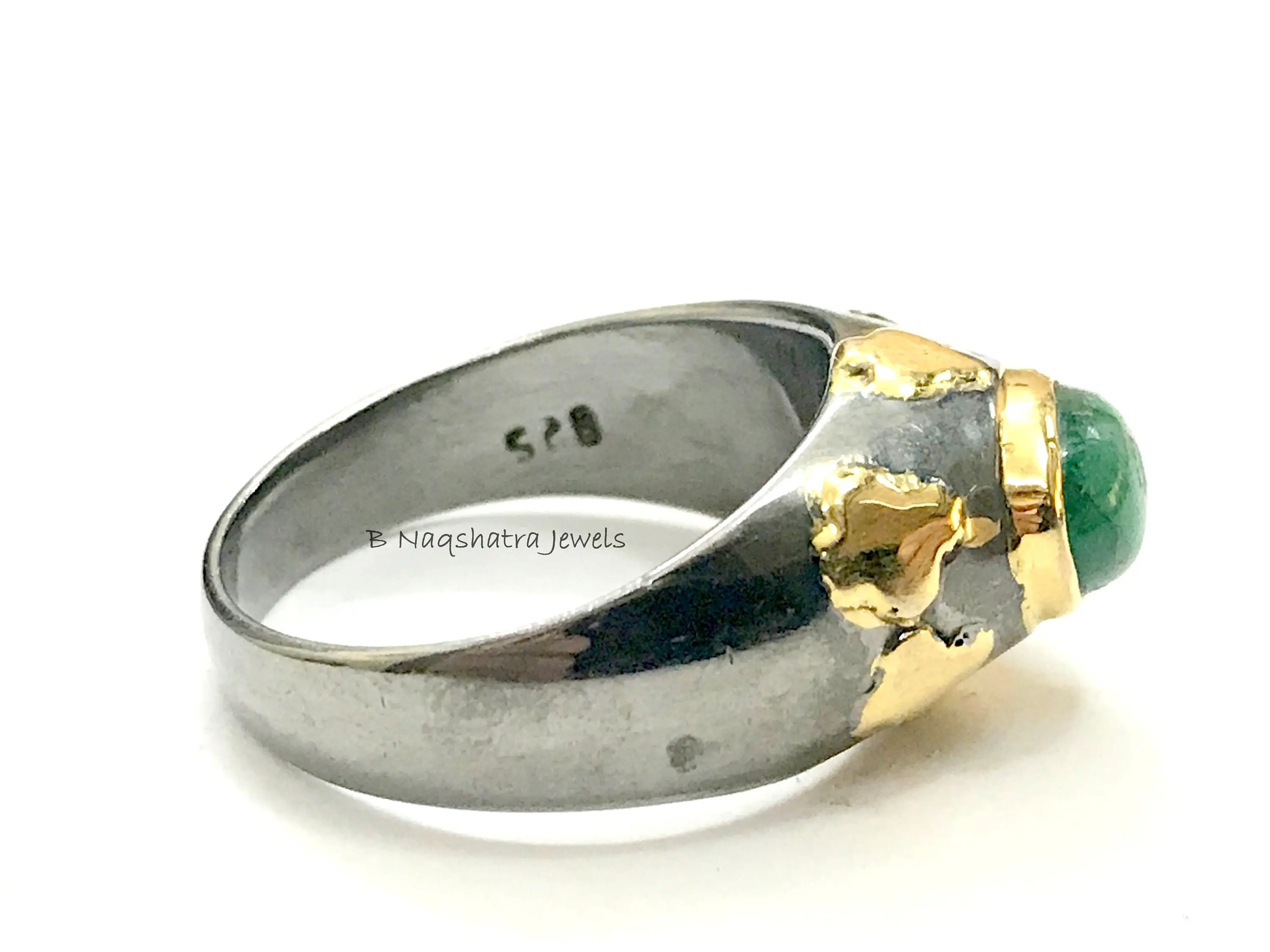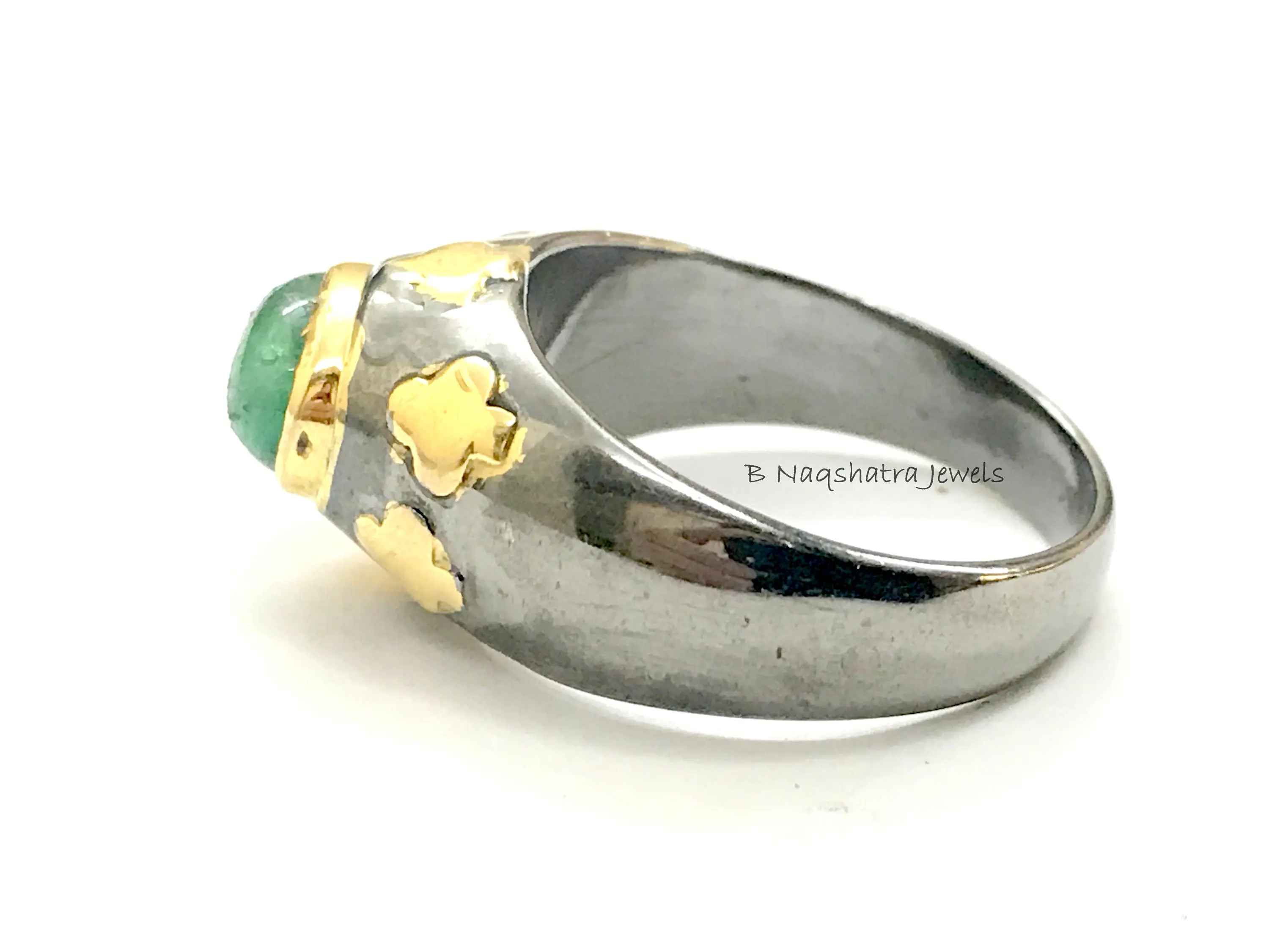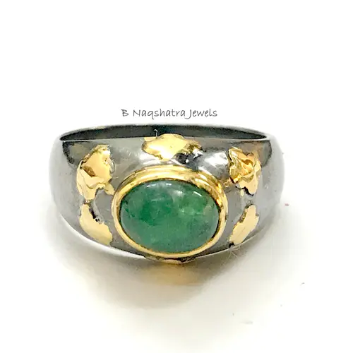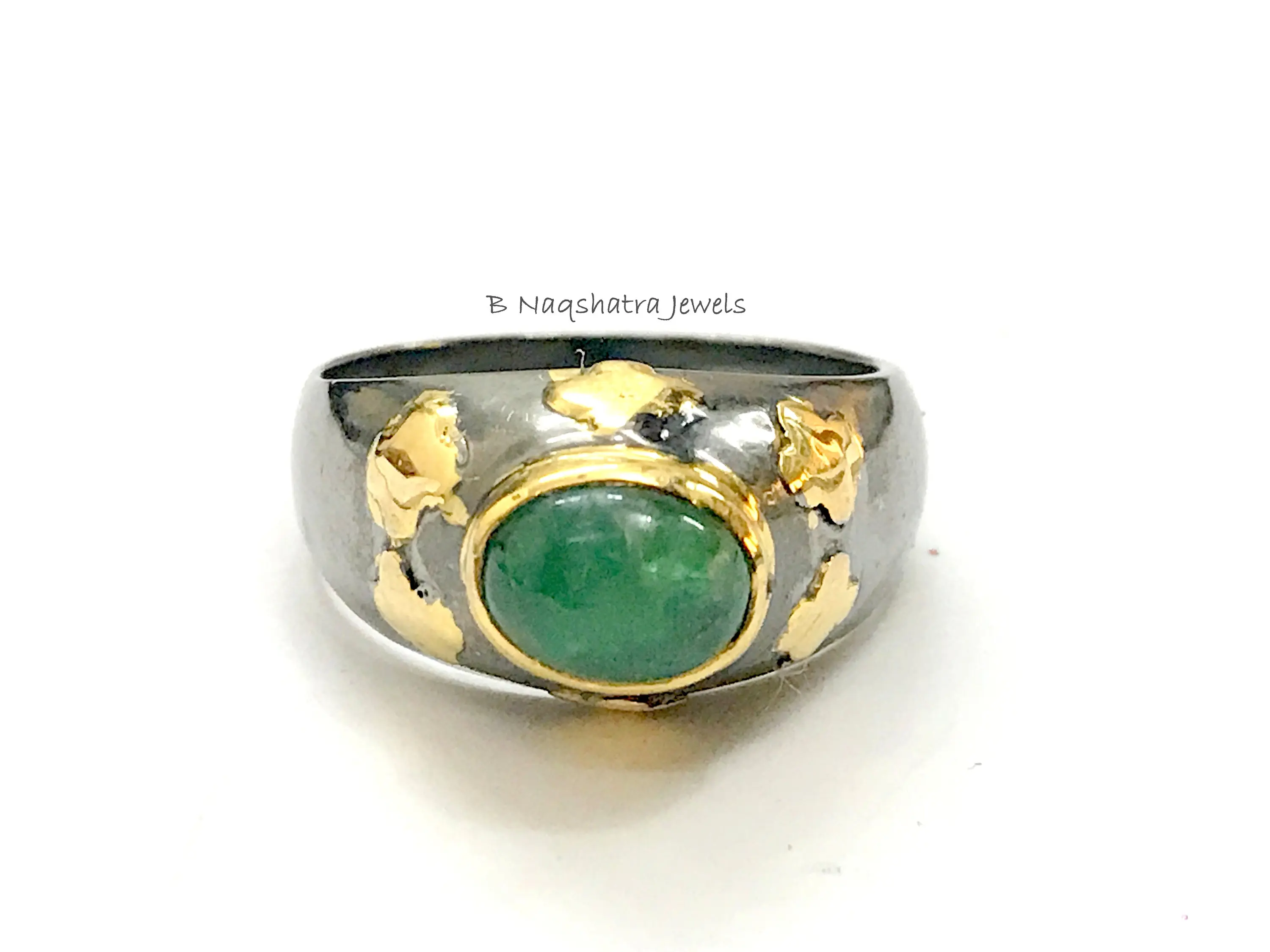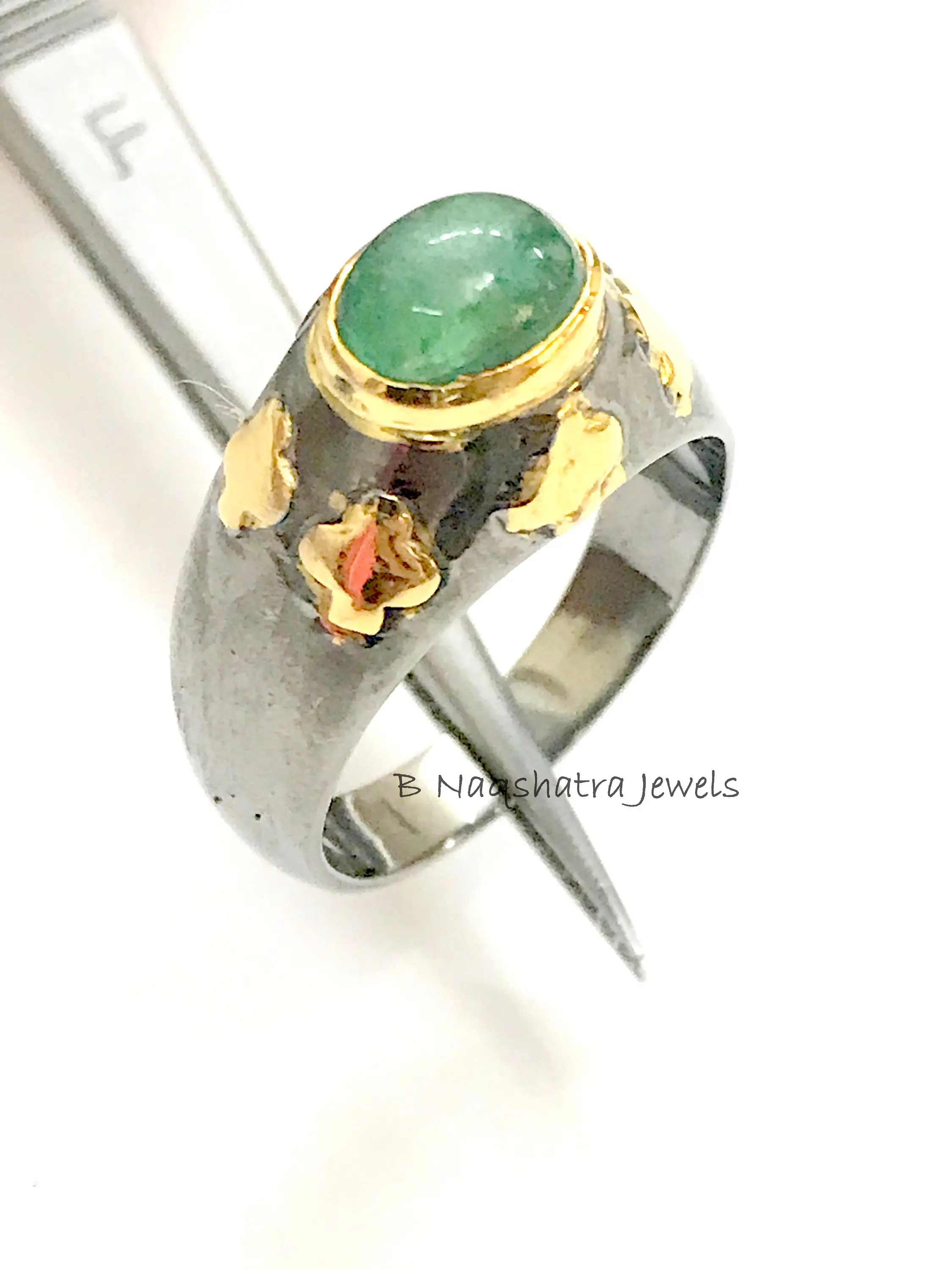 This is a beautifully designed Men's fantasy ring with Natural Genuine Emerald Gemstone in 925 sterling silver and 12k gold embossed leaves.....