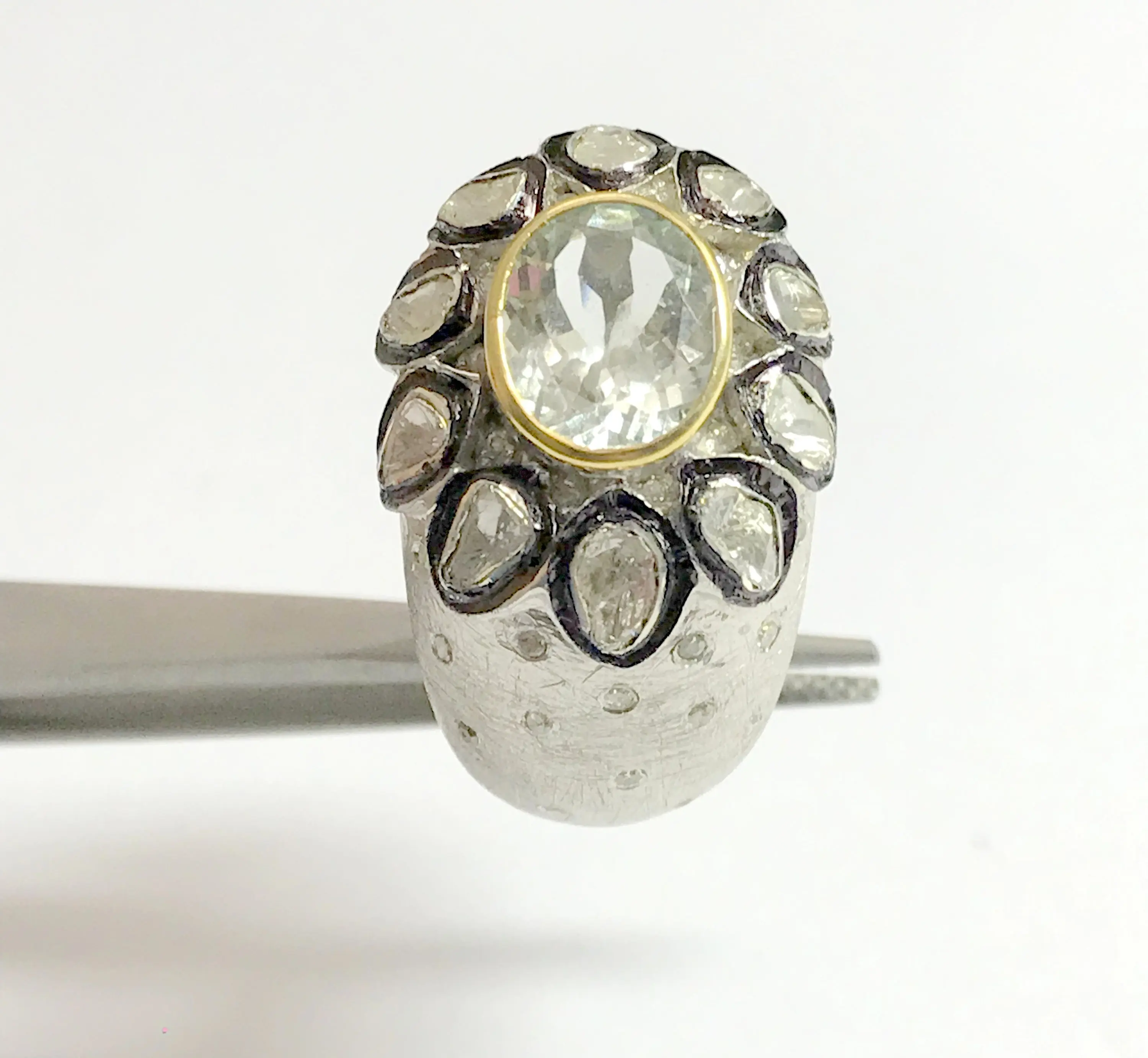NATURAL AQUAMARINE DIAMONDS Ring , 925 sterling silver ring,Diamonds Polki,Hand-forged,Cocktail Ring.