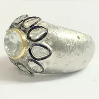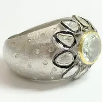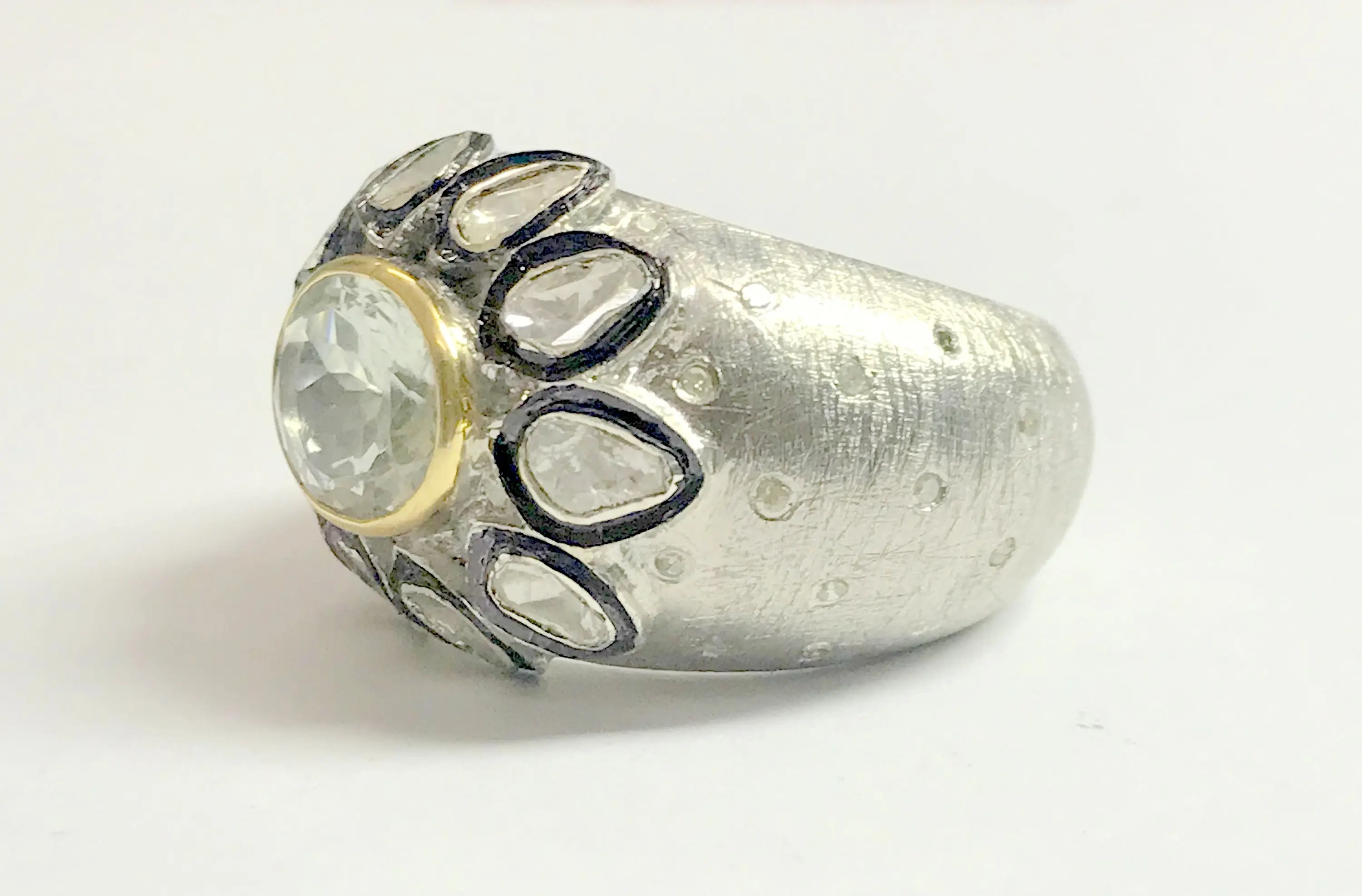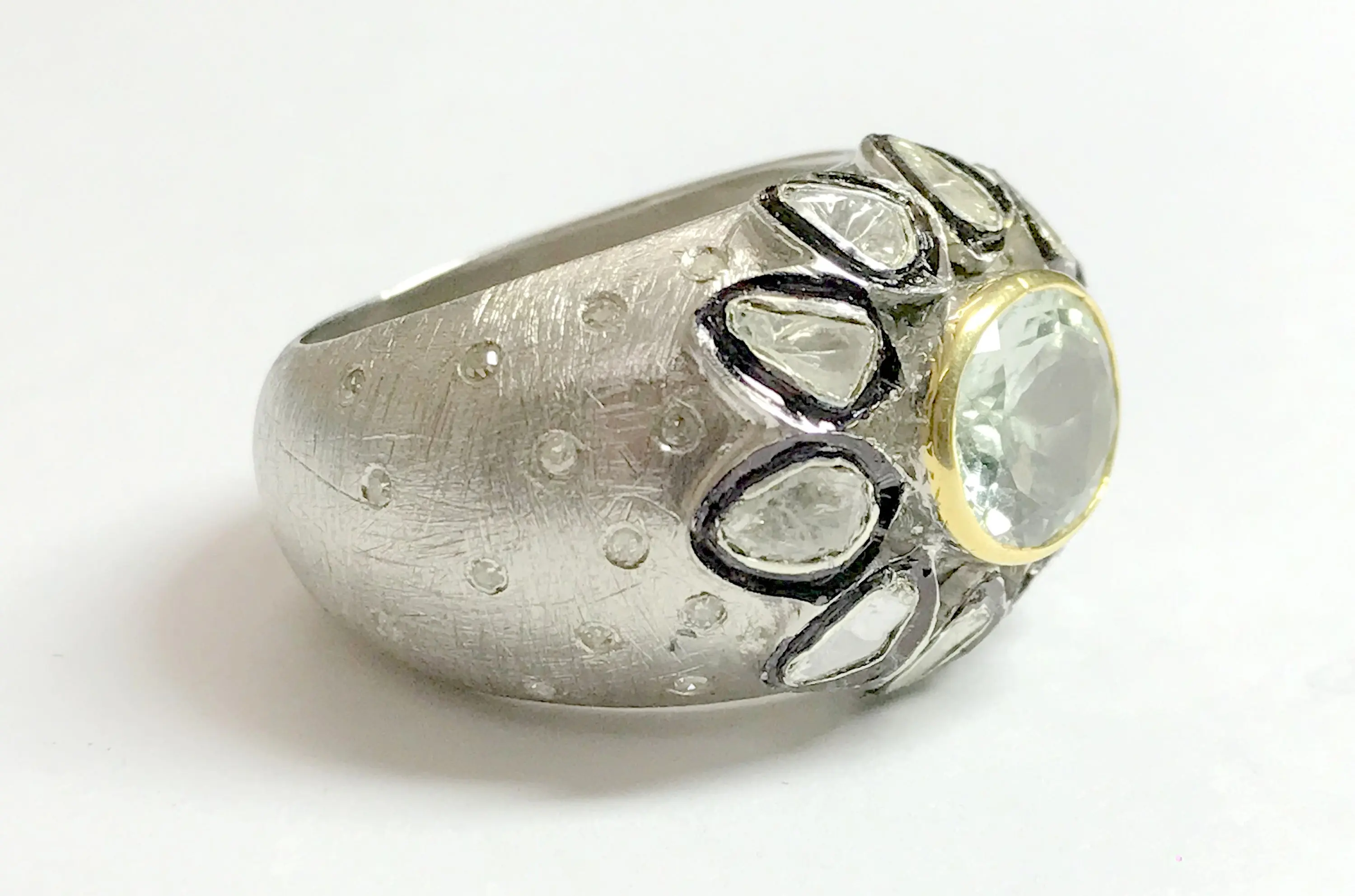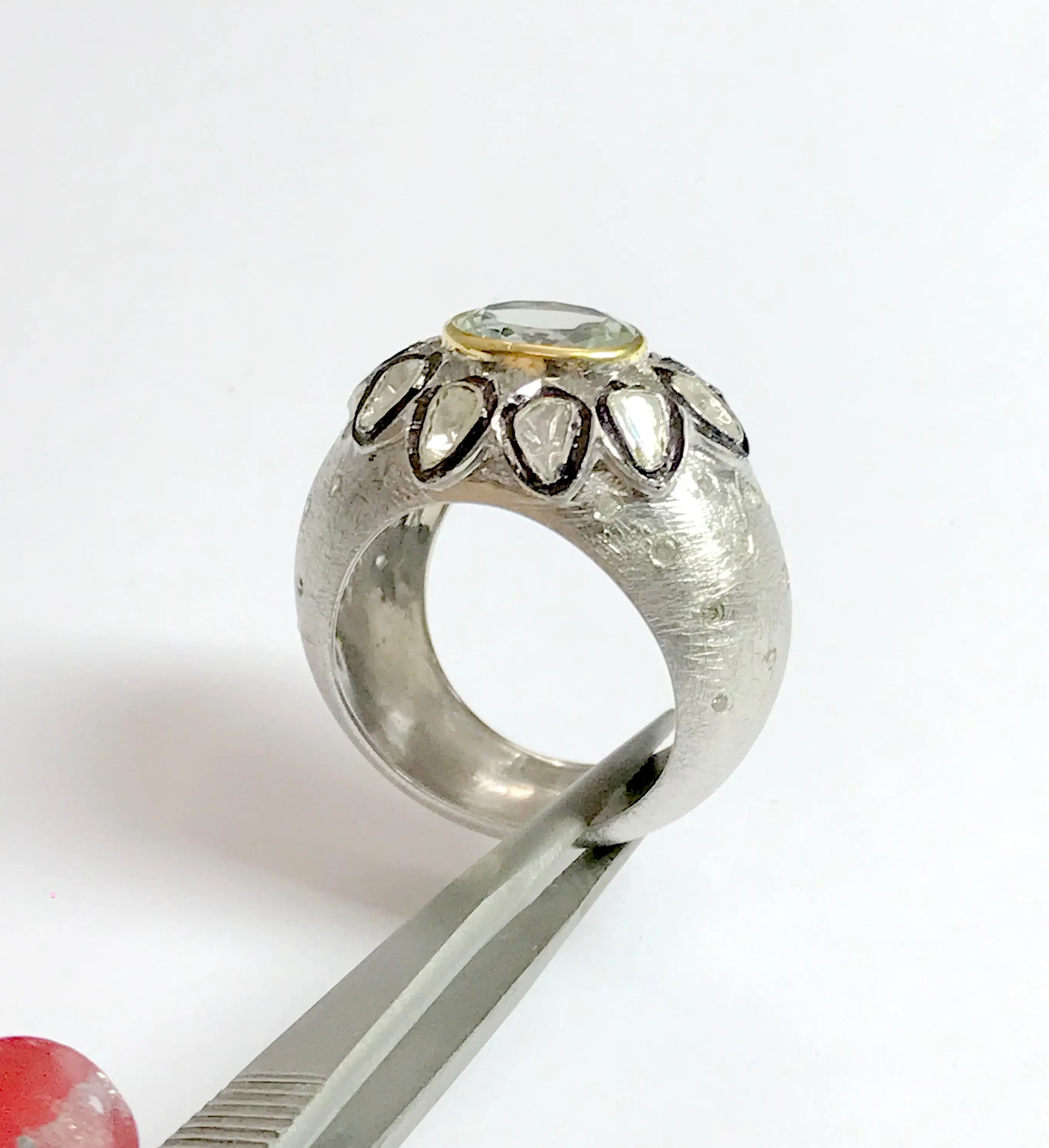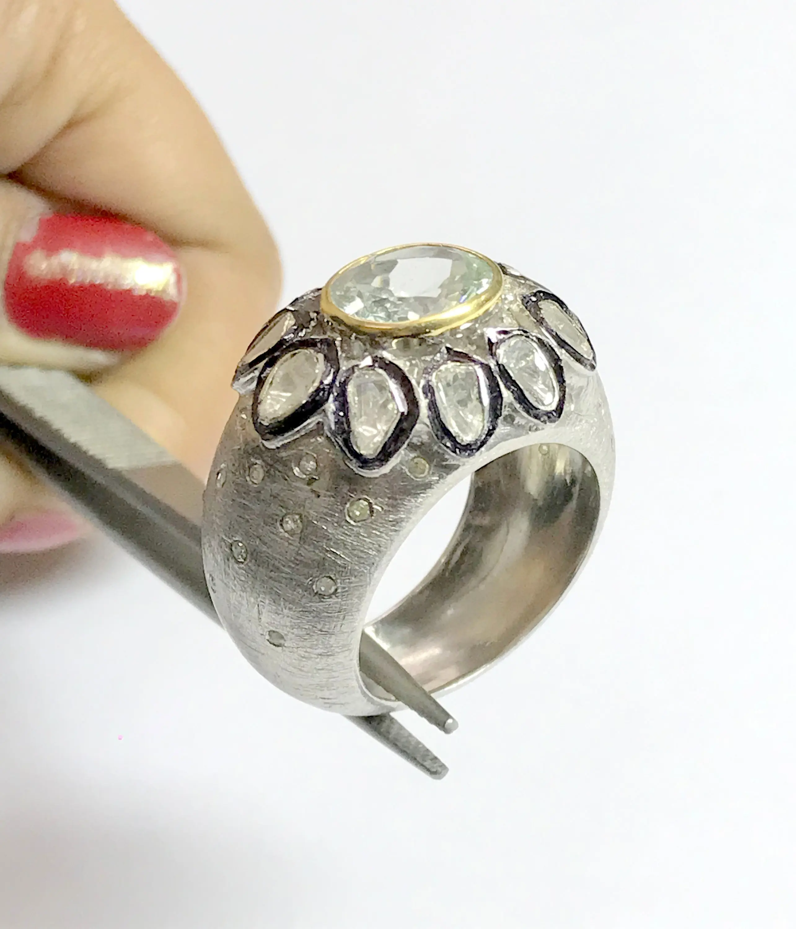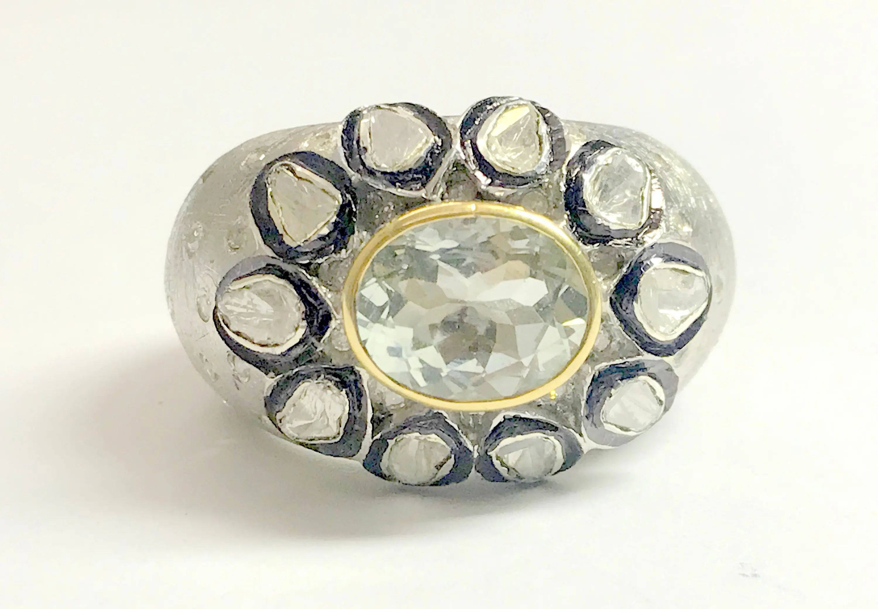 NATURAL AQUAMARINE DIAMONDS 925 sterling silver ring , Diamonds Polkis , Hand-forged , Matte Finish , Flush Setting Diamonds ,Cocktail Ring