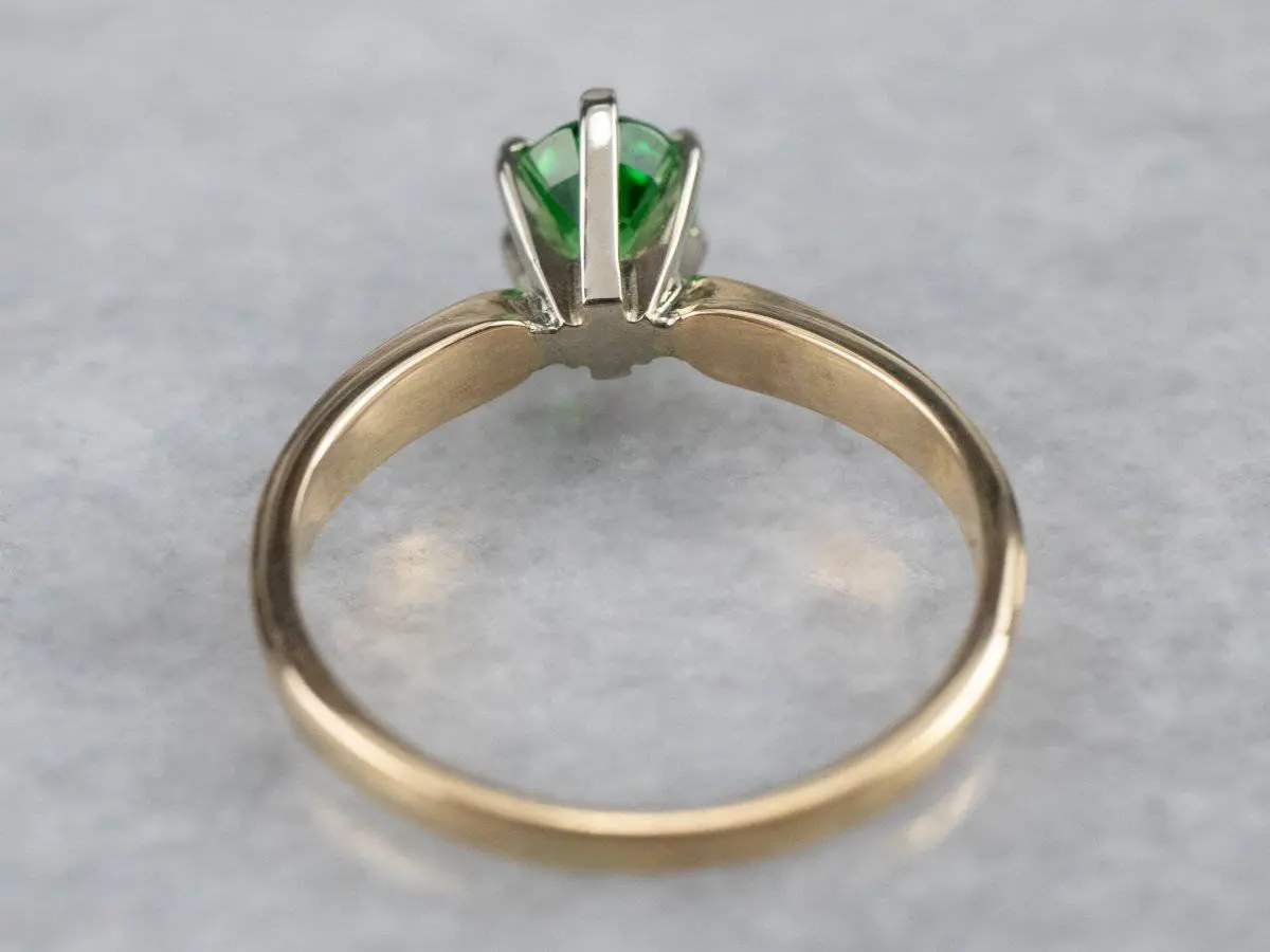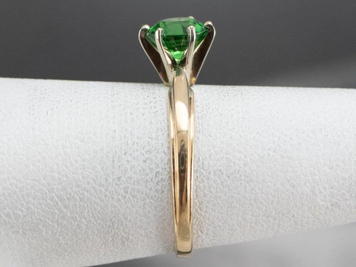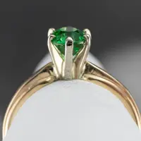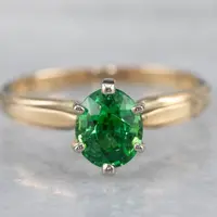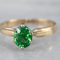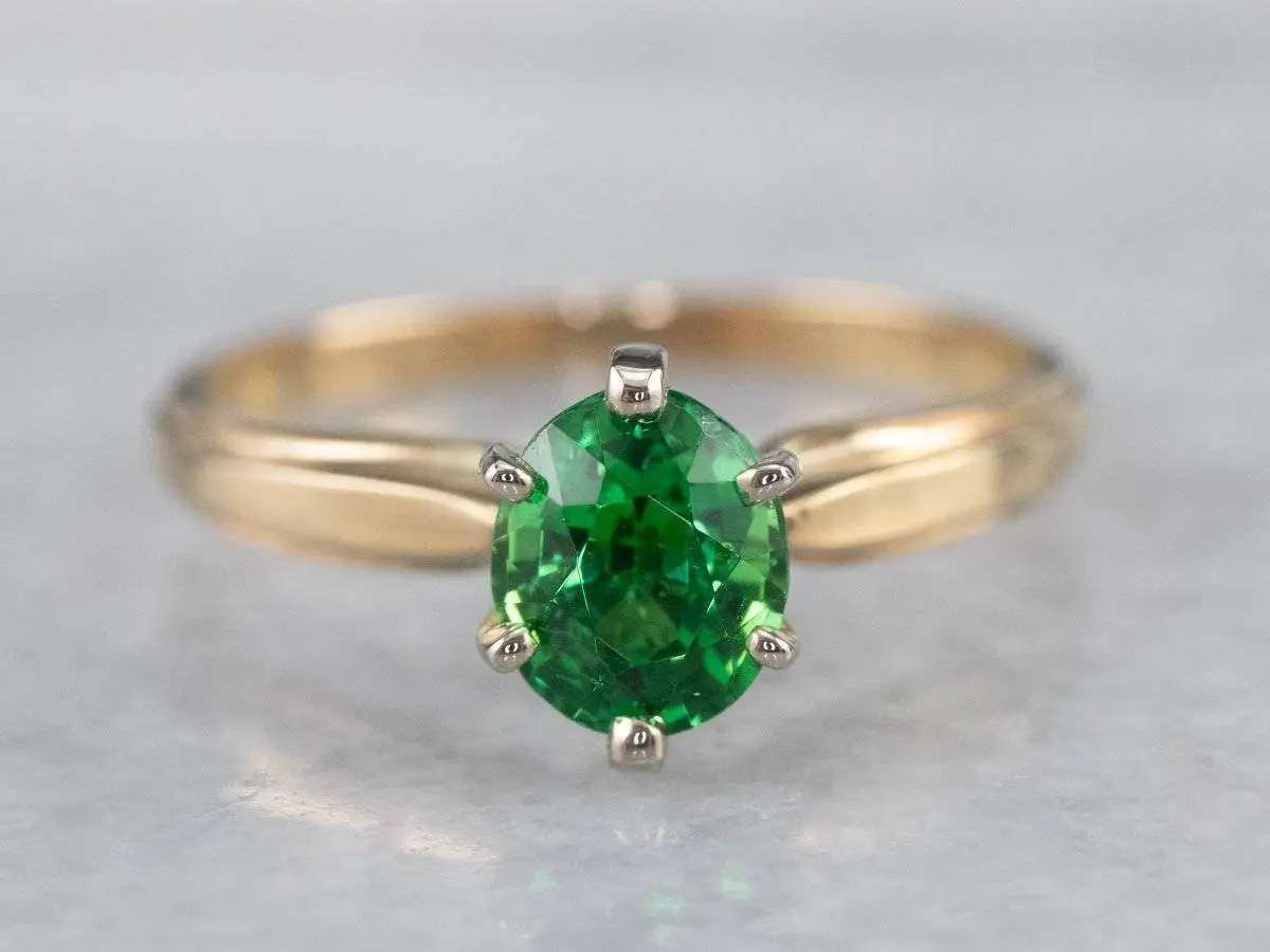 This vintage ring was meant to be an engagement ring and is well suited to the job. One shouldn't be afraid to wear it as an everyday ring, or a stacked with other rings! The simple style lends itself to a variety of ways to wear it, with the centerpiece always remaining the brilliant green stone. We've set this ring with a new, bright green Tsavorite Garnet. Mined in Africa, Tsavorite was named for Tsavo National Park, in Kenya. The green shade is slightly brighter, a little more spring-like than the deep pine green of demantoid garnets. Tsavorite is a harder stone, a good alternative to a more fragile emerald.