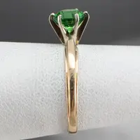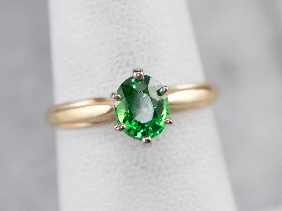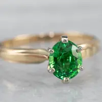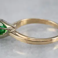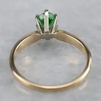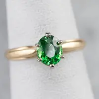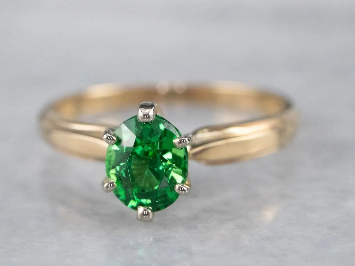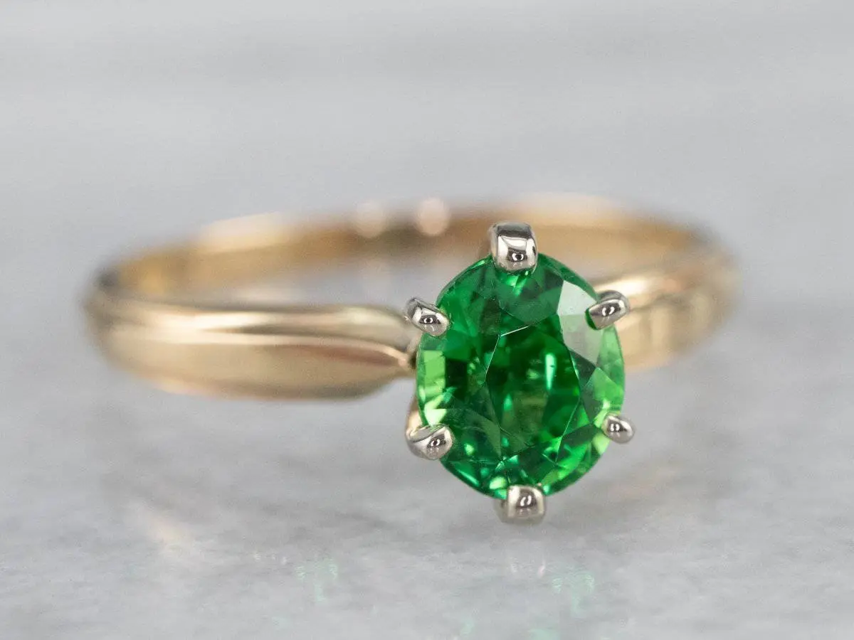 This vintage ring was meant to be an engagement ring and is well suited to the job. One shouldn't be afraid to wear it as an everyday ring, or a stacked with other rings! The simple style lends itself to a variety of ways to wear it, with the centerpiece always remaining the brilliant green stone. We've set this ring with a new, bright green Tsavorite Garnet. Mined in Africa, Tsavorite was named for Tsavo National Park, in Kenya. The green shade is slightly brighter, a little more spring-like than the deep pine green of demantoid garnets. Tsavorite is a harder stone, a good alternative to a more fragile emerald.