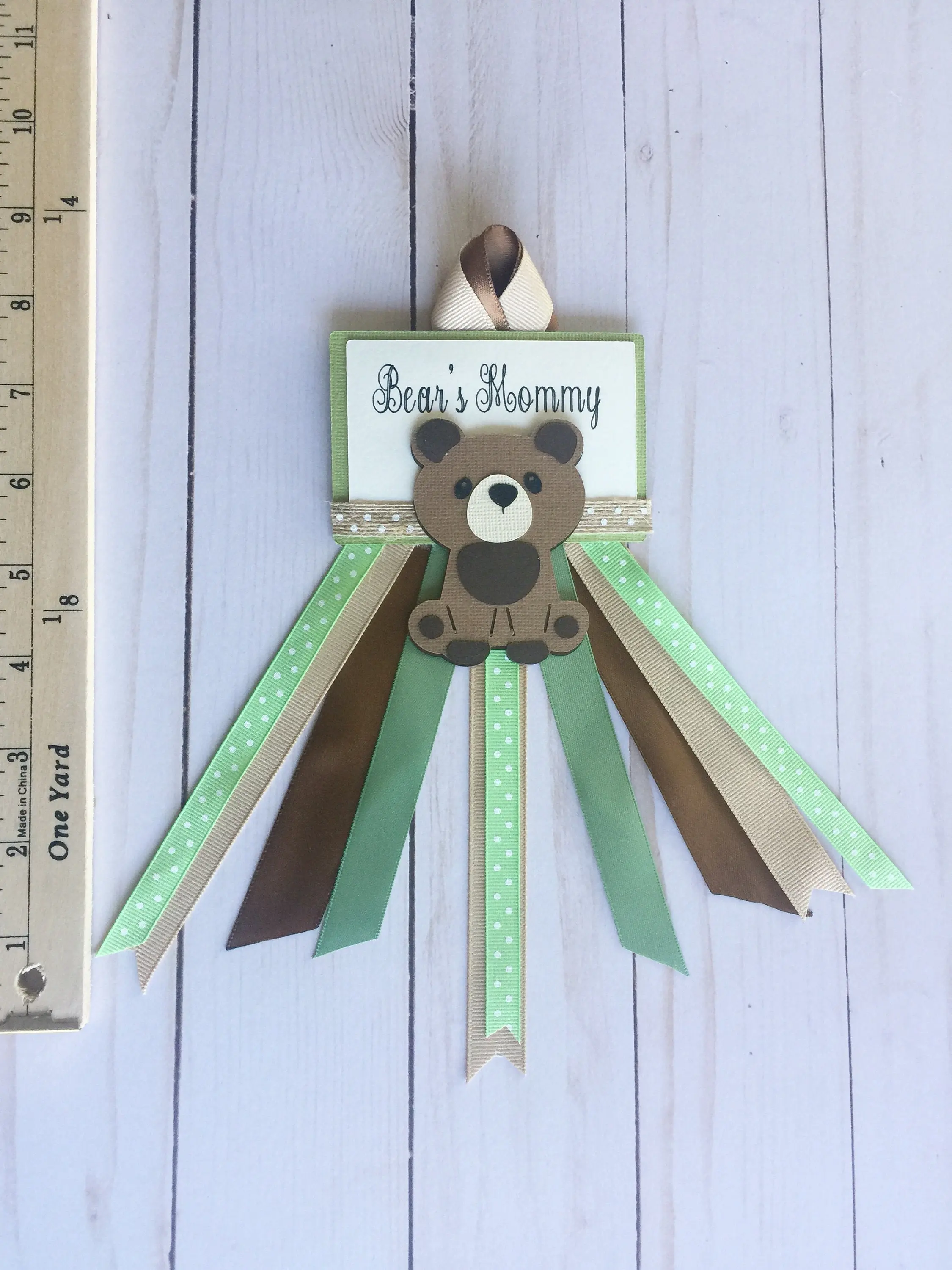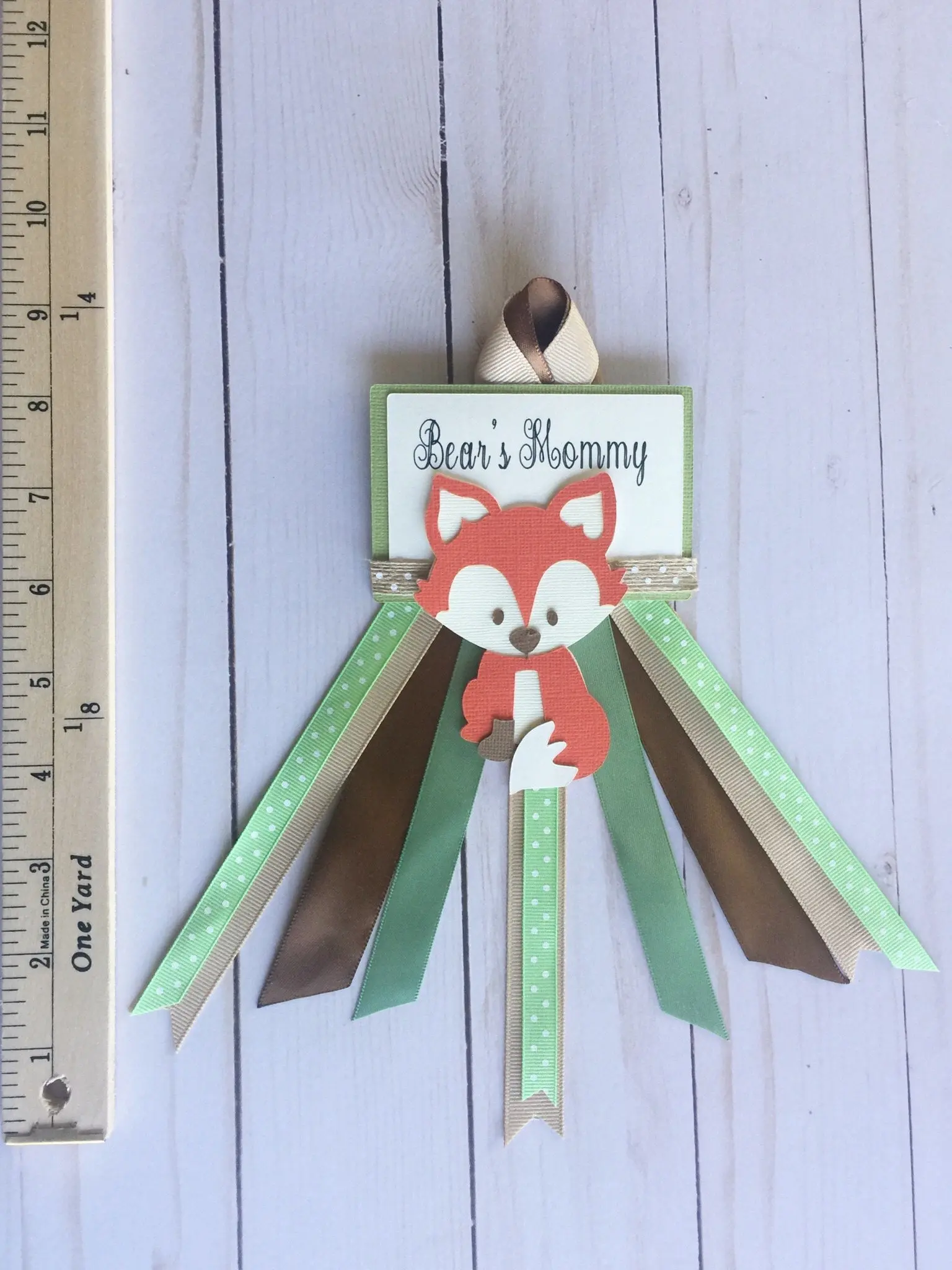 Our adorable woodland mommy to be pin is made of multiple layers of durable quality ribbon. Handmade using lots of detail and care, our pins are made to last! Measures approx 10" Long.