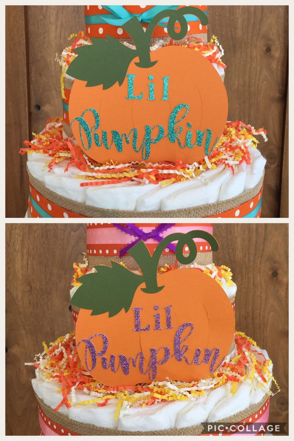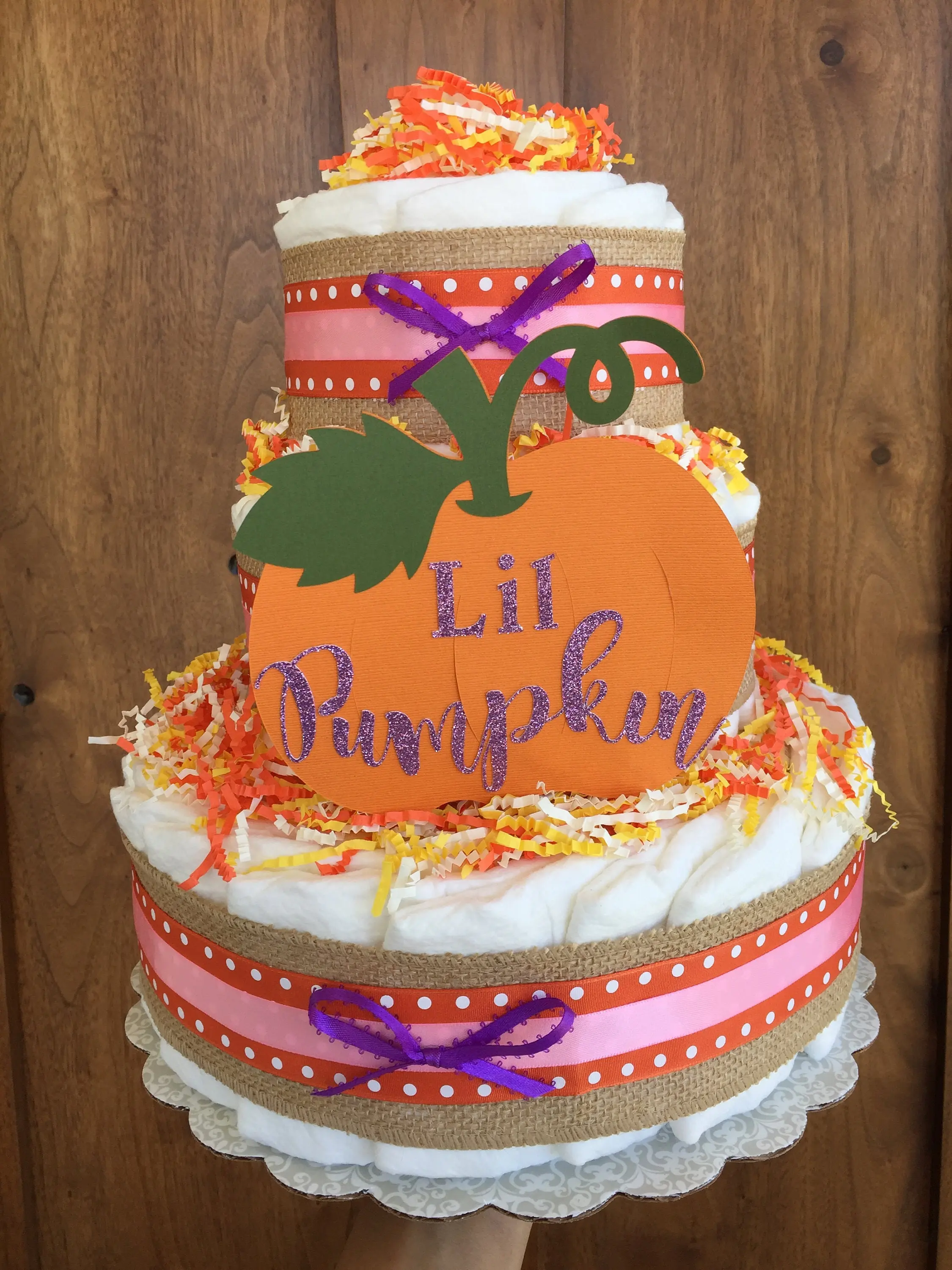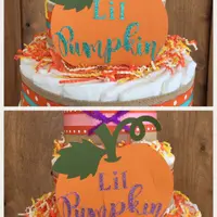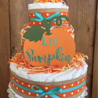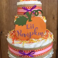 60-65 Quality Baby Diapers size 1 for babies 8-10lbs. ribbons as shown or choose your own colors. Hand crafted lil pumpkin sign made of durable cardstock, fall color paper shreds. Cake round. Wrapped in clear cello to maintain freshness of cake.