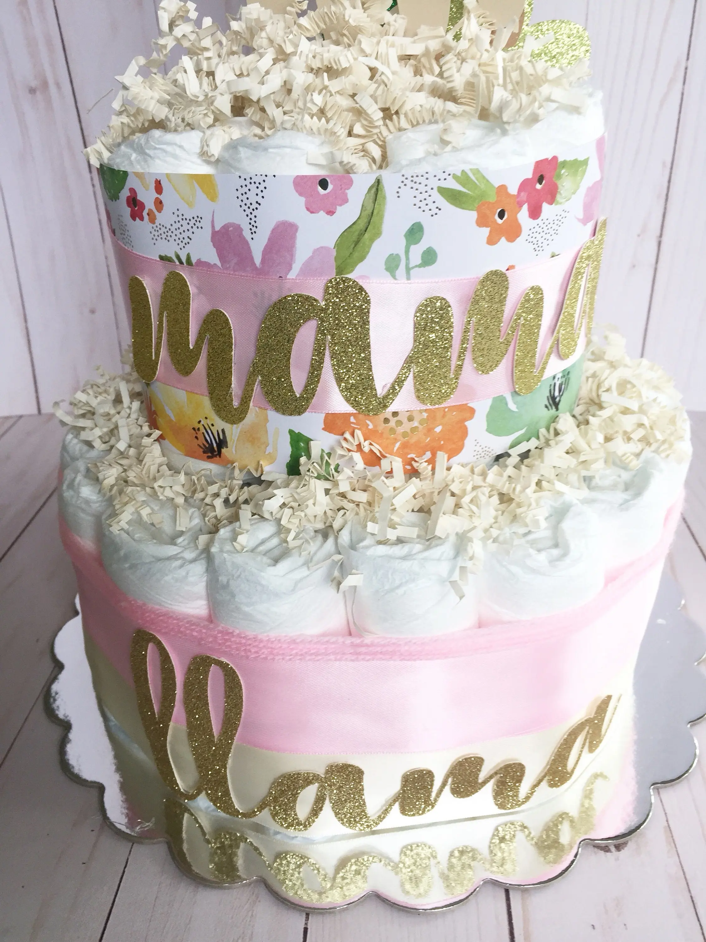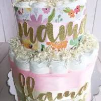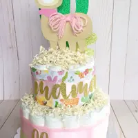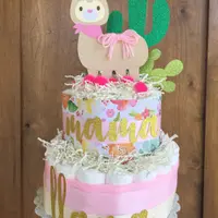 50 Quality Diapers size 1, all decorations as shown. We can modify the colors on the diaper cake, all of the toppers are hand crafted by me made with durable cardstock paper. Words on cake read Mama Llama. Pom poms, yarn, and satin ribbons. Diaper Cake sits on a 12” cake round.