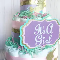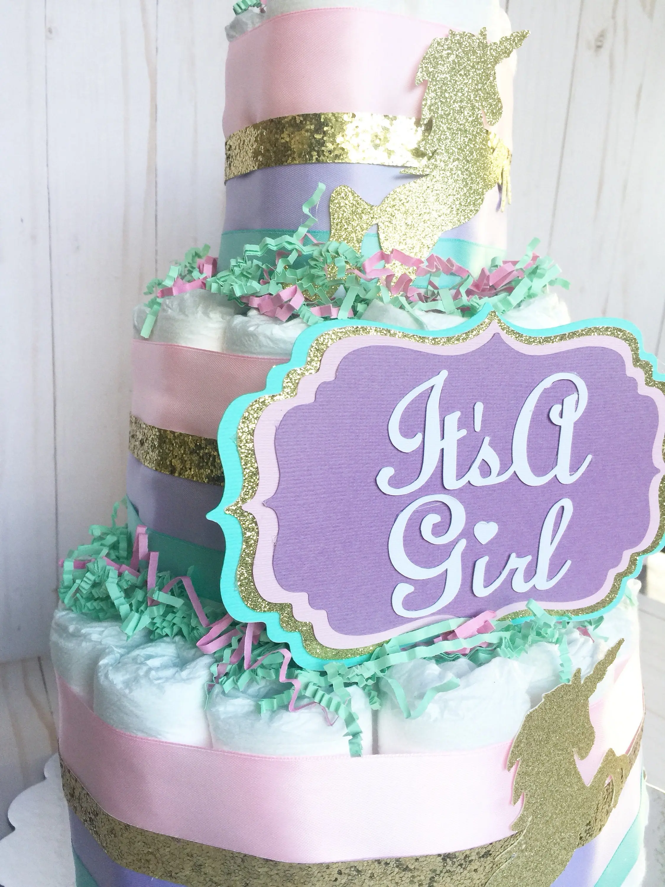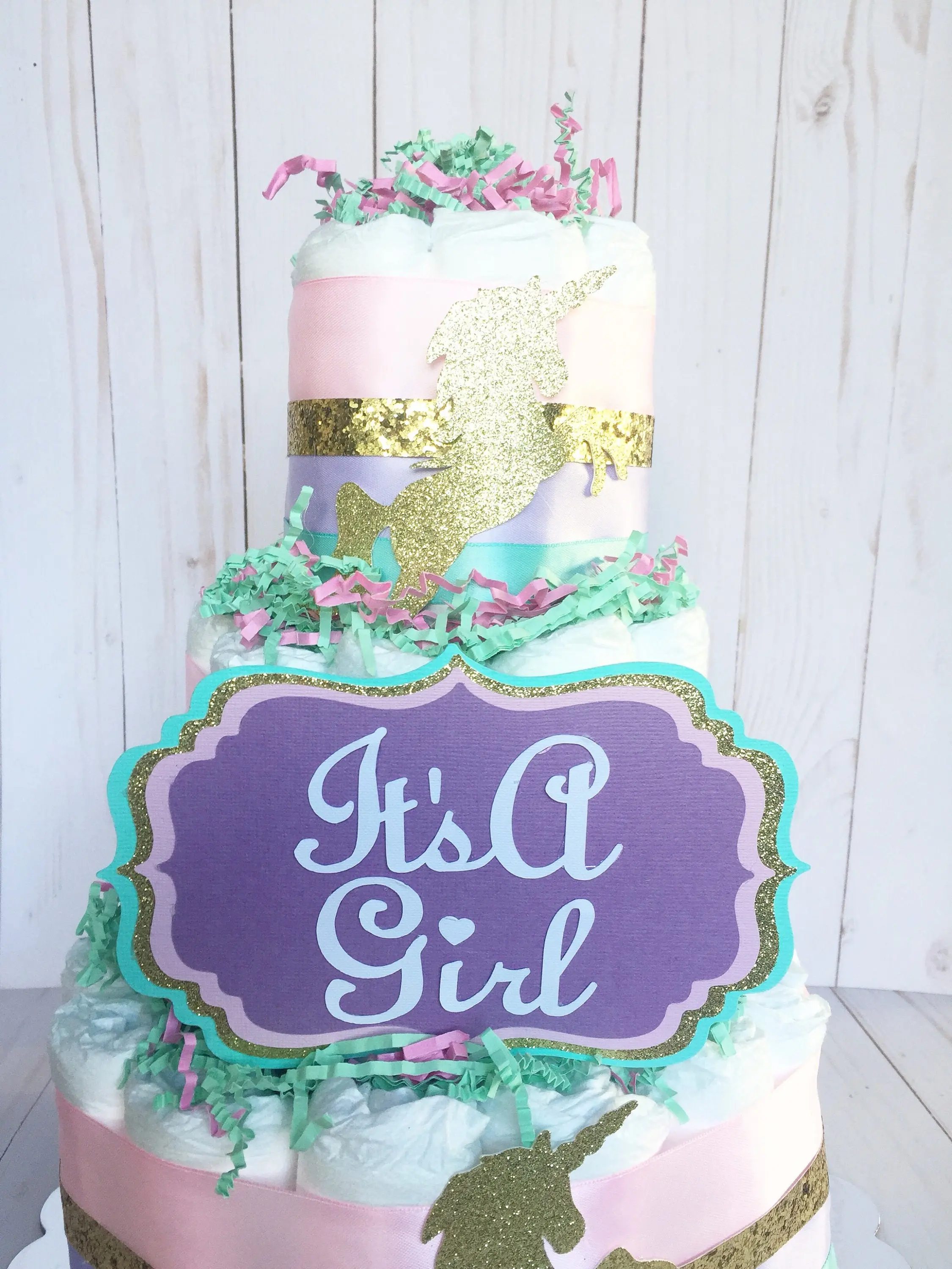This listing is for a 3 Layer Diaper Cake made with 60 Quality Diapers Size 1, High end ribbons as shown, 1 hand crafted sign and can be personalized, glitter gold unicorn Cutouts, and paper shreds. Diaper Cake sits on a 12” Cake round and Measures approx 13” tall.