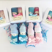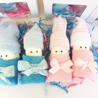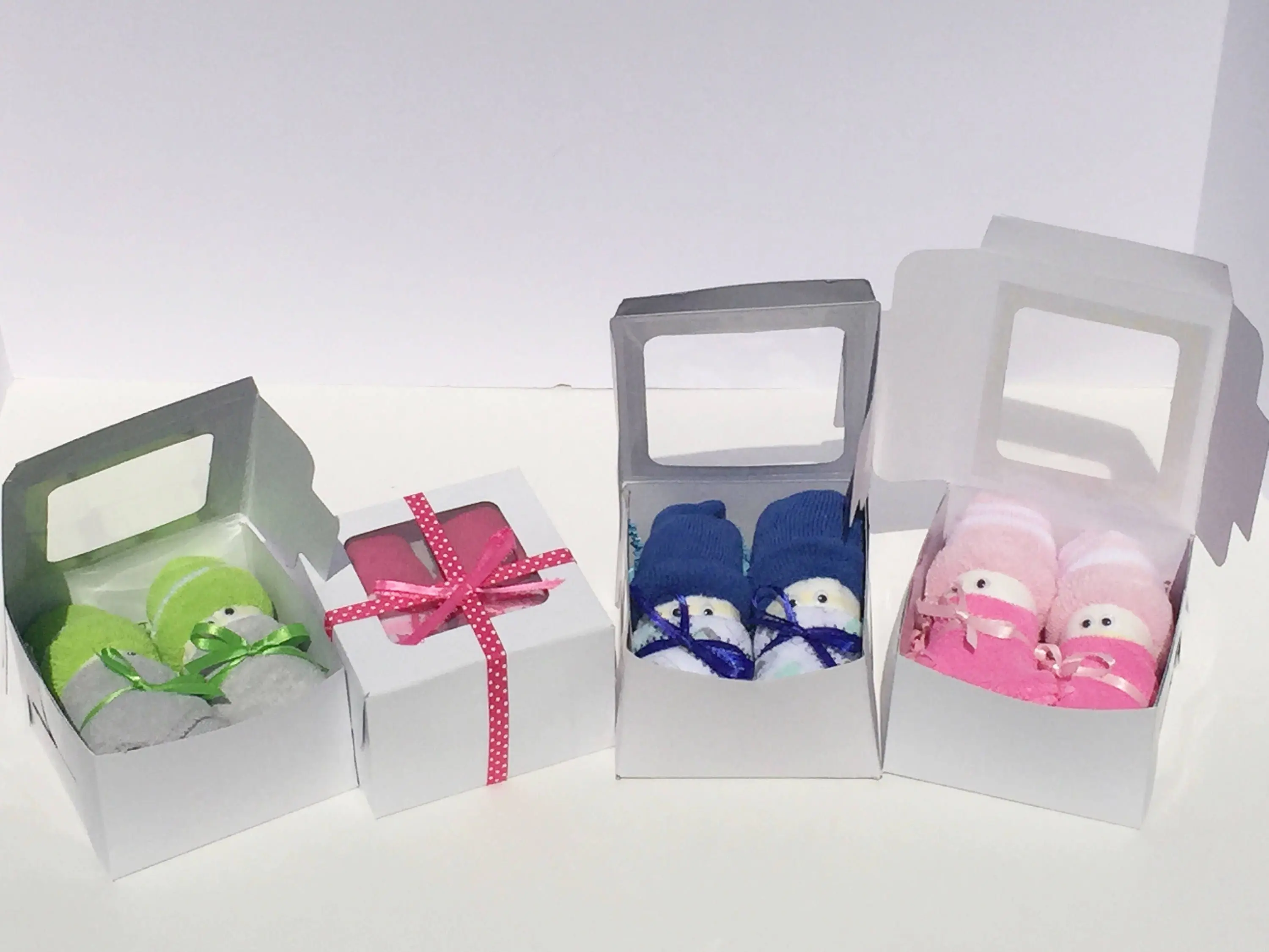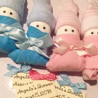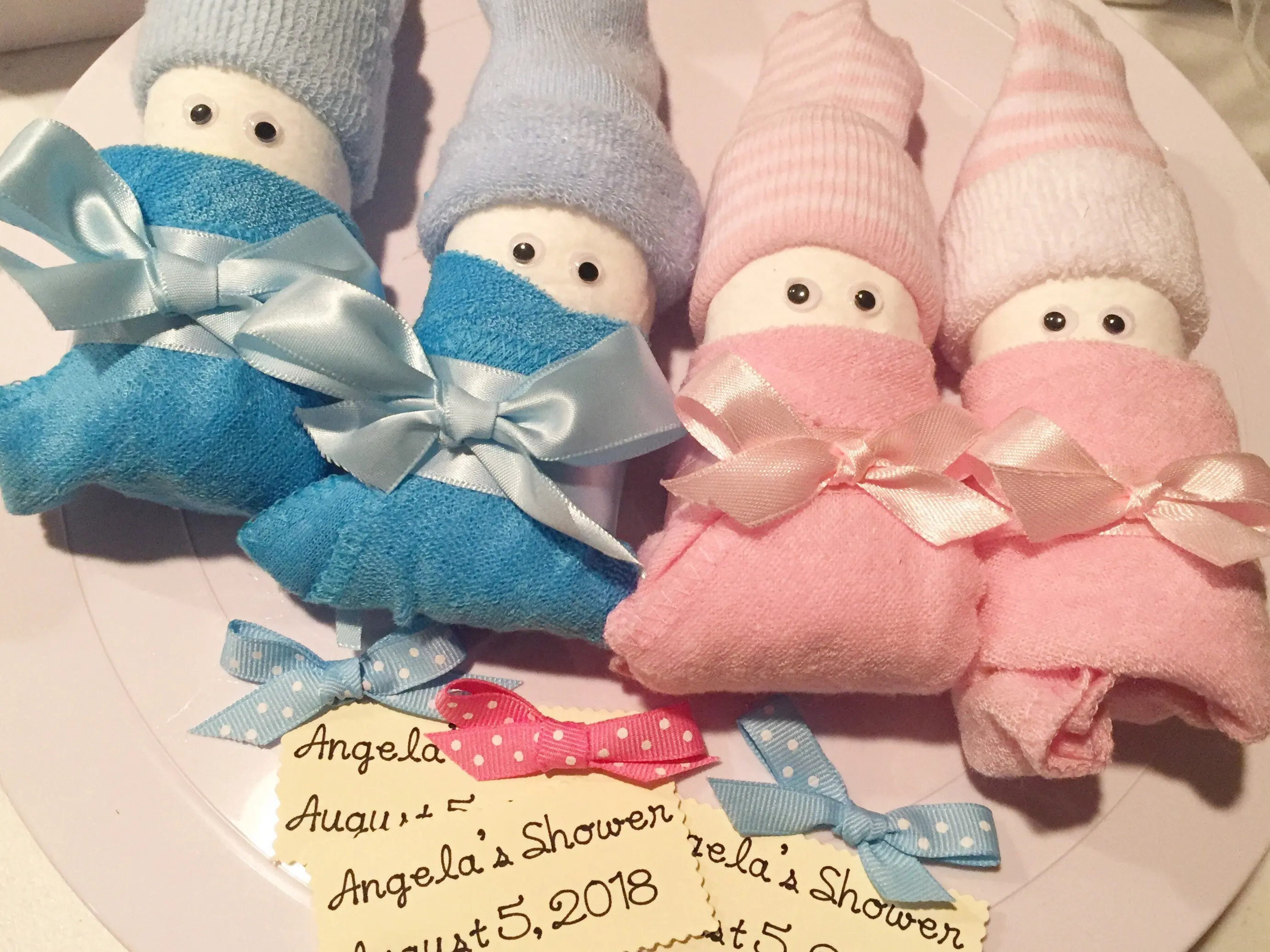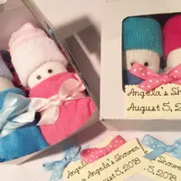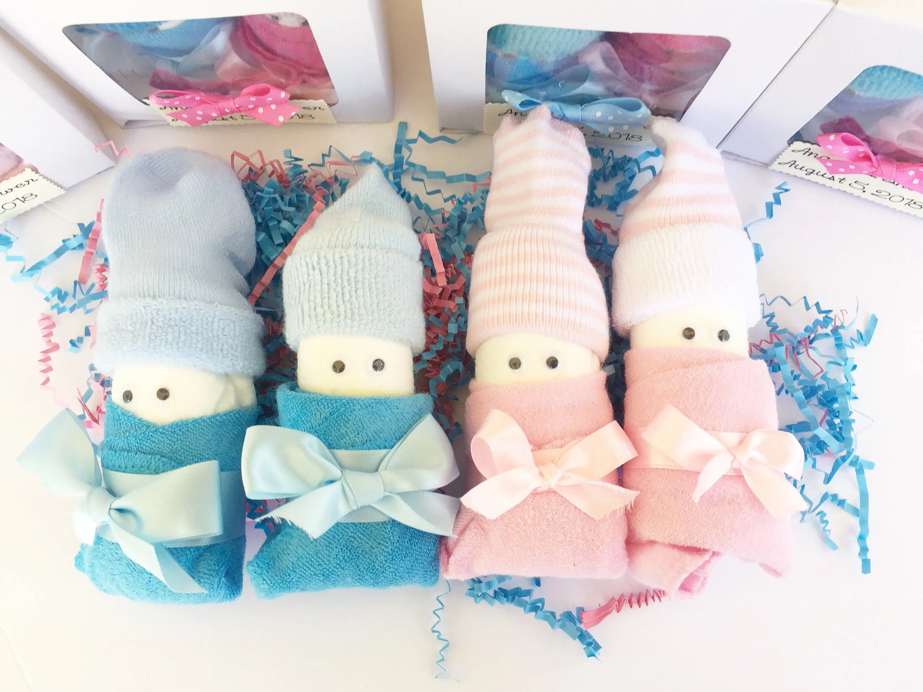 This listing is for 1 Pair of diaper Babies. Each gift box comes with 2 diaper Babies. They are made up of 2 diapers and 1 pair of baby socks sitting on top of each rolled diaper to resemble an infant cap. Googlie eyes are attached with non toxic adhesive to resemble little eyes. 2 washcloths are made to look like little Receiving blankets wrapped around each diaper baby. We place decorative paper shreds under the babies to ensure their safe delivery. Coordinating gift bow is attached to each cupcake box with a hand crafted gift tag.