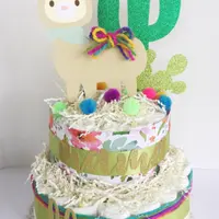 Our llama cactus inspired diaper cake will make a lovely centerpiece at your shower event. We add lots of different elements on our llama diaper cake! There are handcrafted decorations, pom poms, colorful yarn, and words on cake are made with durable glitter cardstock.