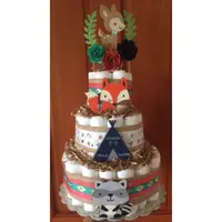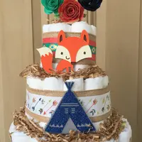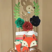 A 3 layer Diaper Cake made with 60 Quality size 1 Diapers all 100% ready for baby! NO glue, tape or pins on diapers. Burlap and Aztec tribal ribbons compete with Aztec tribal designs as shown in picture. (I can modify color scheme of cake for you) Hand crafted woodland animals as shown. Absolutely gorgeous woodland deer cake topper trimmed with a laurel wreath and flowers made of durable cardstock. A handcrafted teepee made with durable glitter cardstock.