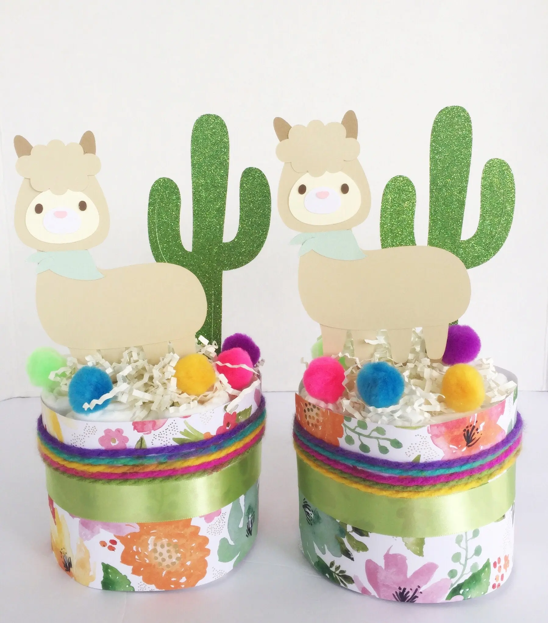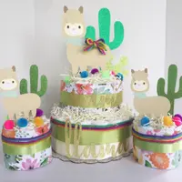 Our llama cactus inspired diaper cake will make a lovely centerpiece at your shower event. We add lots of different elements on our llama diaper cake! There are handcrafted decorations, pom poms, colorful yarn, and words on cake are made with durable glitter cardstock.