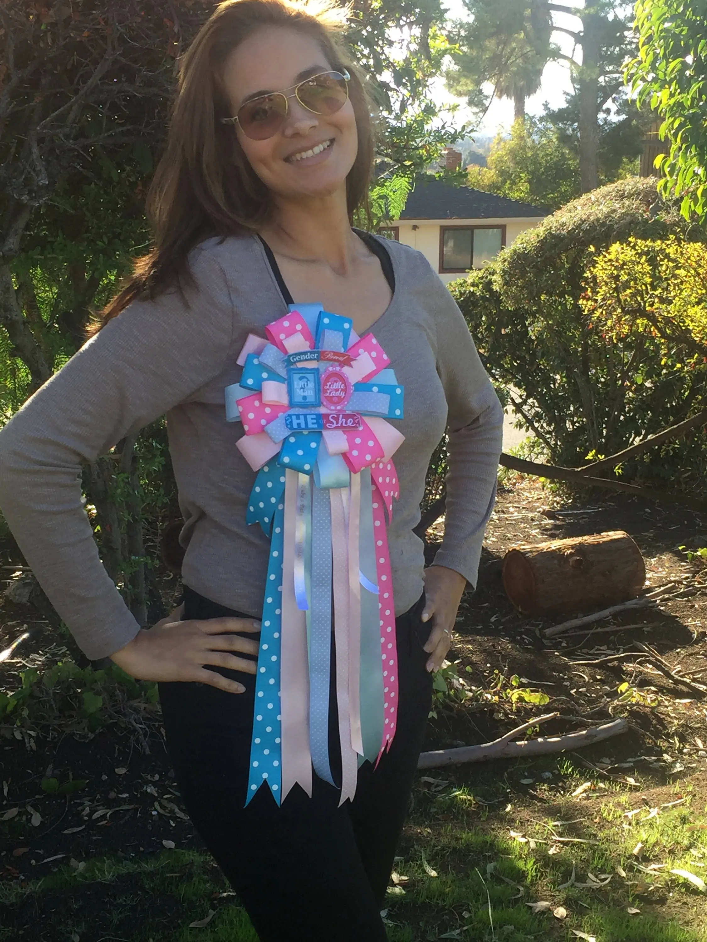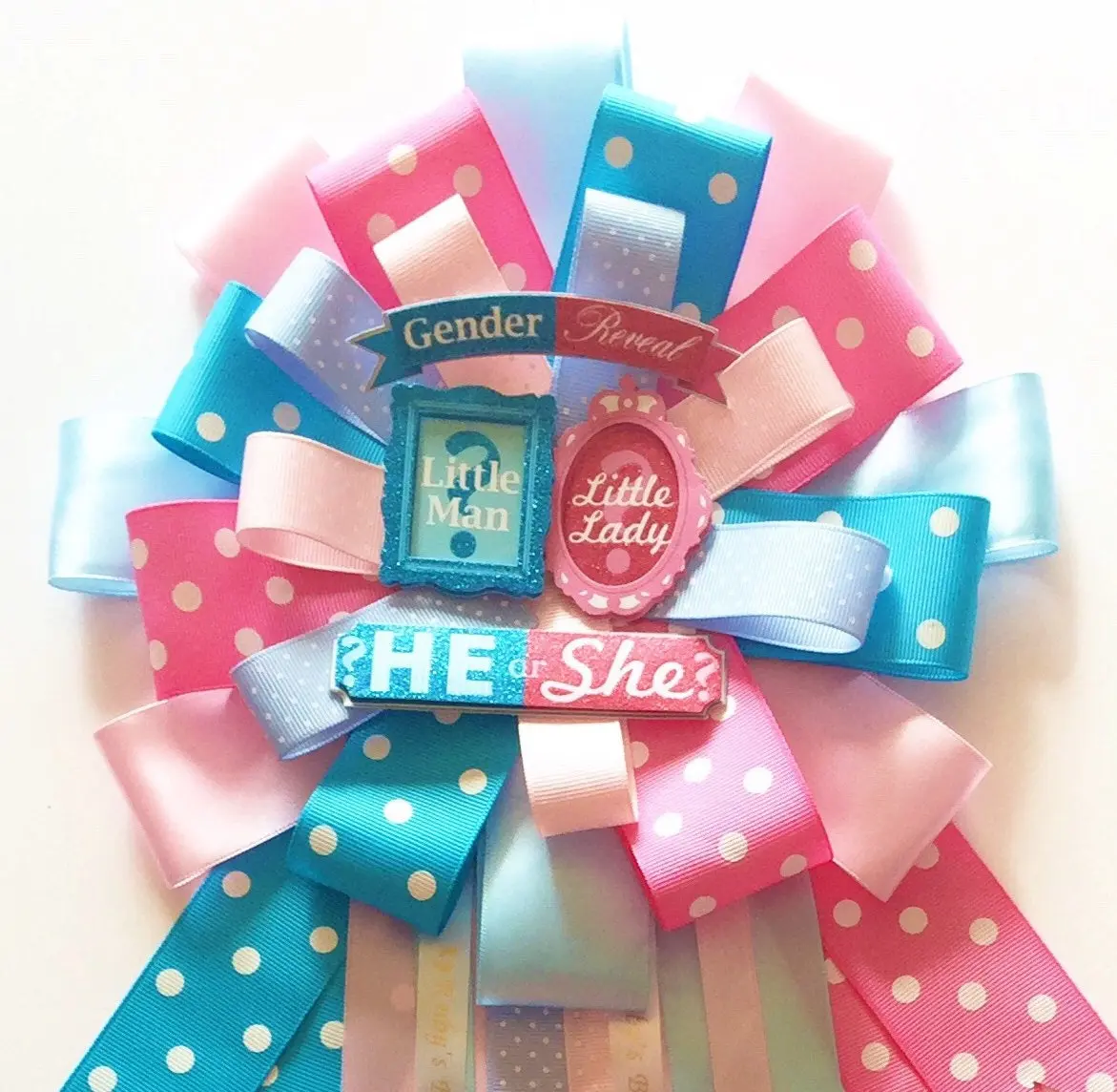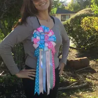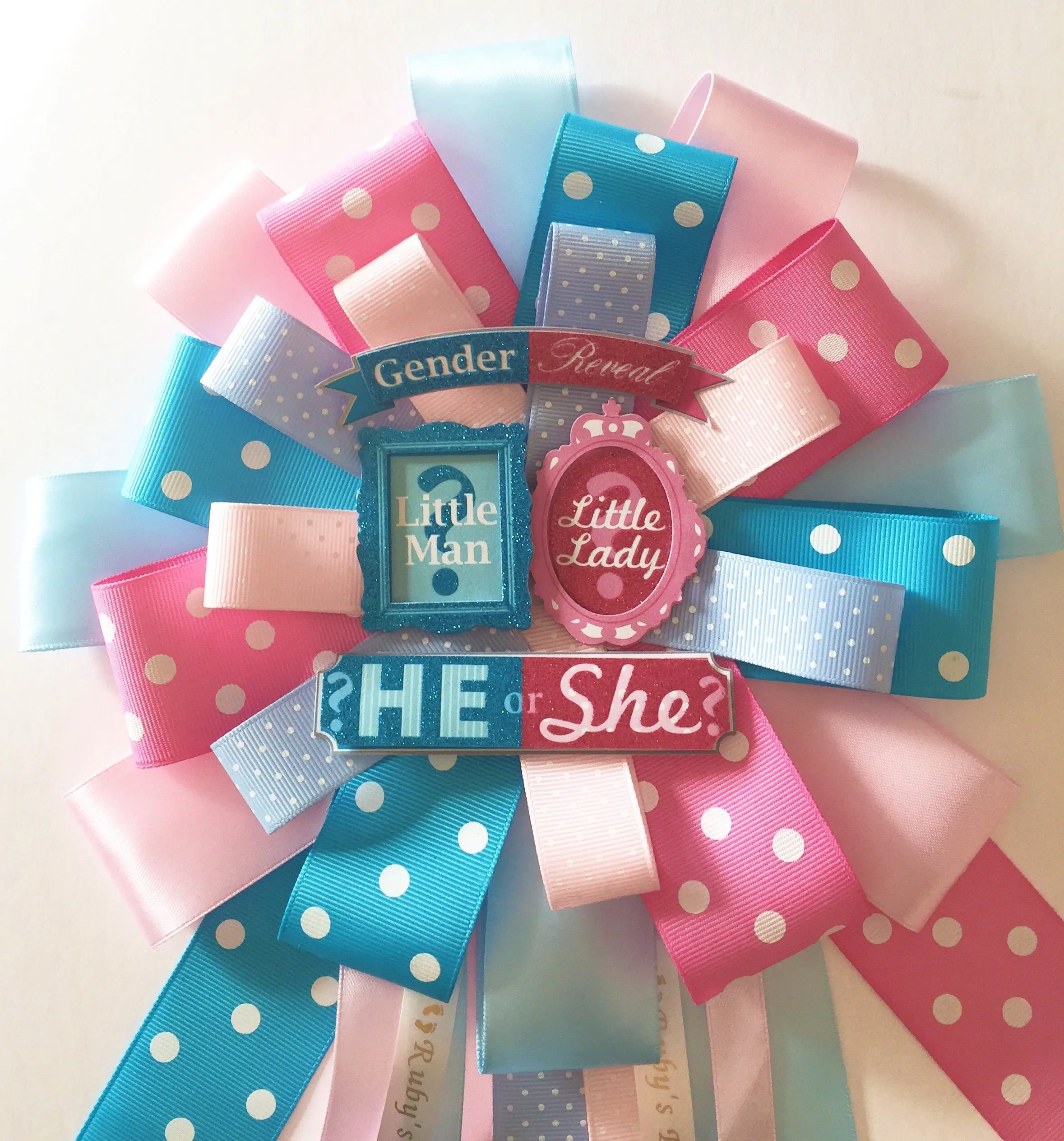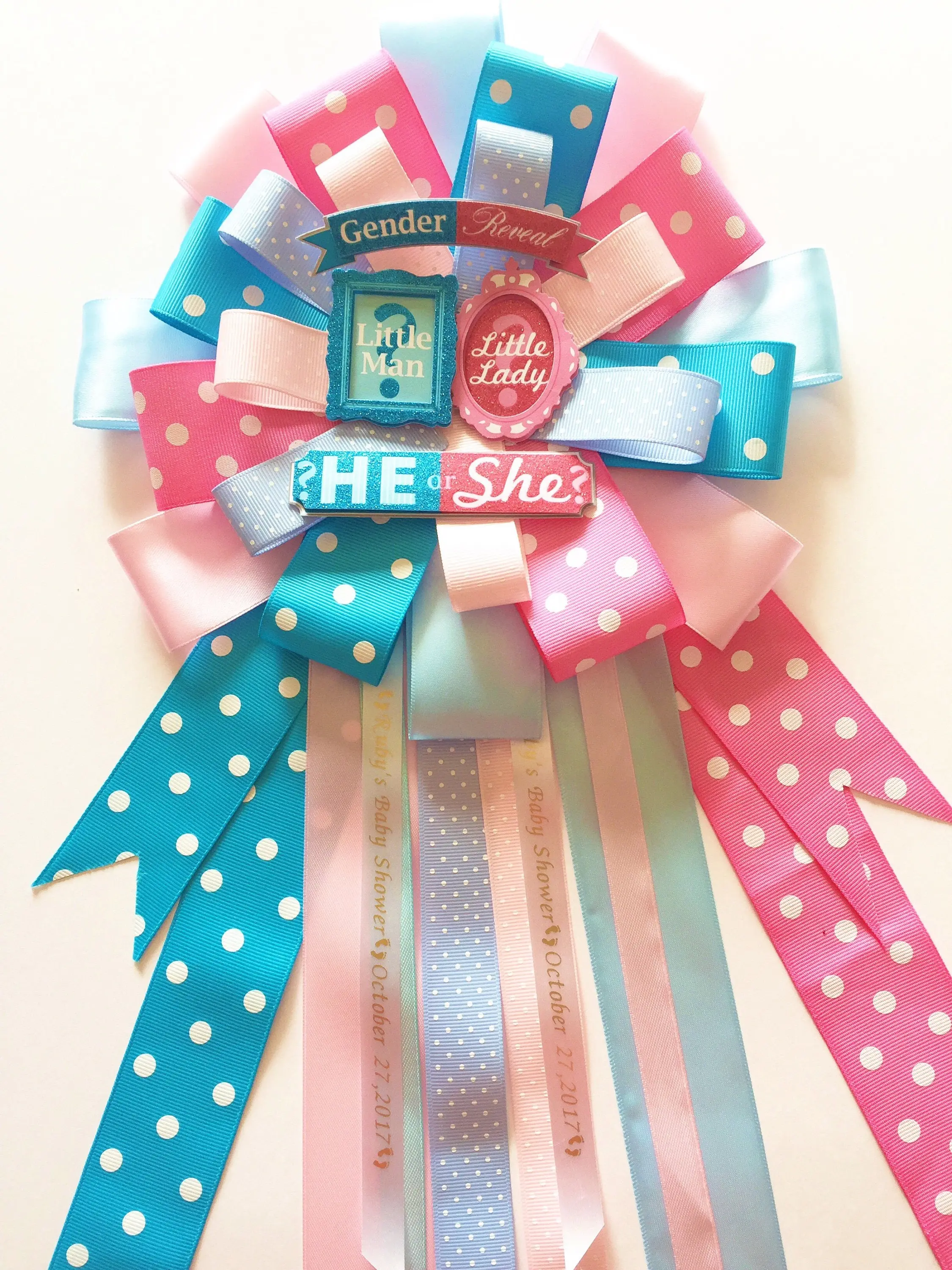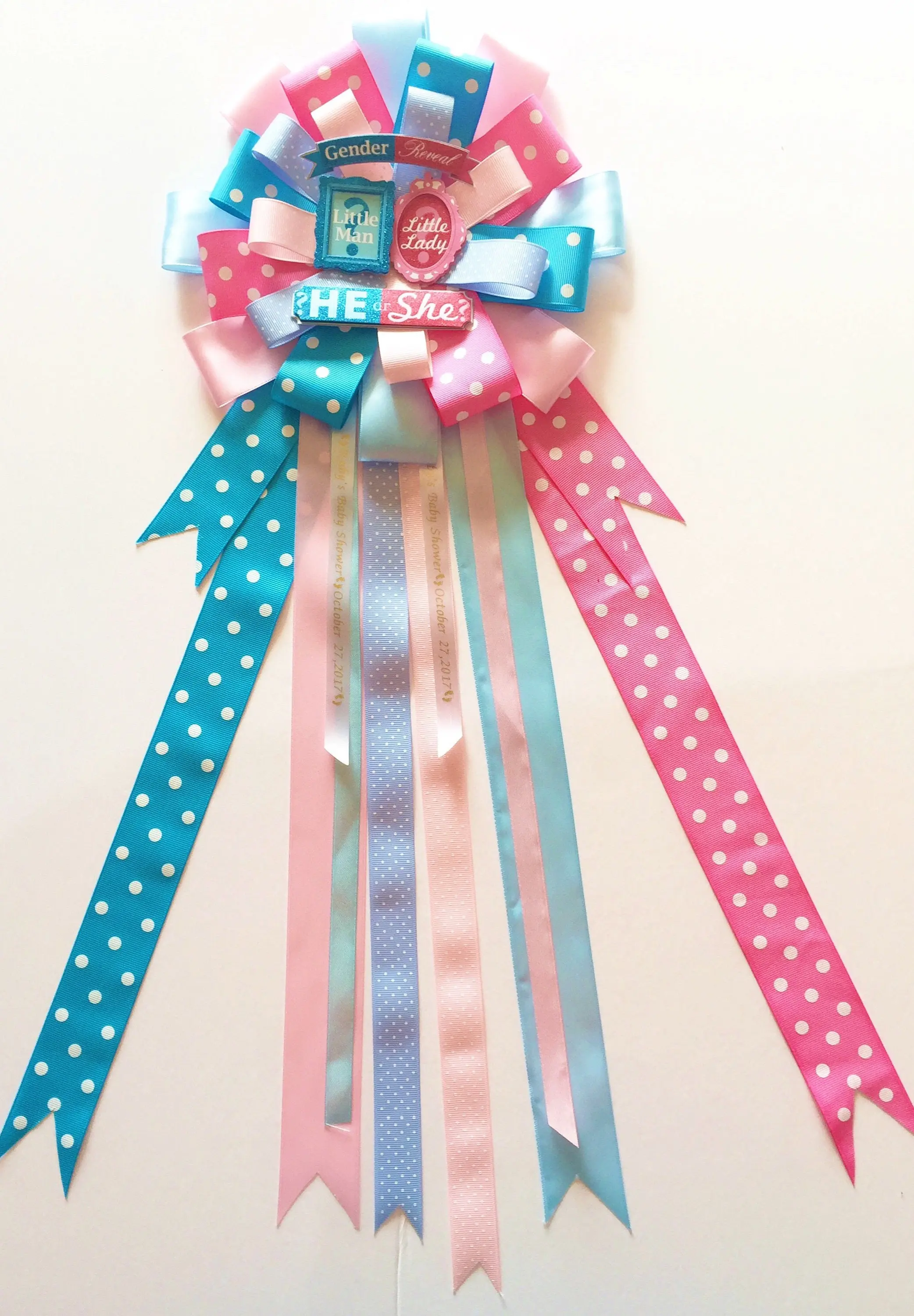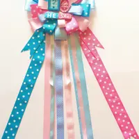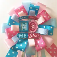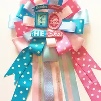 Our Gender Reveal Baby Shower Corsage measures 18-20” inches long from top to bottom. The top part of ribbon measures 9”wide. Made with several shades of blues and pinks this Corsage will look amazing on Mom to be! Also included as shown gender reveal embellishments.