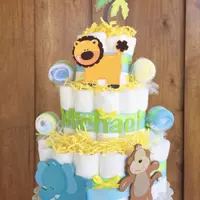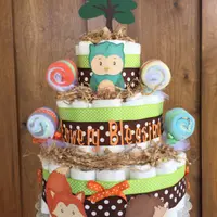 Woodland and jungle diaper Cake sits on a 12” cake circle measuring 16” tall.