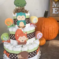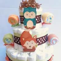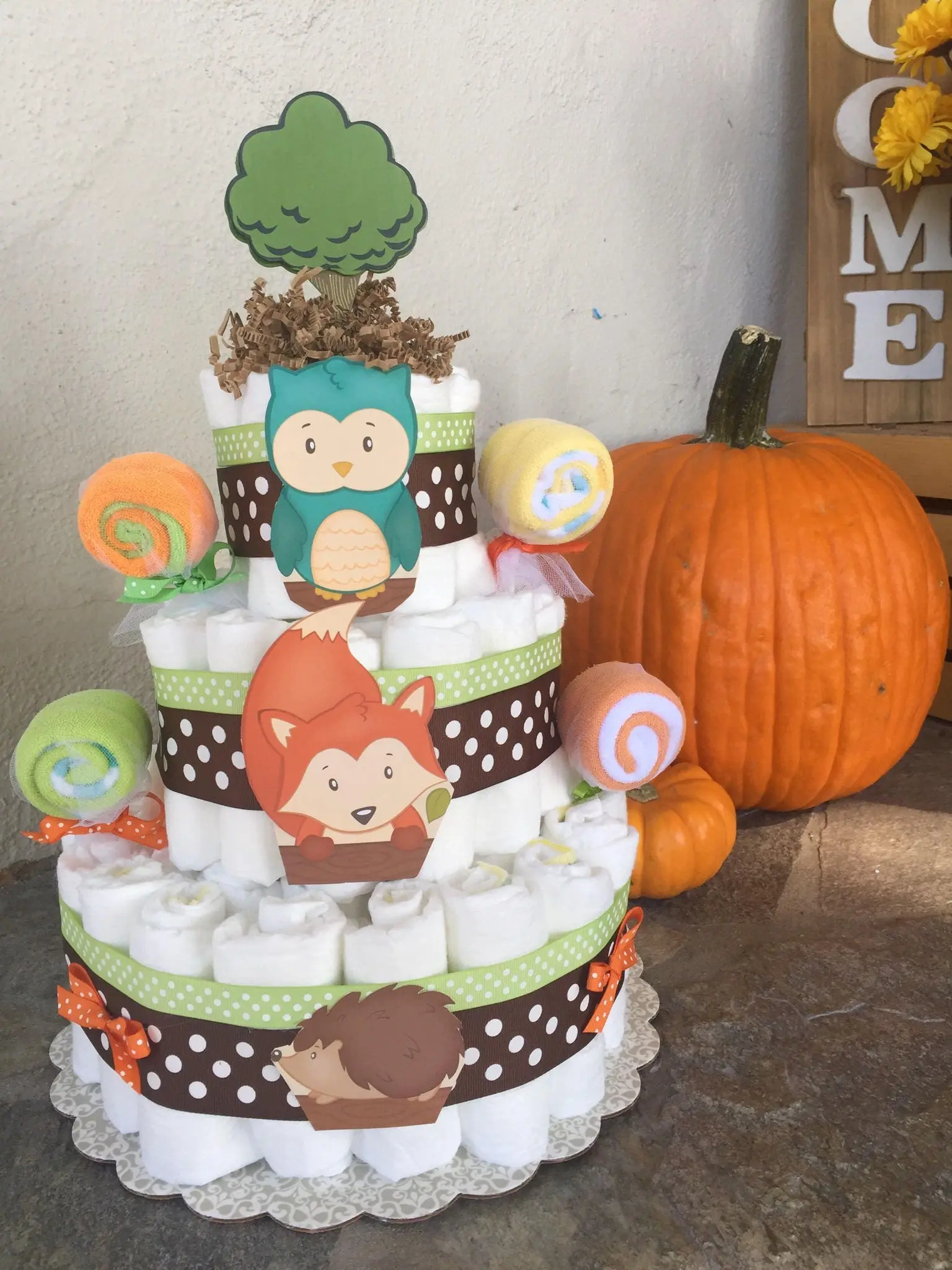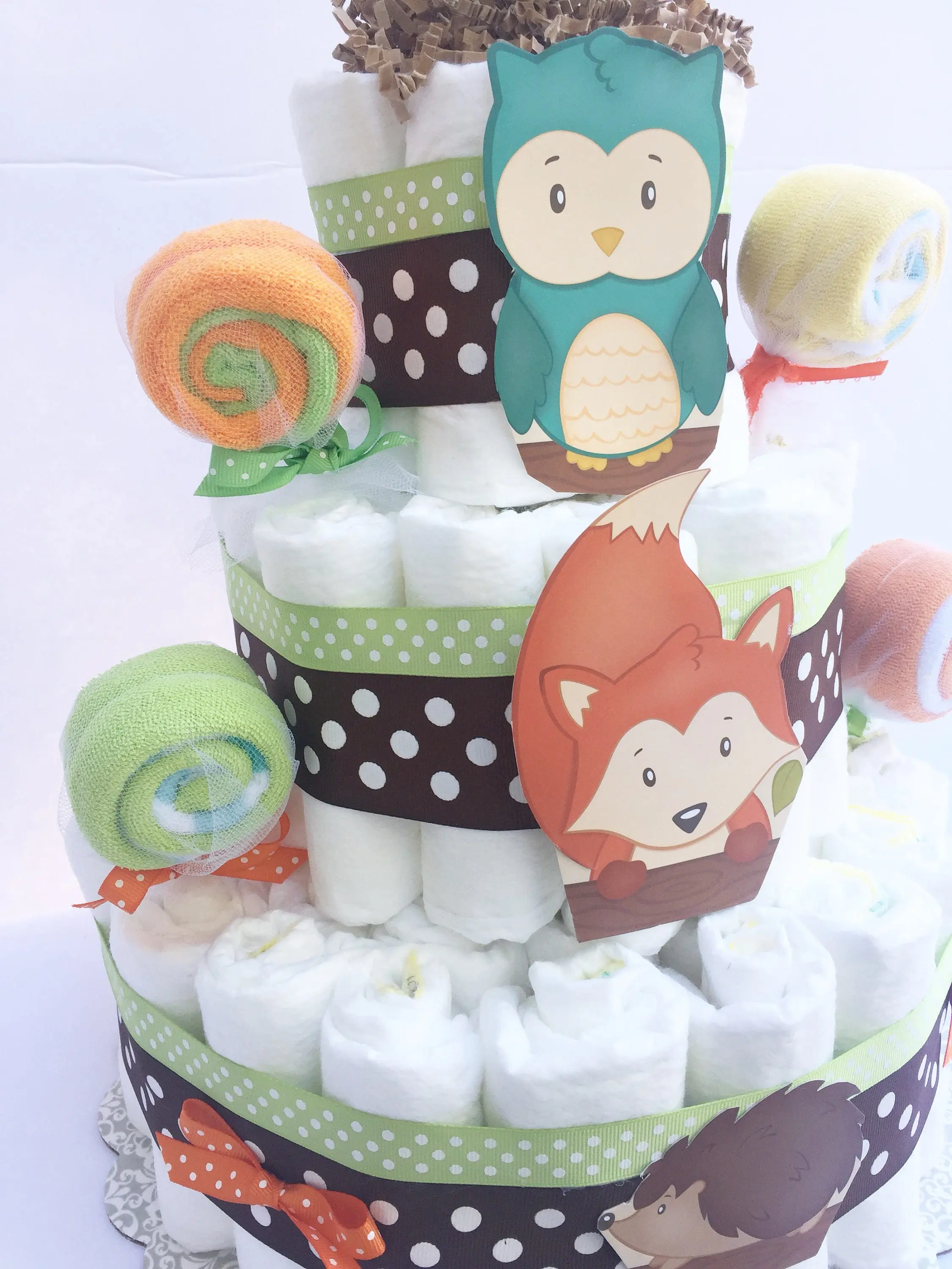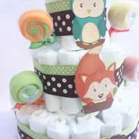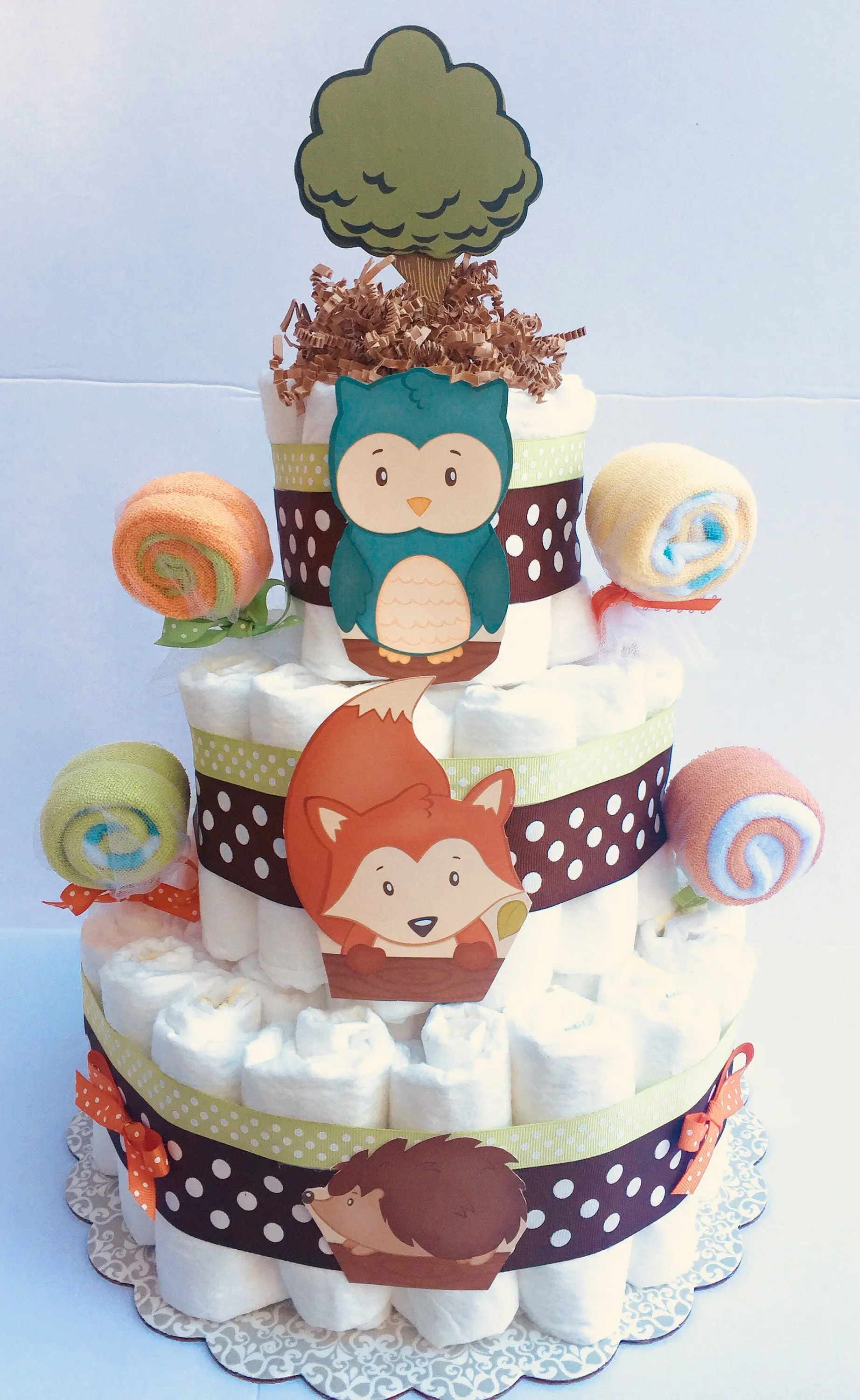 Looking for a cute centerpiece for your baby shower? Look no further, our 3 Layer Woodland Diaper Cake will make a great gift and table centerpiece. On the sides of the diaper cake come 4 washcloth lollipops that look as cute as can be!