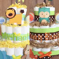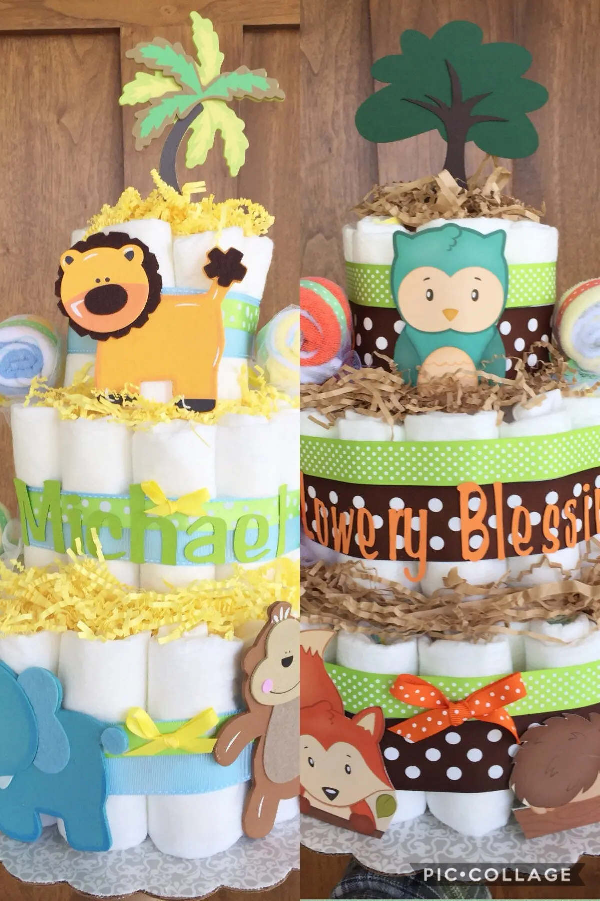Included: 60 Quality Diapers size 1, Woodland Character embellishments or Jungle Wood cutouts as shown, Woodland Tree topper