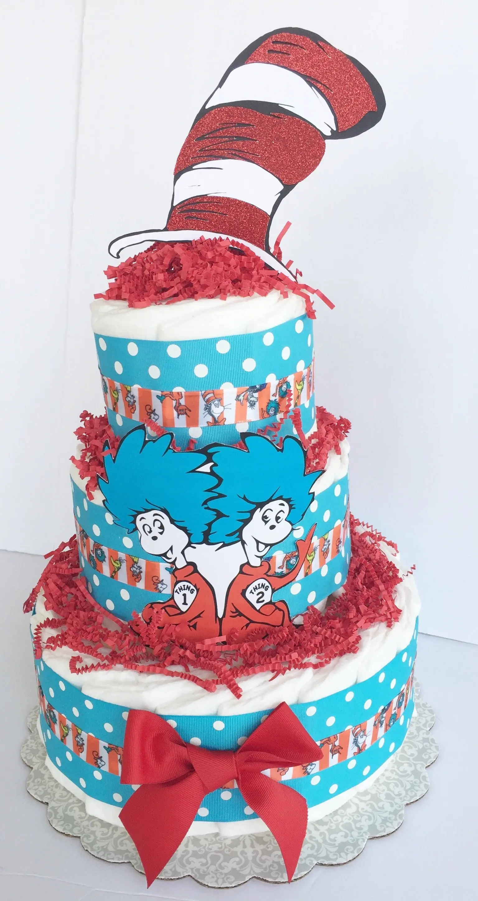 Diaper Cake sits on a 12” cake round