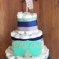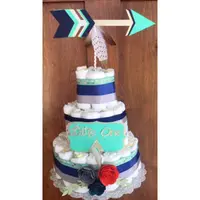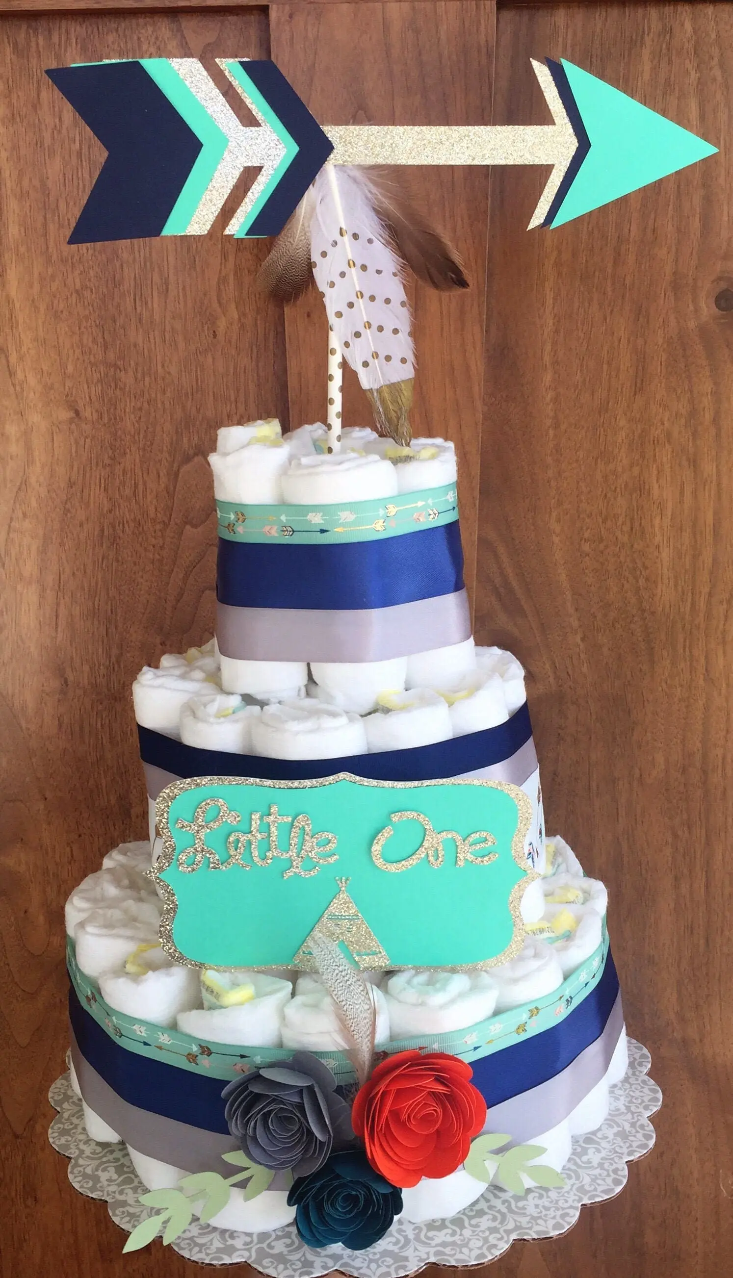 Our Tribal diaper Cake will make a great addition to your shower event! Made with lots of detail with ribbons and flowers. With an Arrow Cake topper!