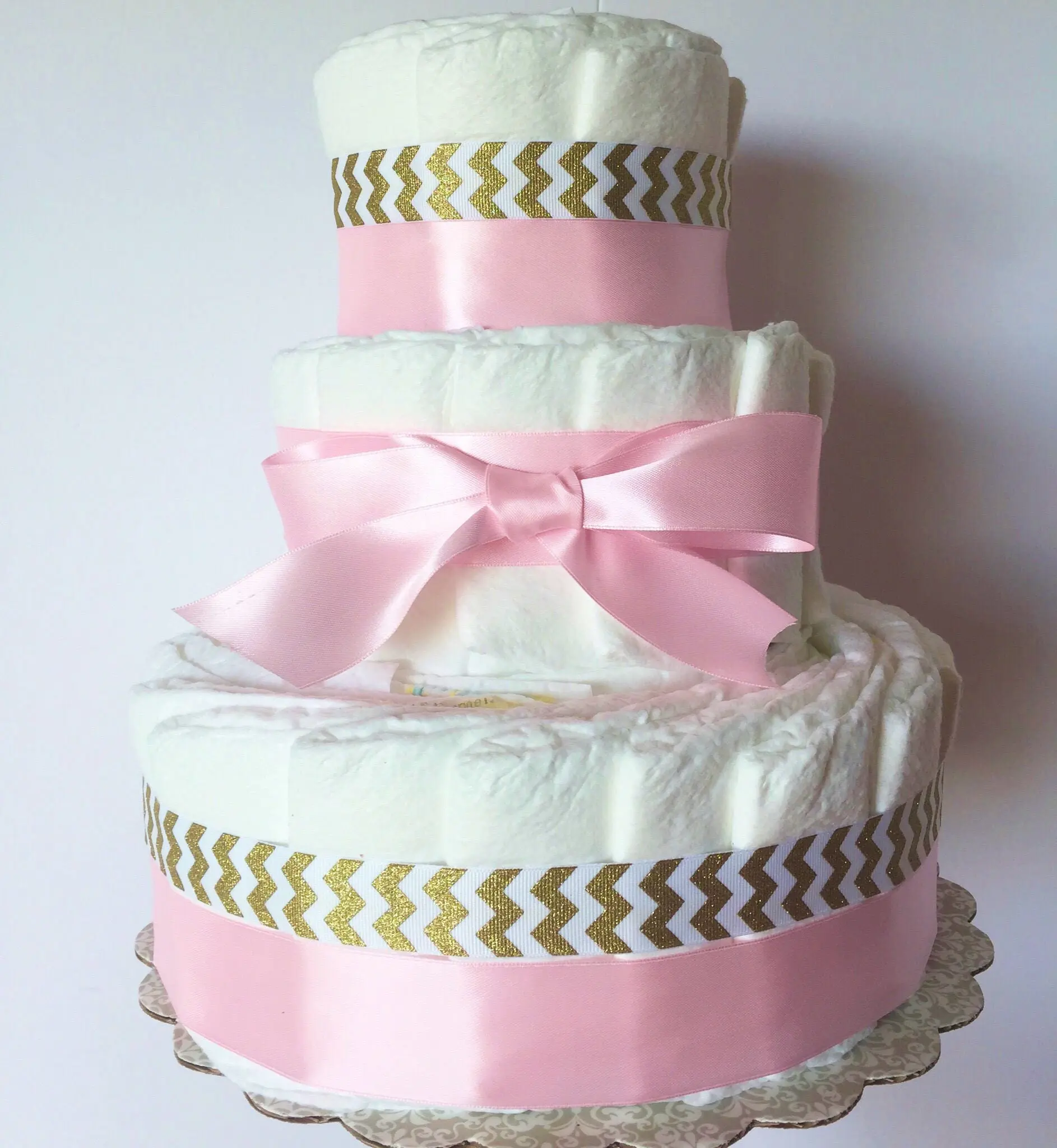 Looking for a great baby shower gift? Our girl pink and gold chevron diaper cake will make a beautiful centerpiece and baby shower gift!