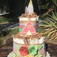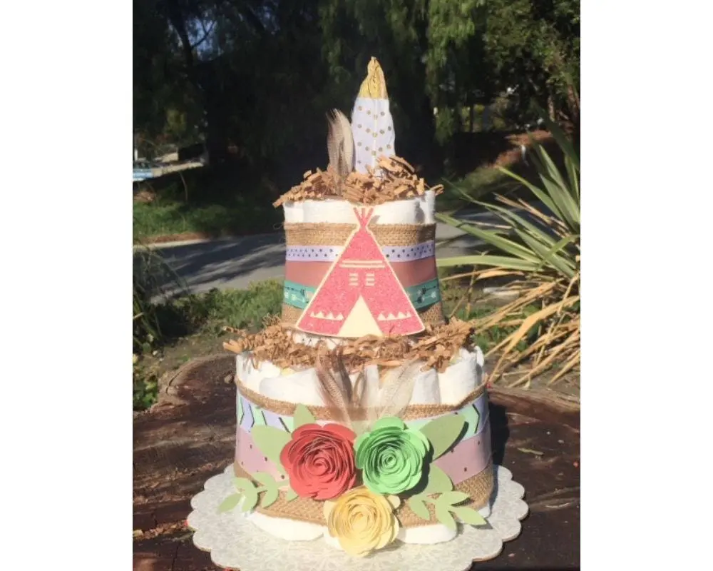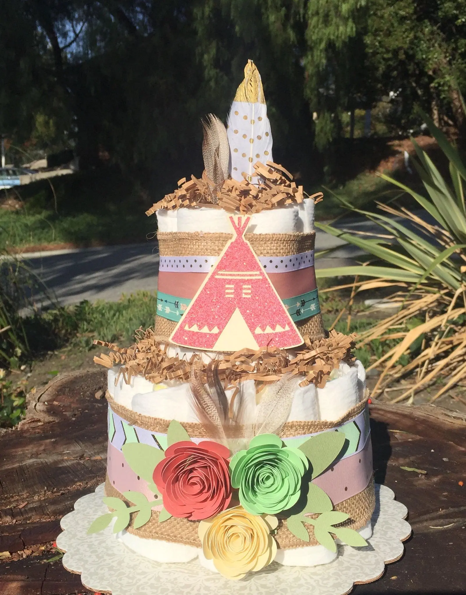Our elegant Boho Diaper Cake comes with lots of detail. This diaper cake will go perfect with a tribal theme baby shower.